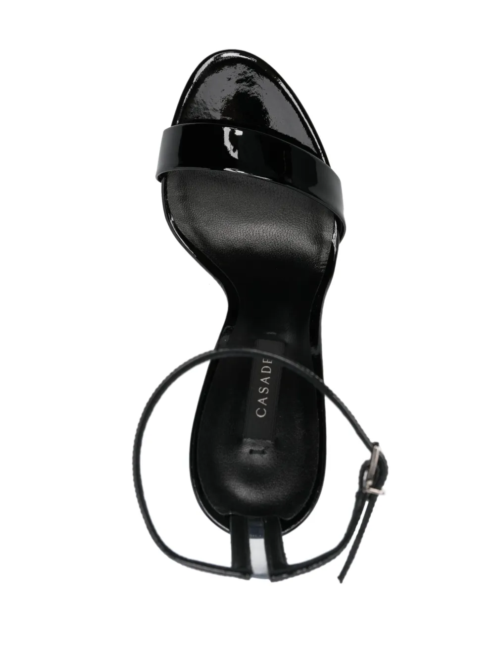 Черный, телячья кожа, лакированная отделка, знаковый каблук Blade, ремешок на палец, открытый носок, ремешок на щиколотке с пряжкой, стелька с логотипом, каблук-шпилька и кожаная подошва.