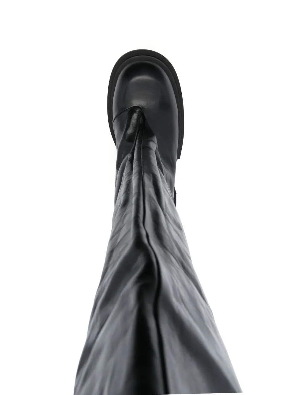 Черный, телячья кожа, расклешенный крой, закругленный носок, длина до бедер, модель без застежки, плоская платформа и блочный каблук средней высоты.