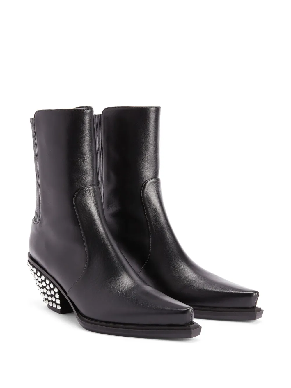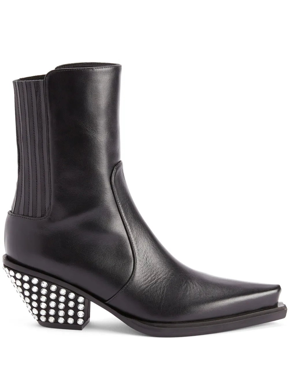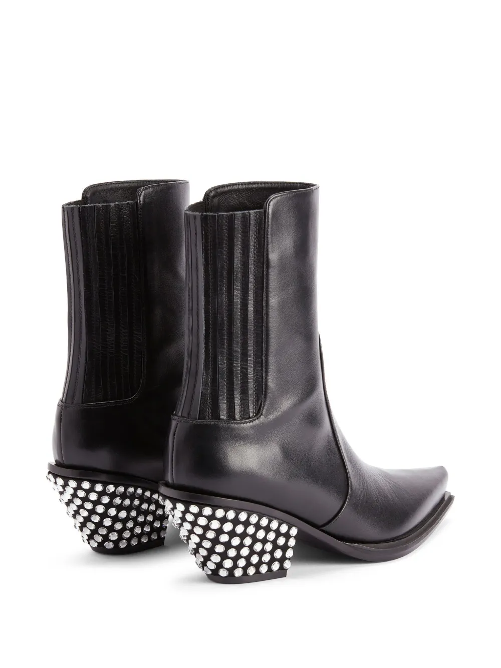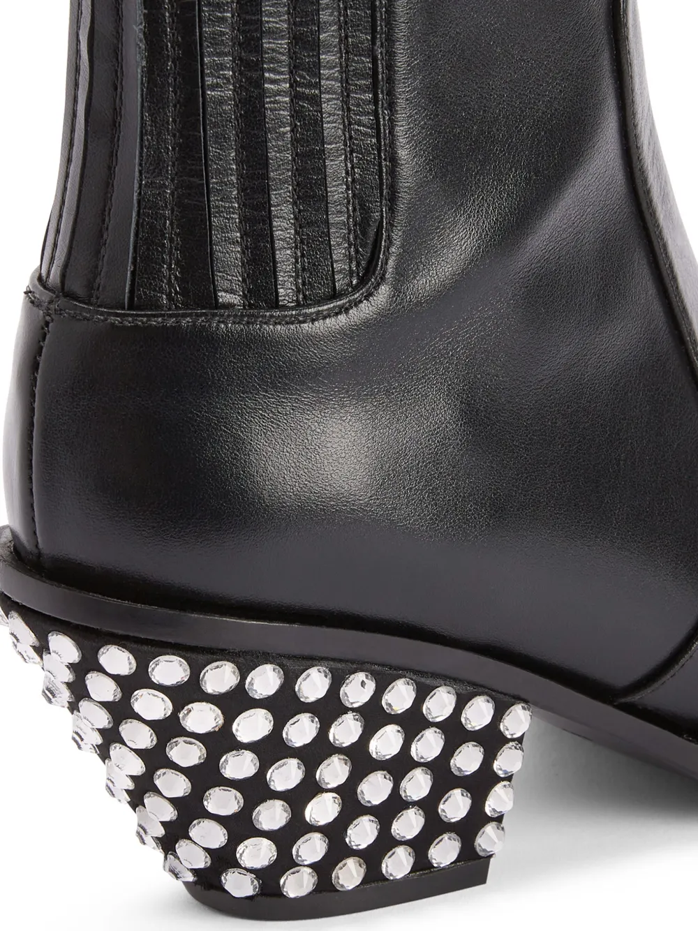 Черный, телячья кожа, гладкая текстура кожи, модель в стиле вестерн, декор из кристаллов, заостренный носок, эластичные боковые вставки, модель без застежки, кожаная стелька с логотипом, кубинский каблук и кожаная подошва.