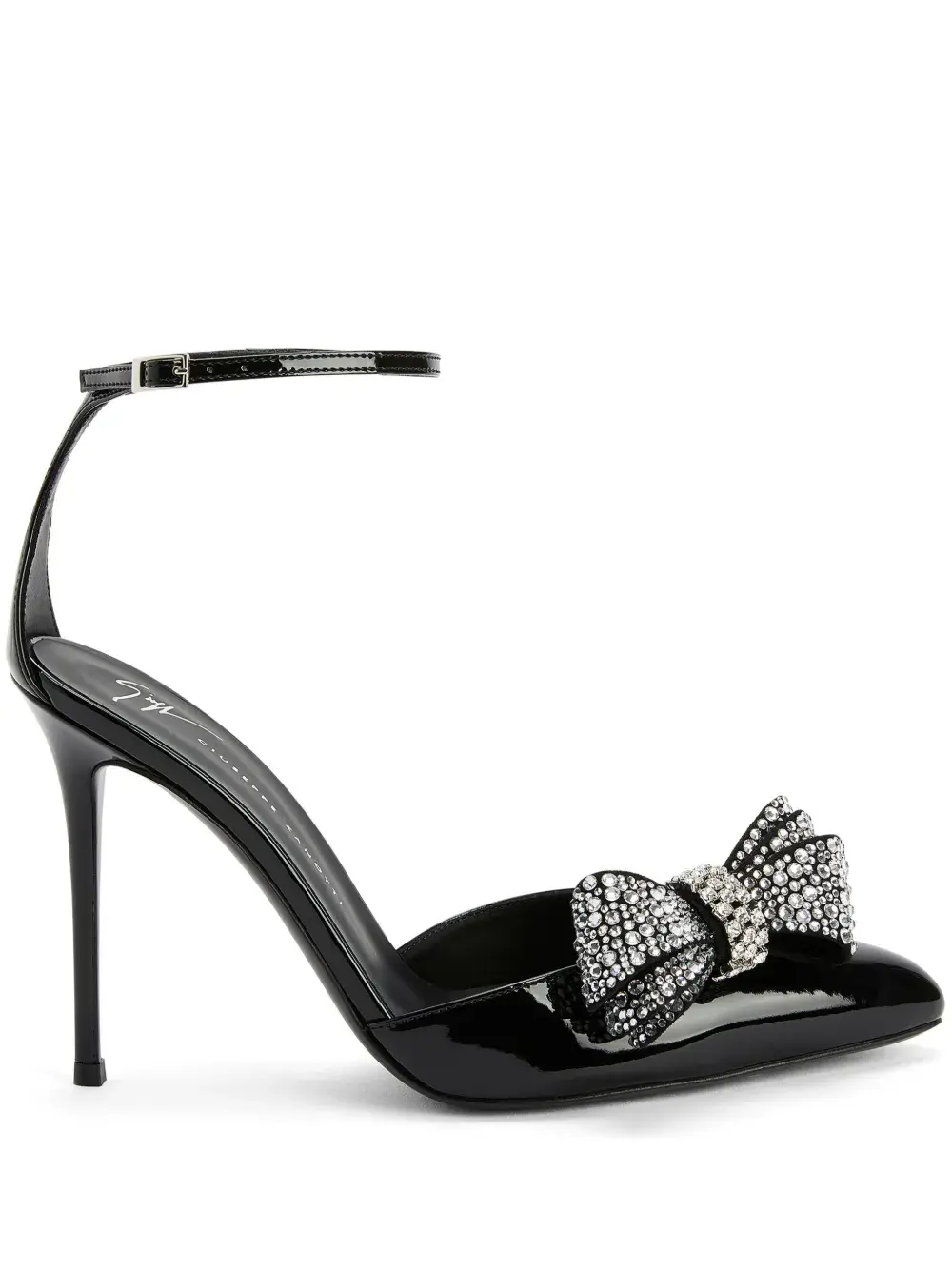 Черный, заостренный носок, телячья кожа, бант, декор из кристаллов, ремешок на щиколотке с пряжкой, кожаная стелька с логотипом и каблук на высокой шпильке.