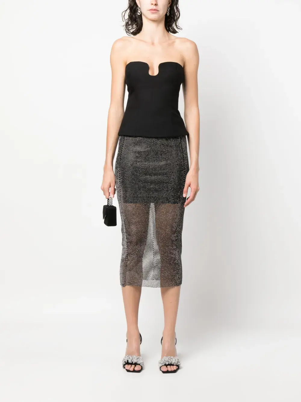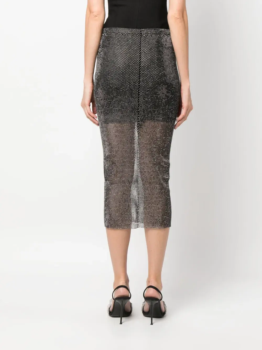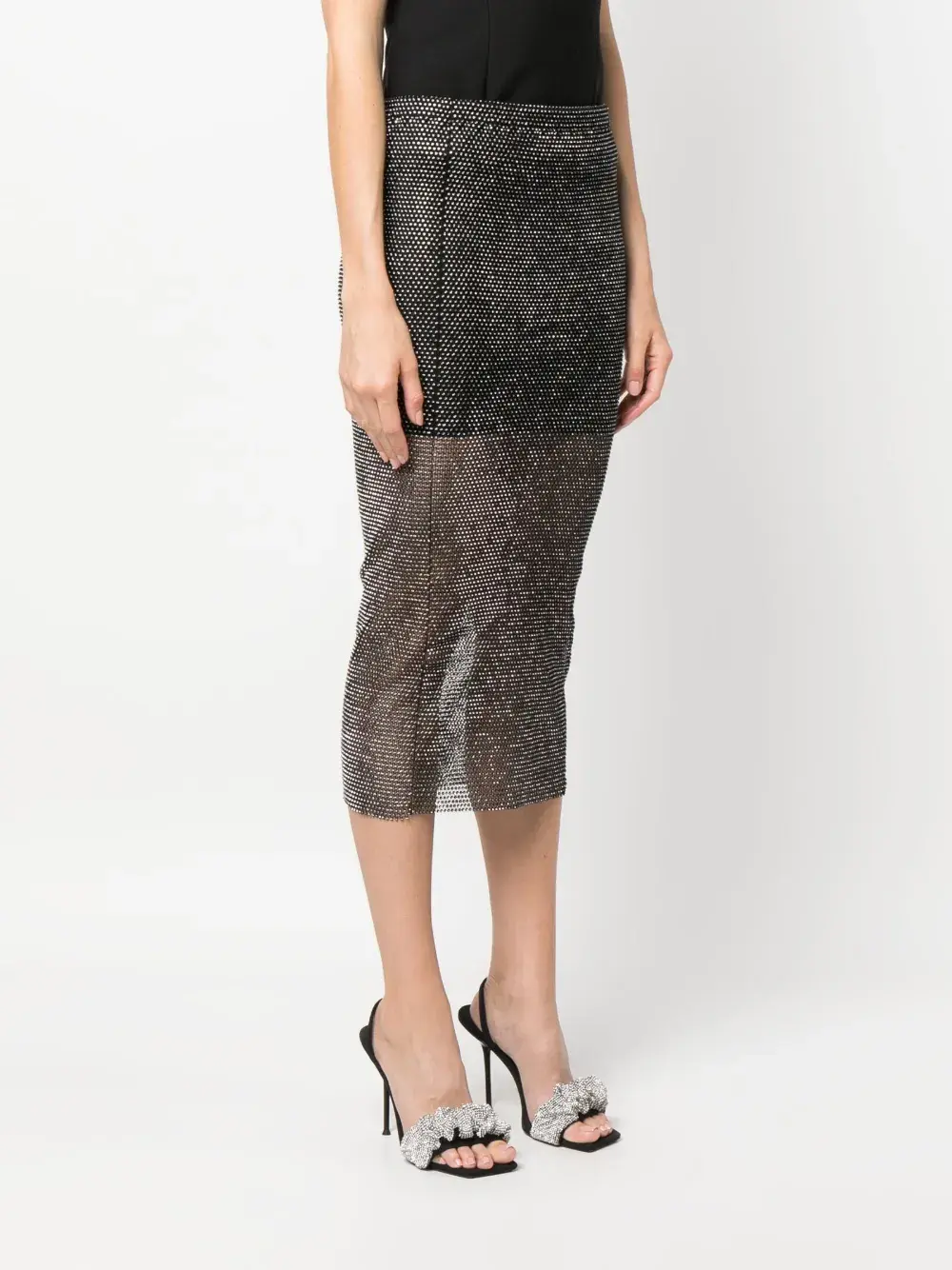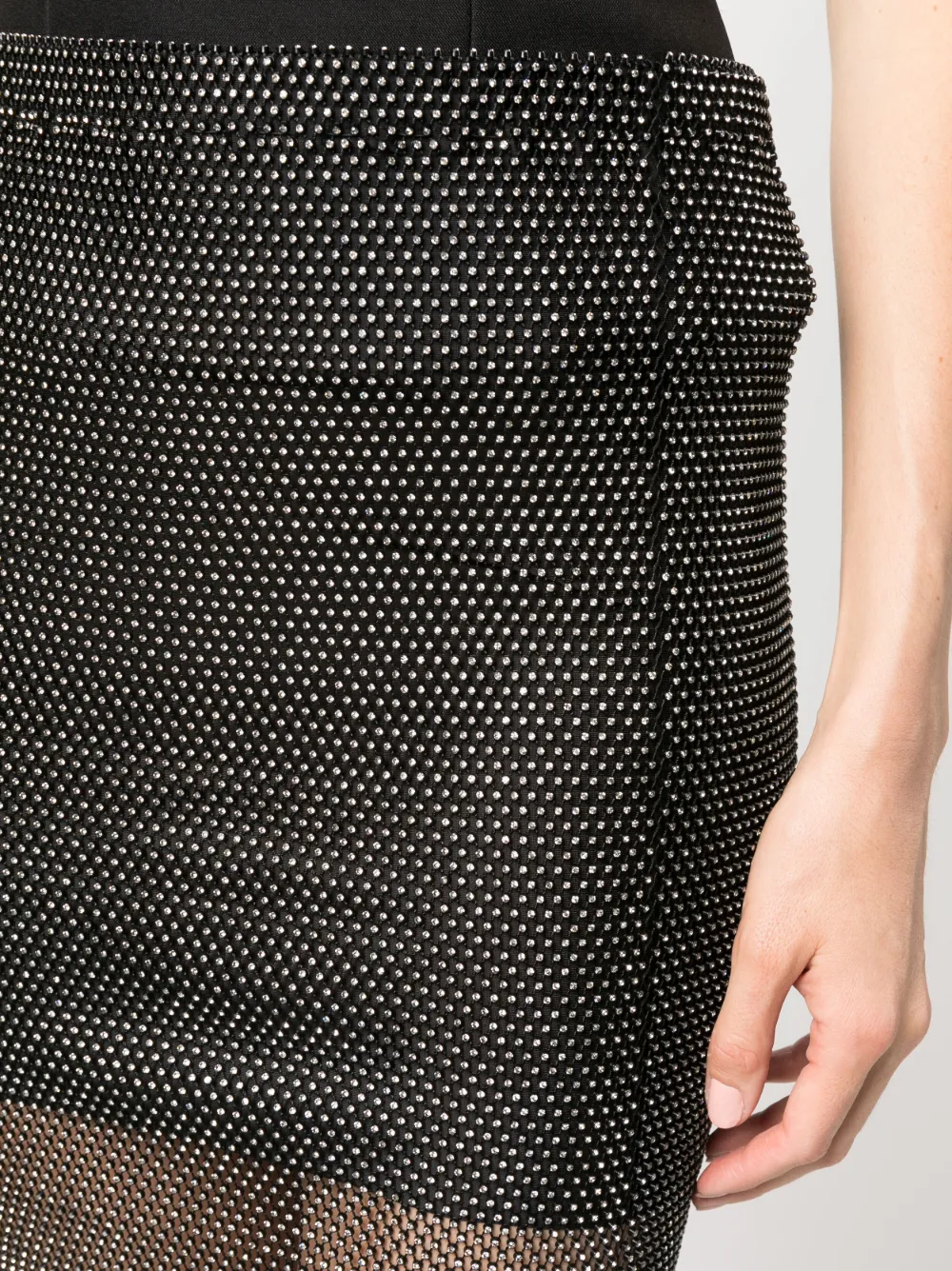 Черный, смесовый хлопок, украшения из горного хрусталя, сетчатые вставки, застежки на молнии сбоку и длина ниже колена.