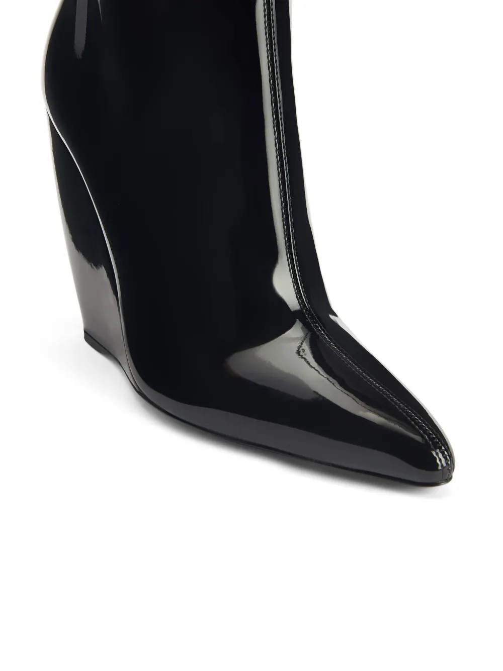 Черный, кожа, лакированная отделка, заостренный носок, застежка на молнии сбоку и высокий блочный каблук.