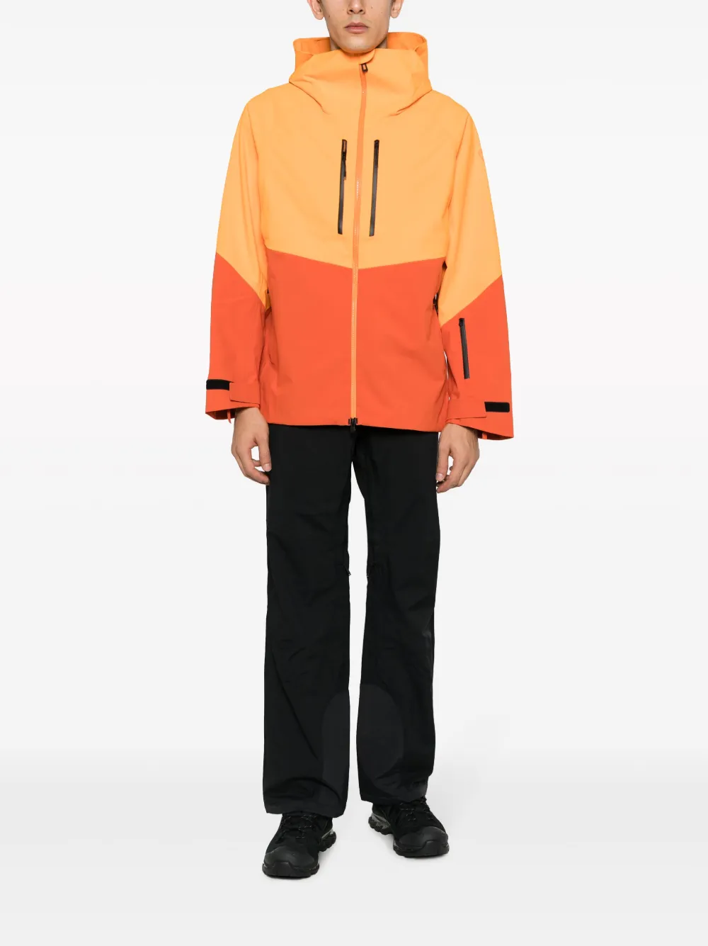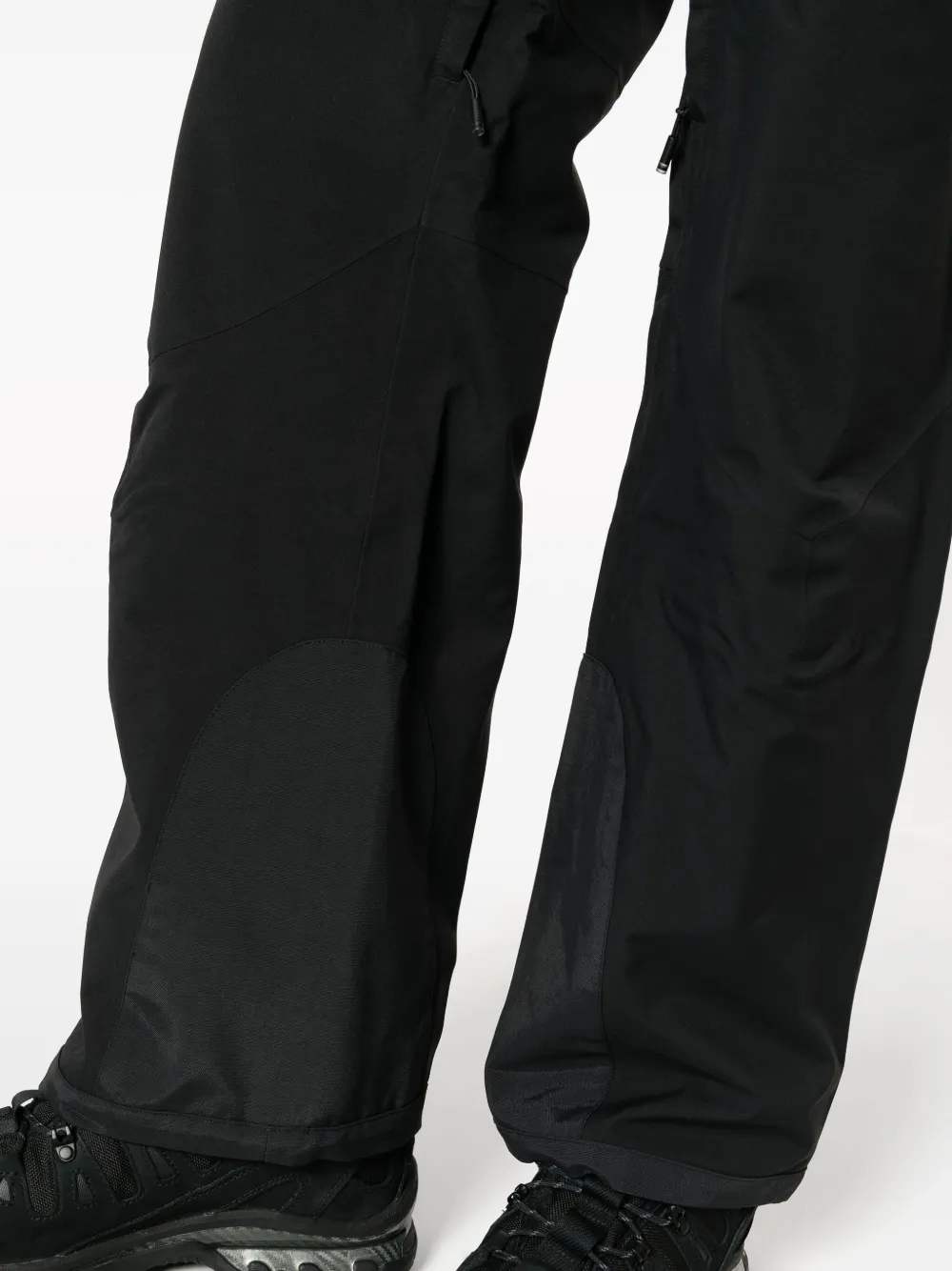 Черный, двойные стенки с изоляцией, водонепроницаемый материал, принт с логотипом сзади, средняя посадка, застежка на кнопки и молнию спереди, петли для ремня, два кармана на молнии по бокам, широкий крой и прямой подол.