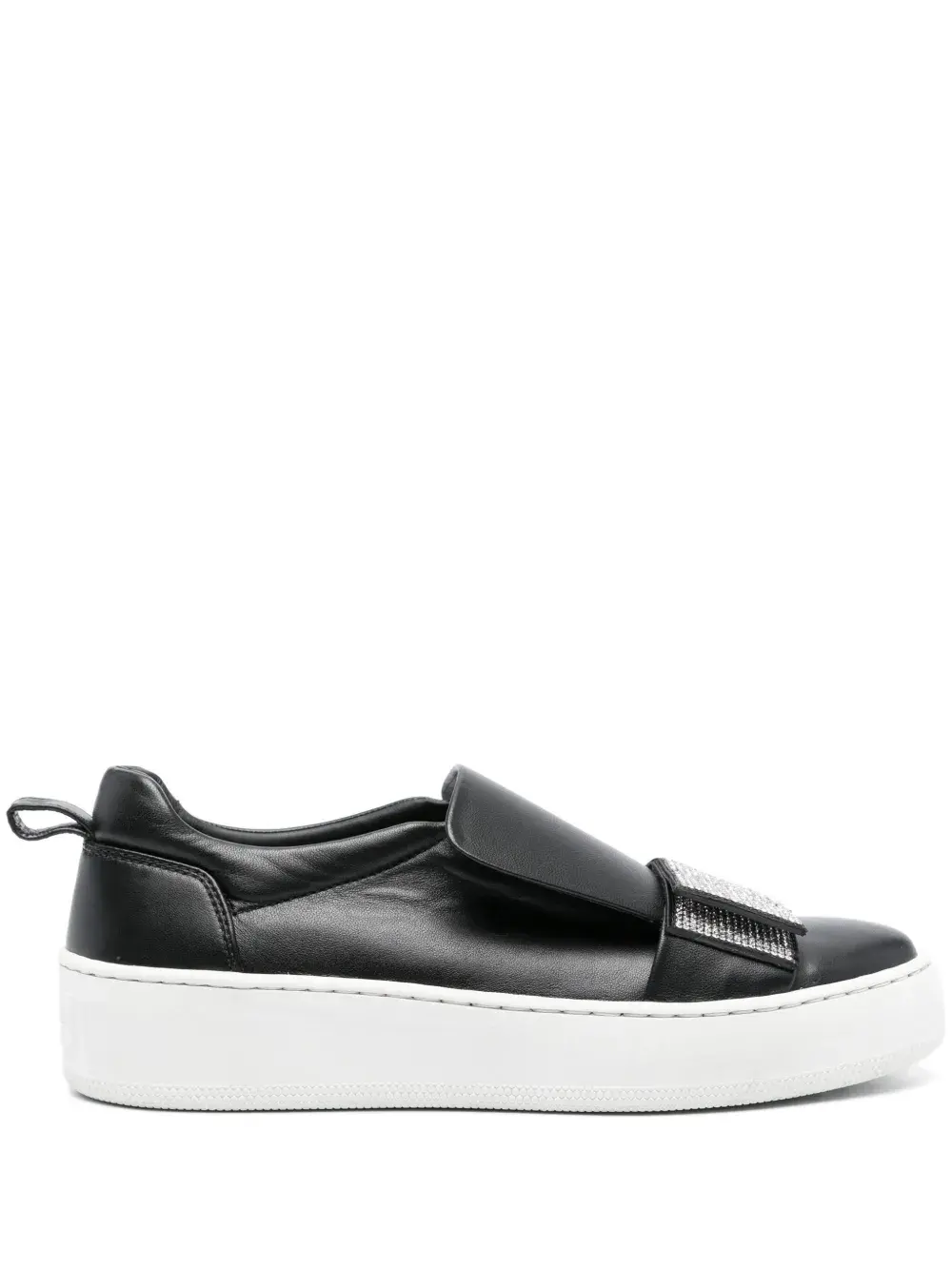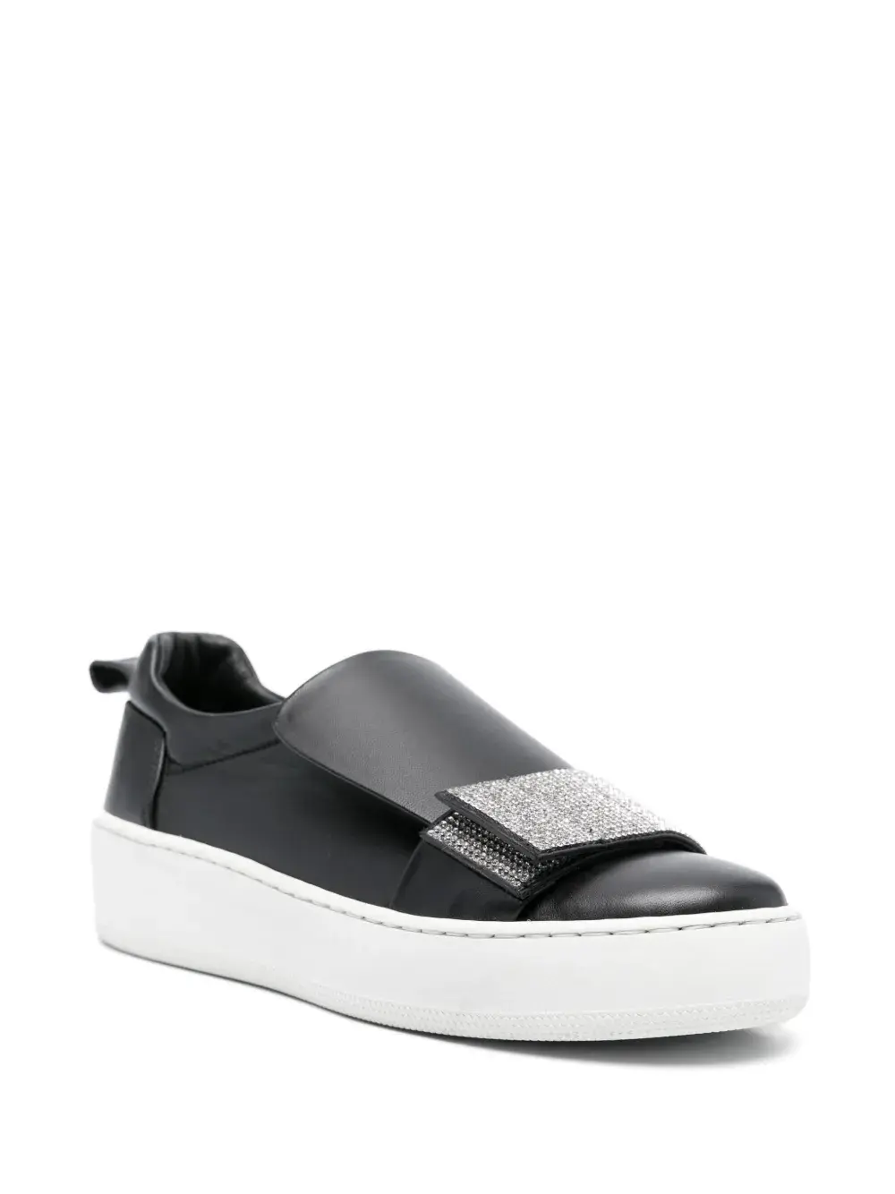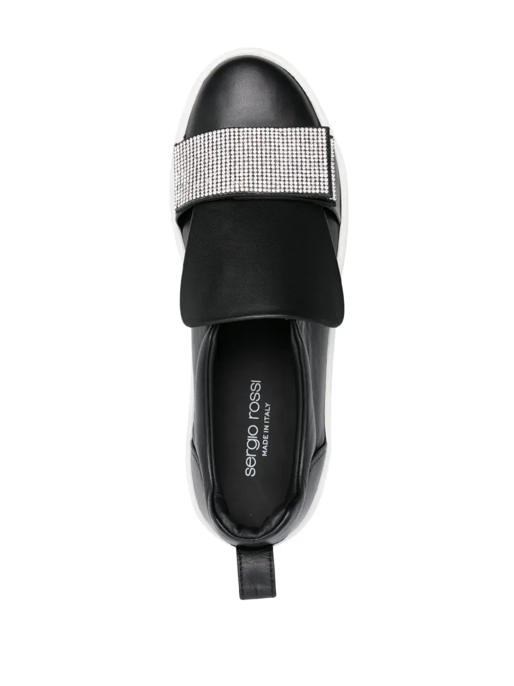 Черный, декор из кристаллов, модель без застежки, закругленный носок, кожаная стелька с логотипом и плоская резиновая подошва.