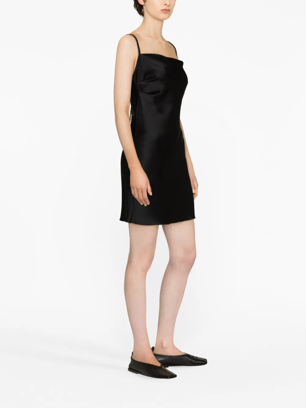 Черный, ткань с сатиновым переплетением, силуэт «комбинация», квадратный вырез, застежка на завязке сзади, тонкие бретели, длина до бедер и прямой подол. Узнать больше о том, какие товары получают отметку «Ответственный выбор», можно из материала «Как мы оцениваем экологичность и этичность».