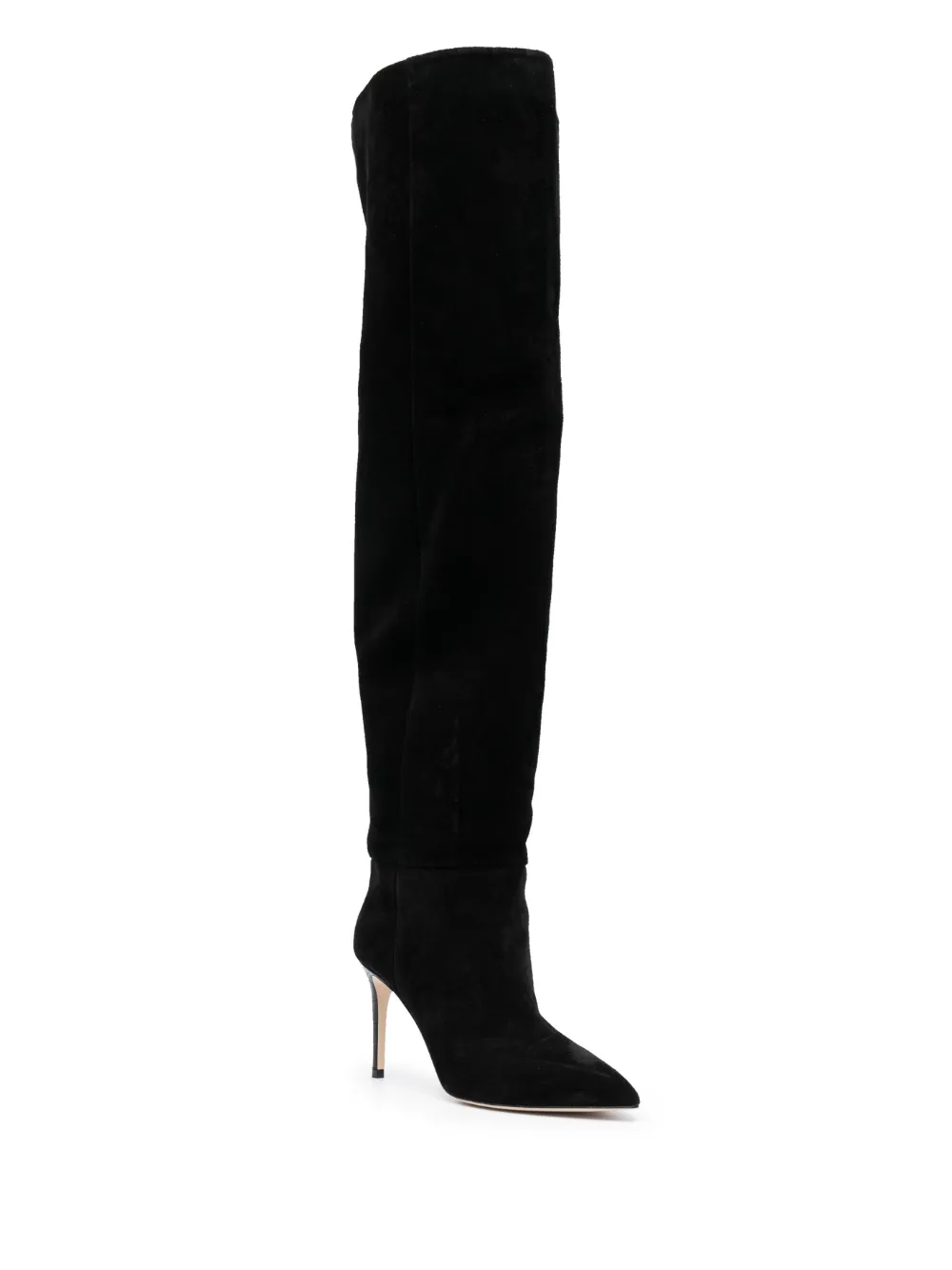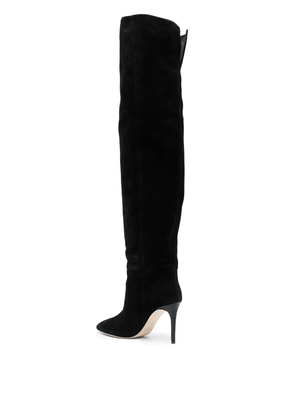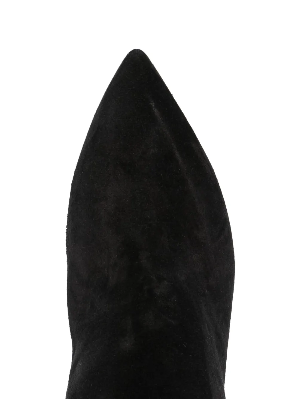 Черный, замша из телячьей кожи, высота до линии бедра, заостренный носок и каблук на высокой шпильке.
