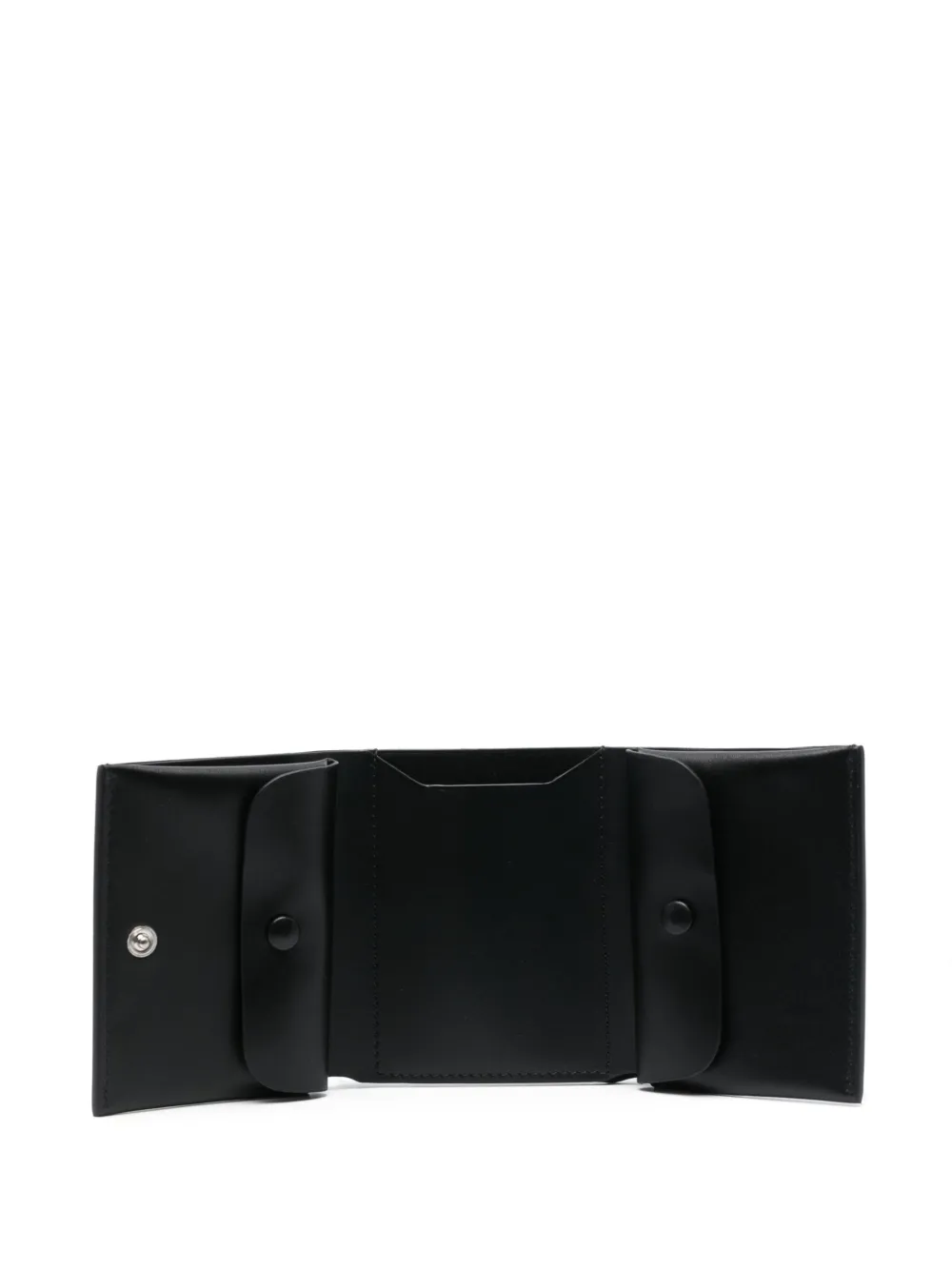 Черный, телячья кожа, металлический логотип, застежка на кнопках, внутренний карман с клапаном и три сложения.