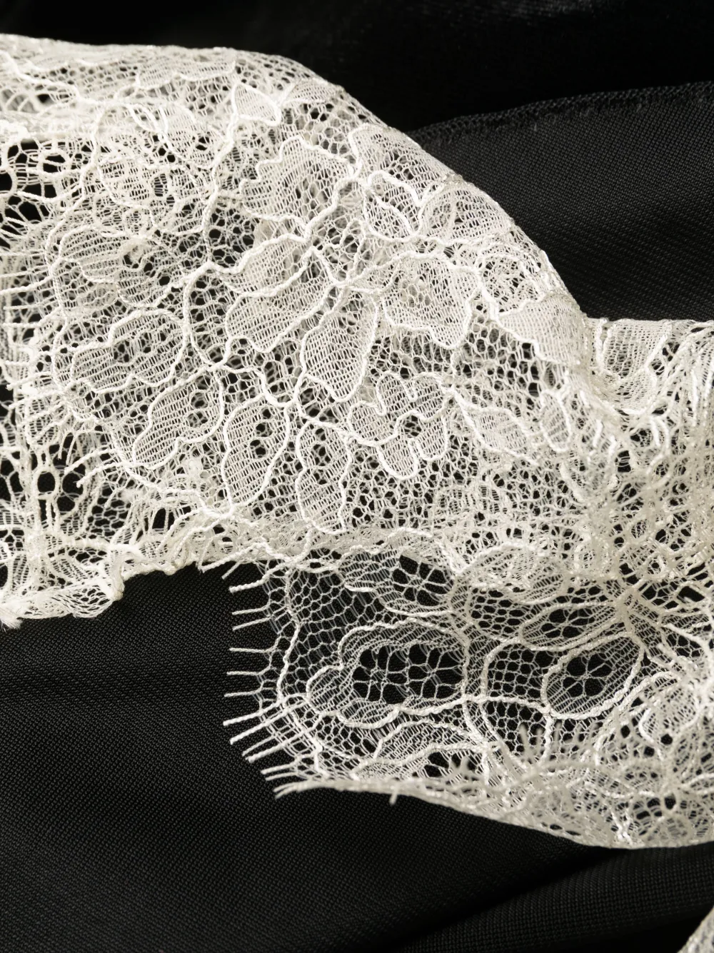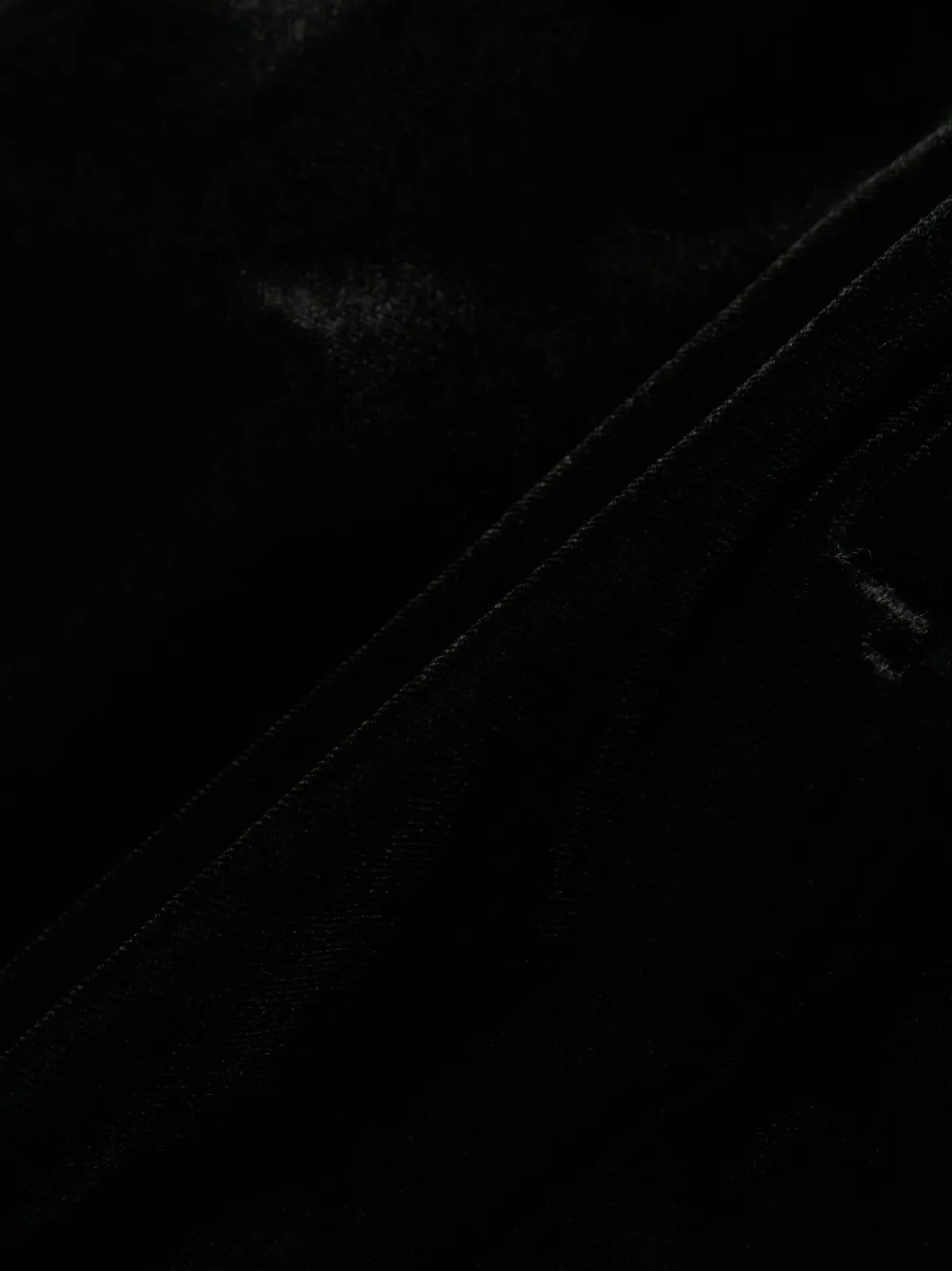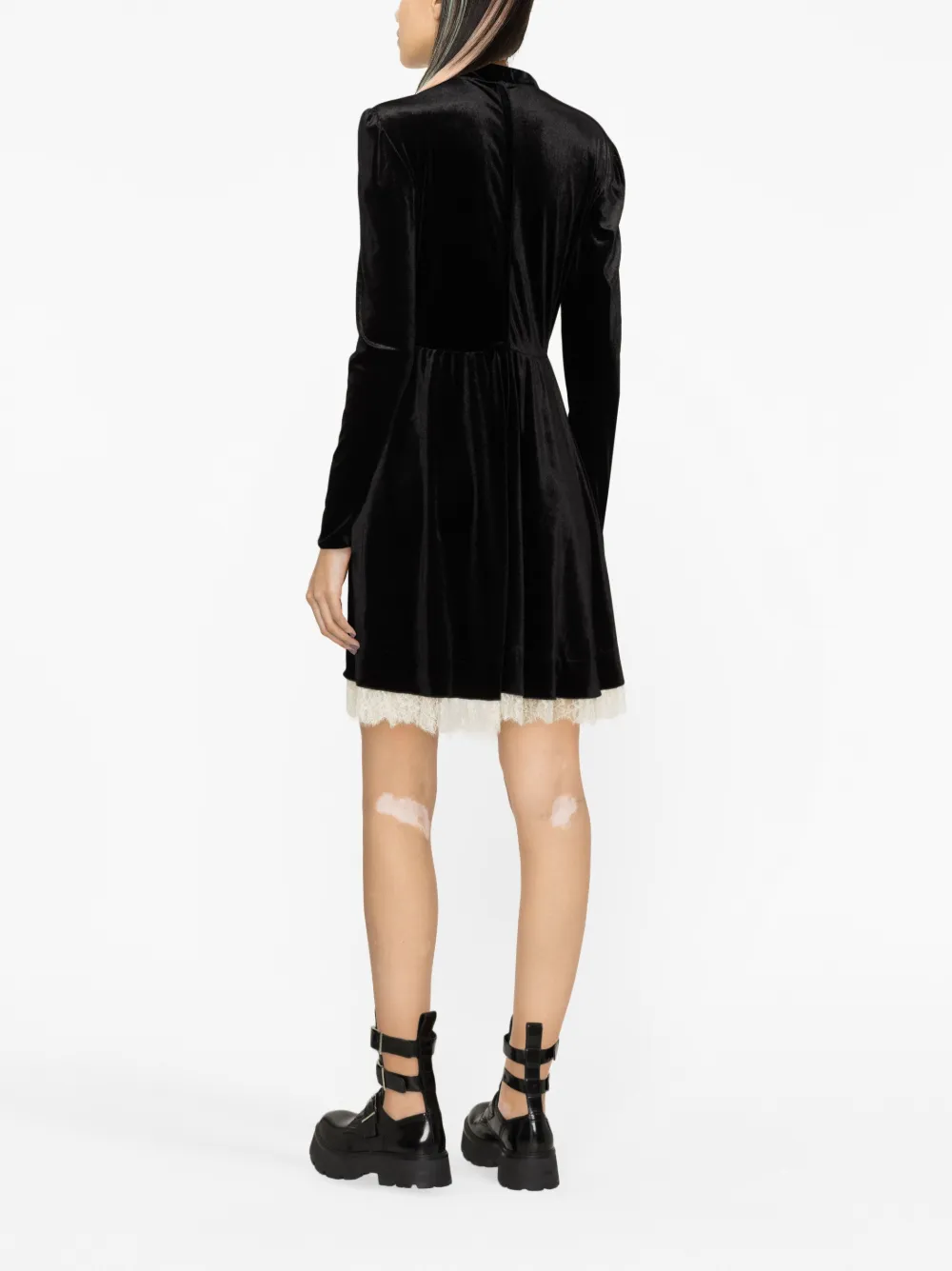 Черный, бархат, складки, кружево, высокий воротник, декоративные пуговицы, длинные рукава, потайная застежка на молнии сзади, расклешенный крой и длина до бедер.