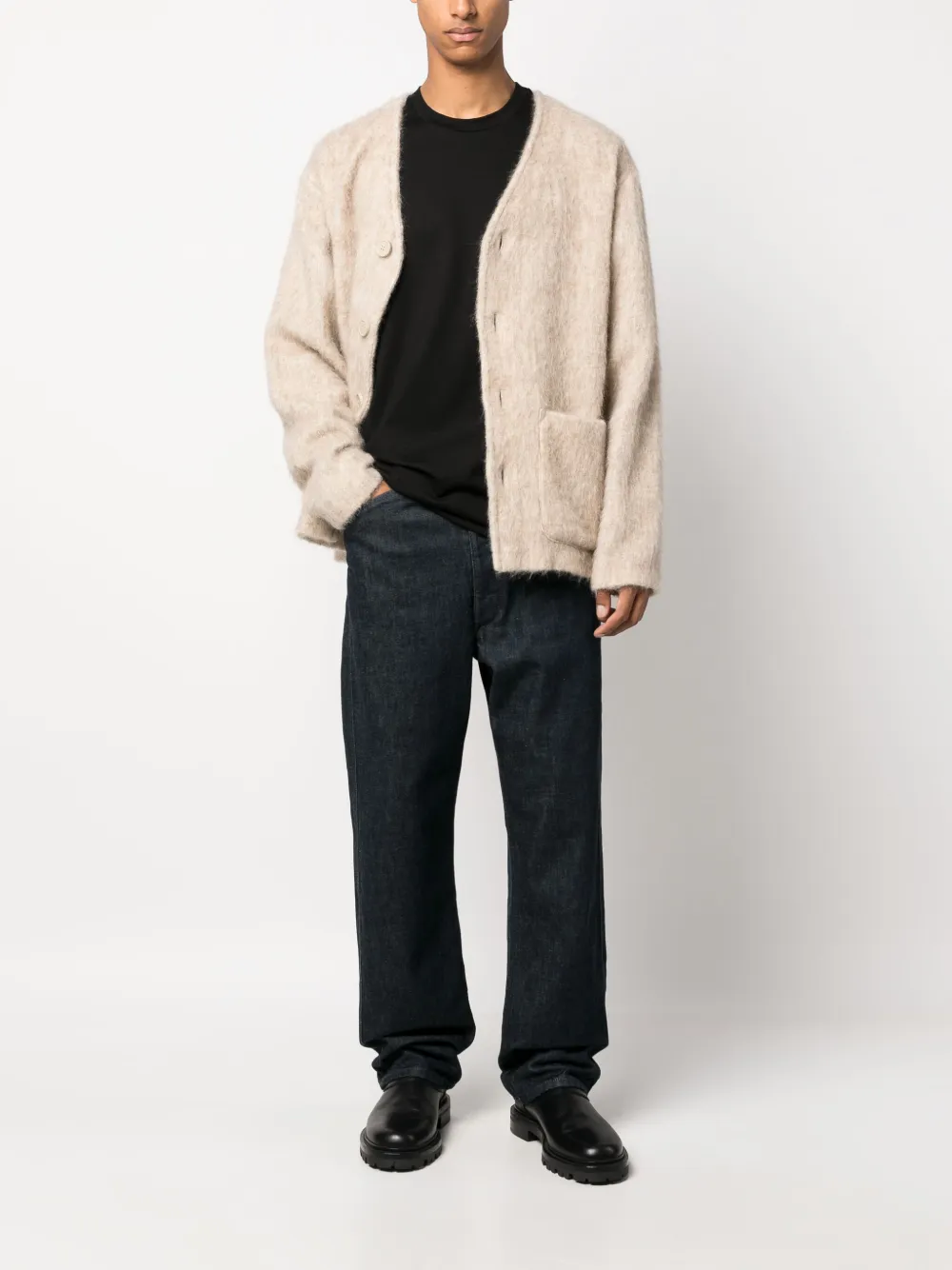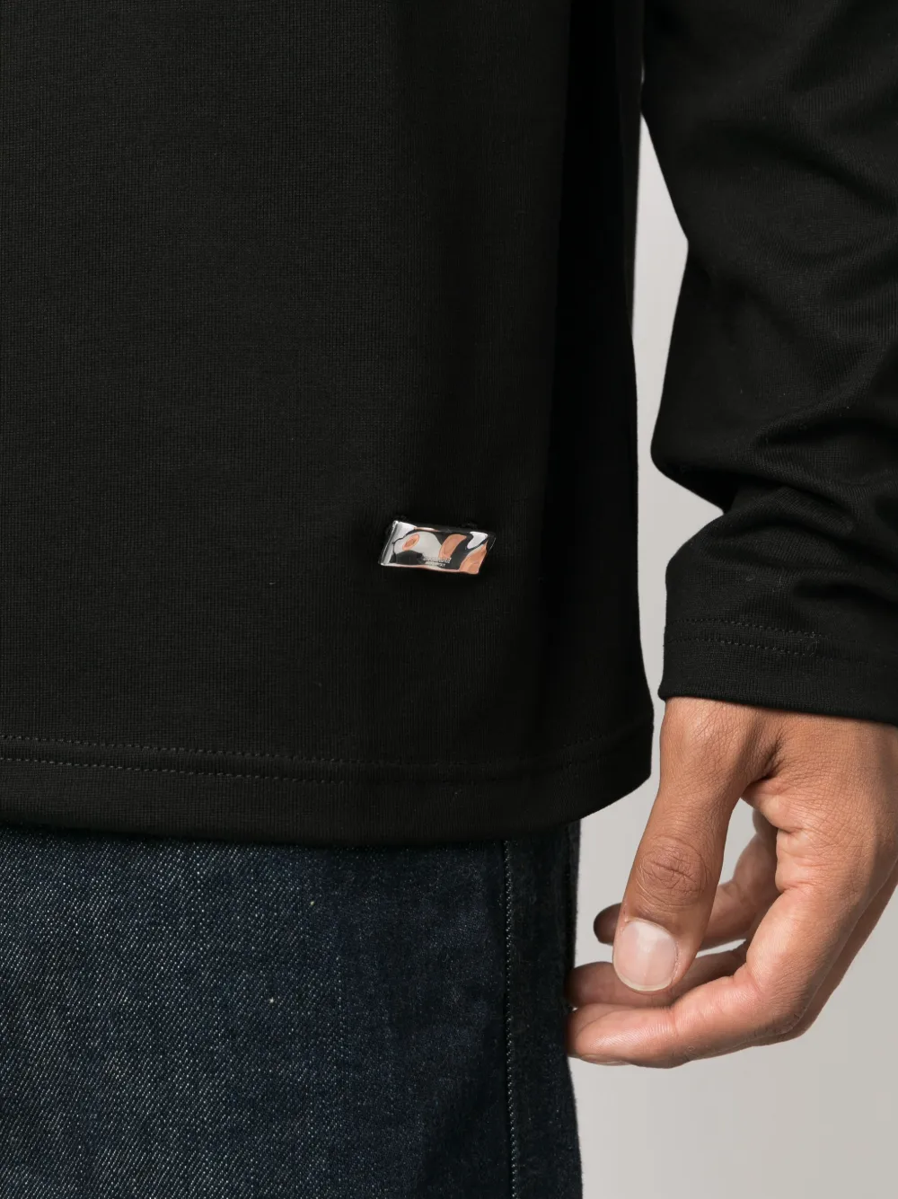 Черный, хлопок, серебристый металлический логотип, круглый вырез, длинные рукава и прямой подол.
