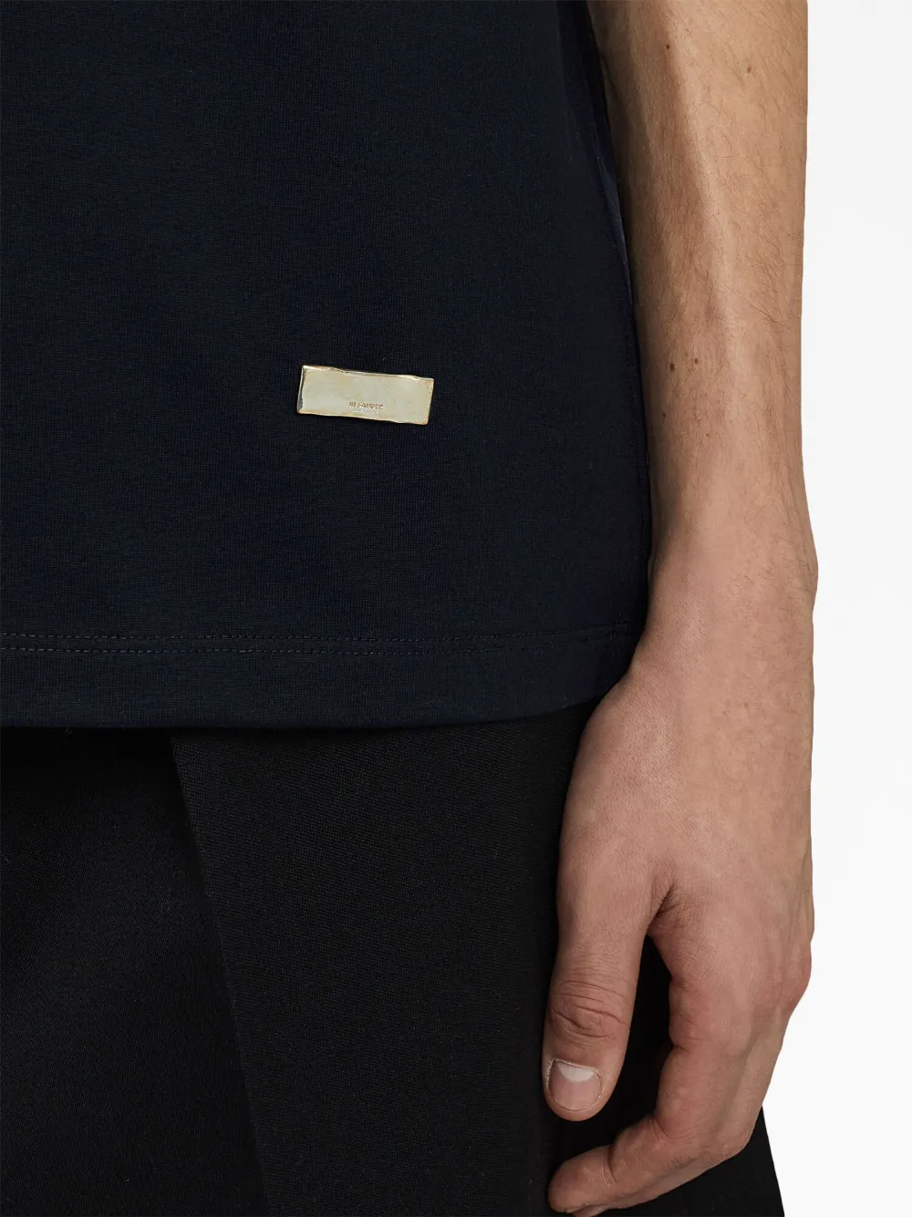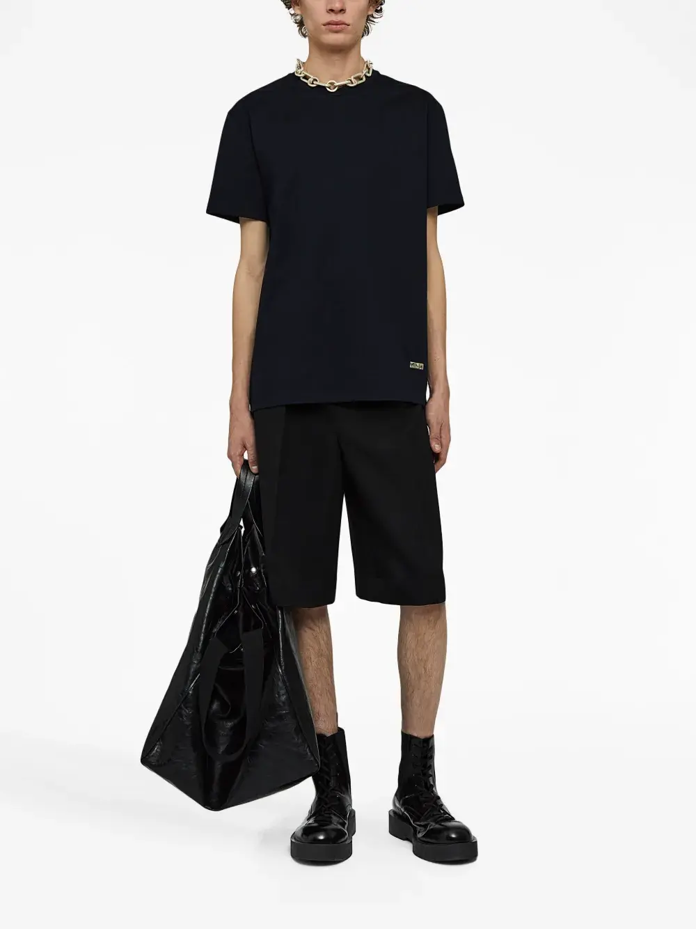 Черный, хлопок, металлический логотип, круглый вырез, короткие рукава и прямой подол.