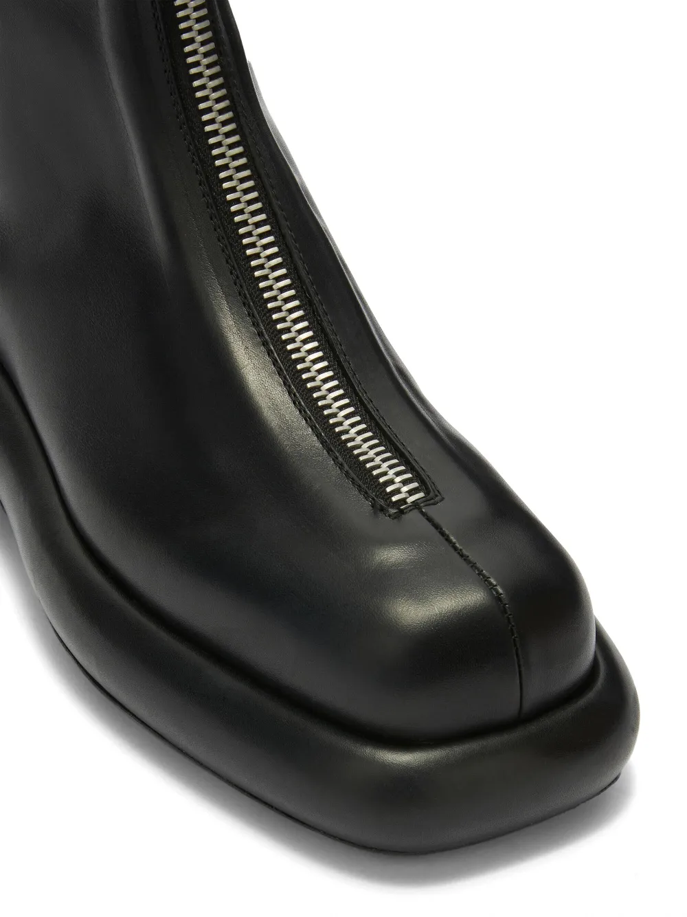 Черный, телячья кожа, высота по щиколотку, застежка на молнии спереди, квадратный носок, массивная резиновая подошва и стелька с логотипом.