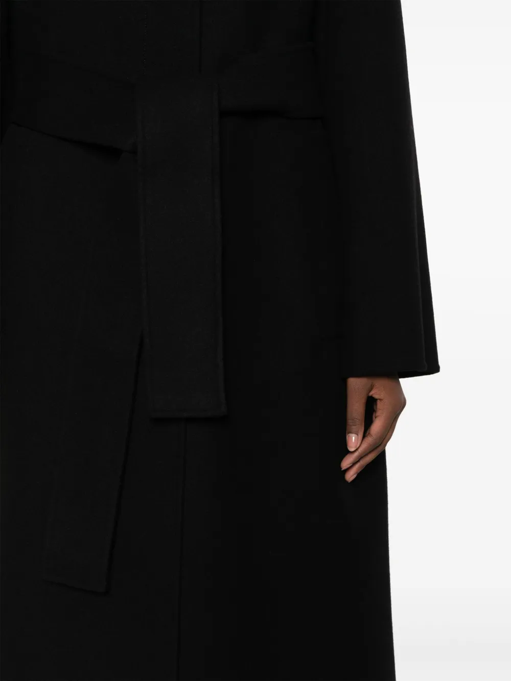 Черный, кашемир, зазубренные лацканы, потайная застежка спереди, два прорезных кармана по бокам, длинные рукава, шлица по центру сзади и длинная модель.