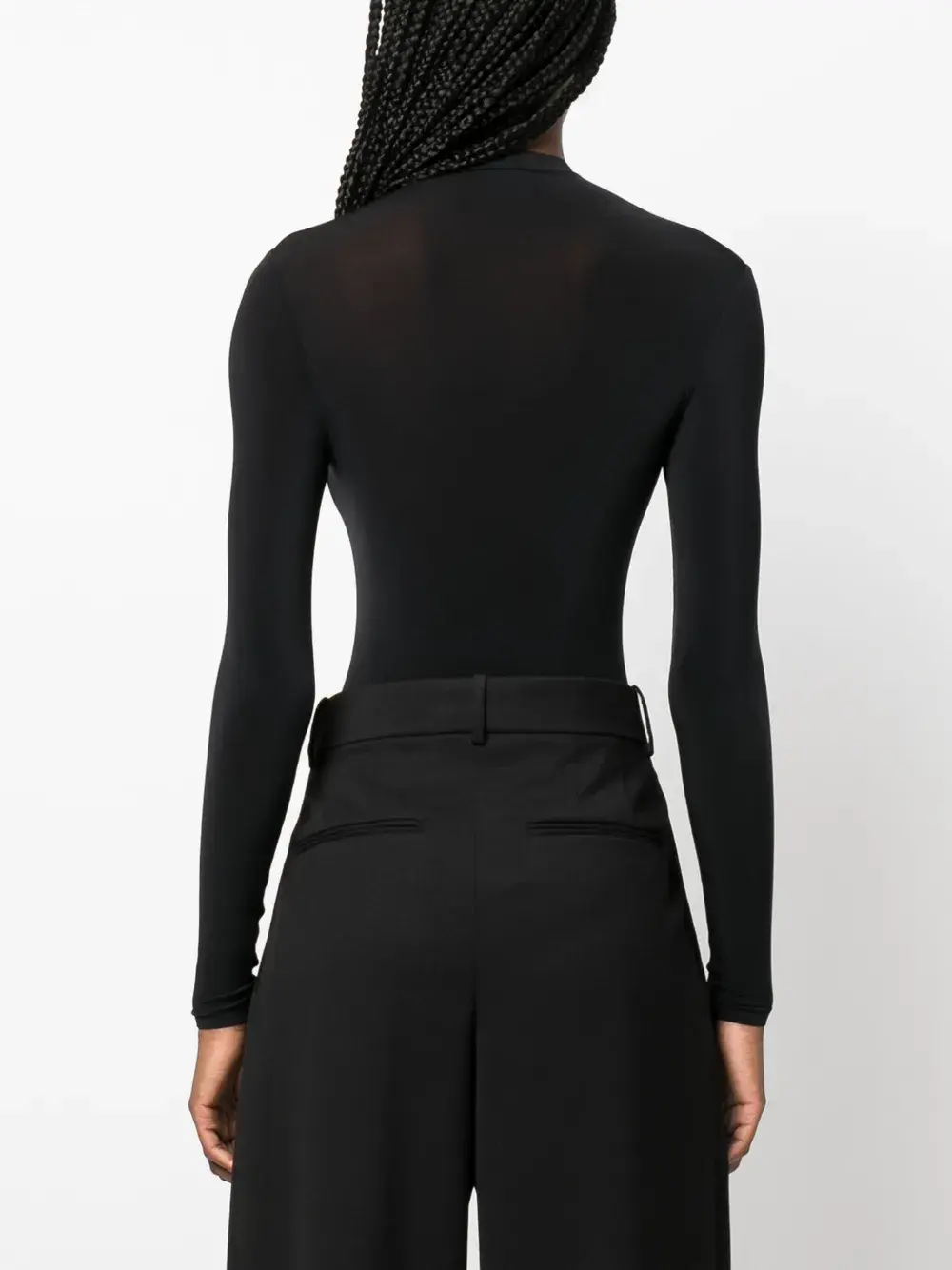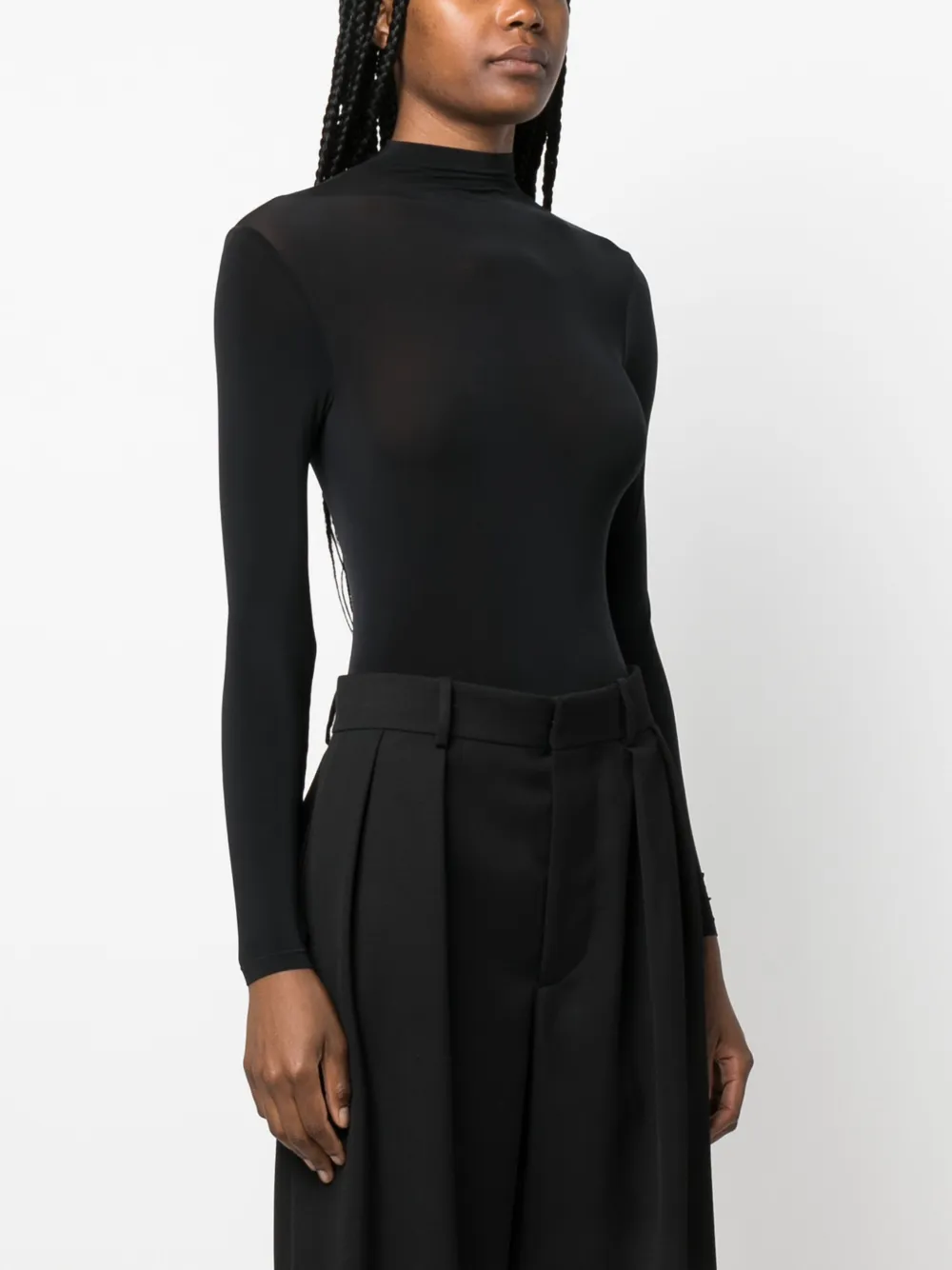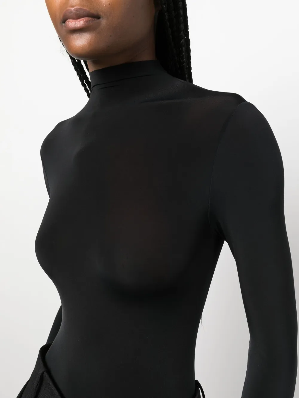 Черный, эластичный материал, полупрозрачный дизайн, высокий воротник, застежка на кнопках, длинные рукава и рукава с узкими манжетами.