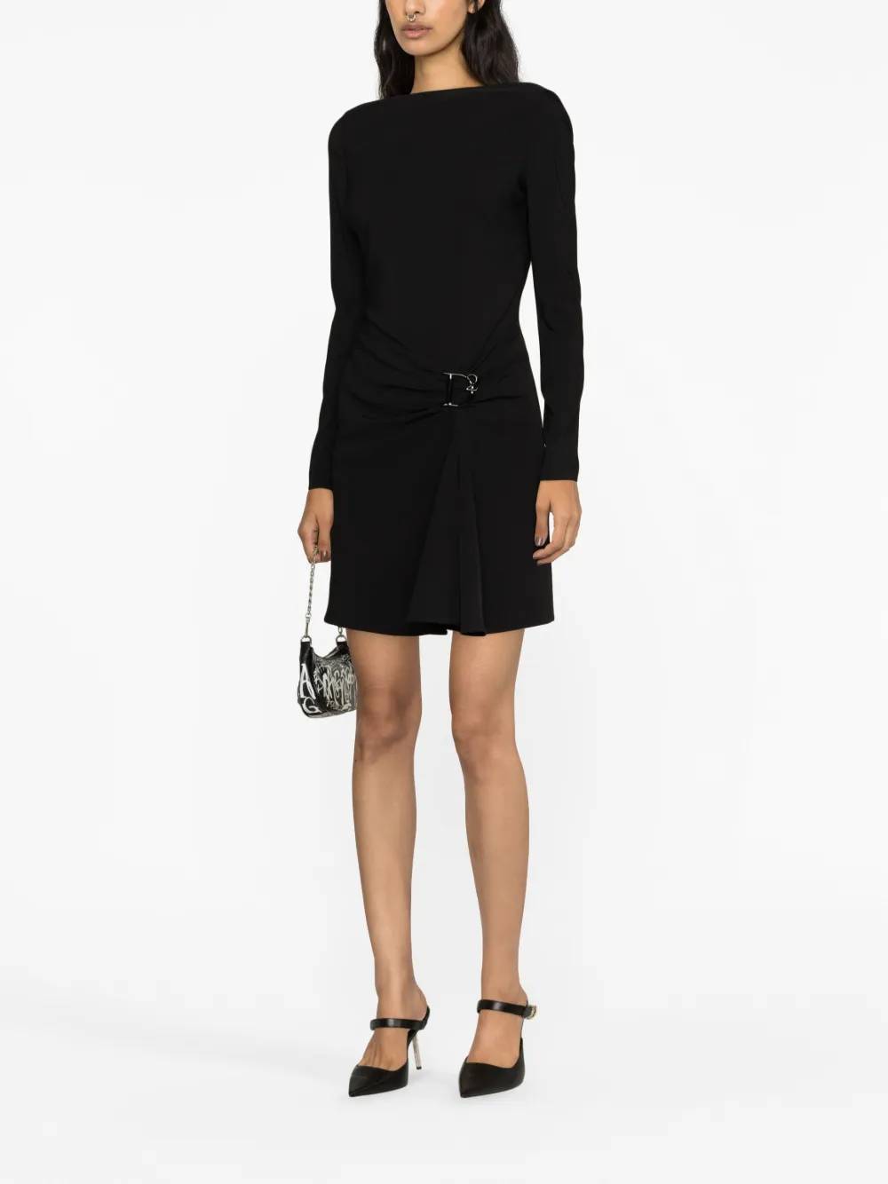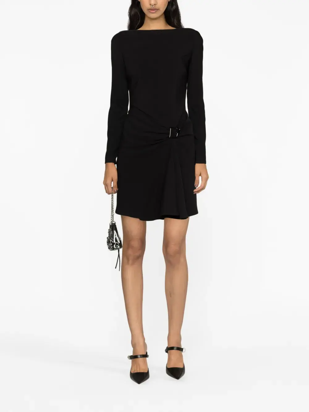 Черный, расклешенный крой, детали с оборками, вырез-лодочка, длинные рукава и длина по колено.