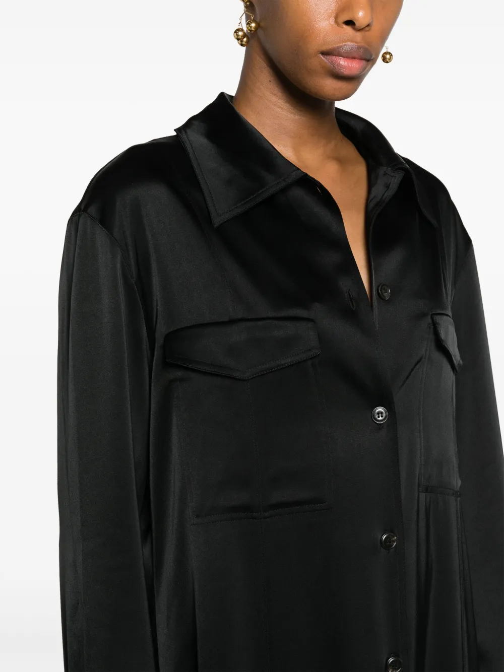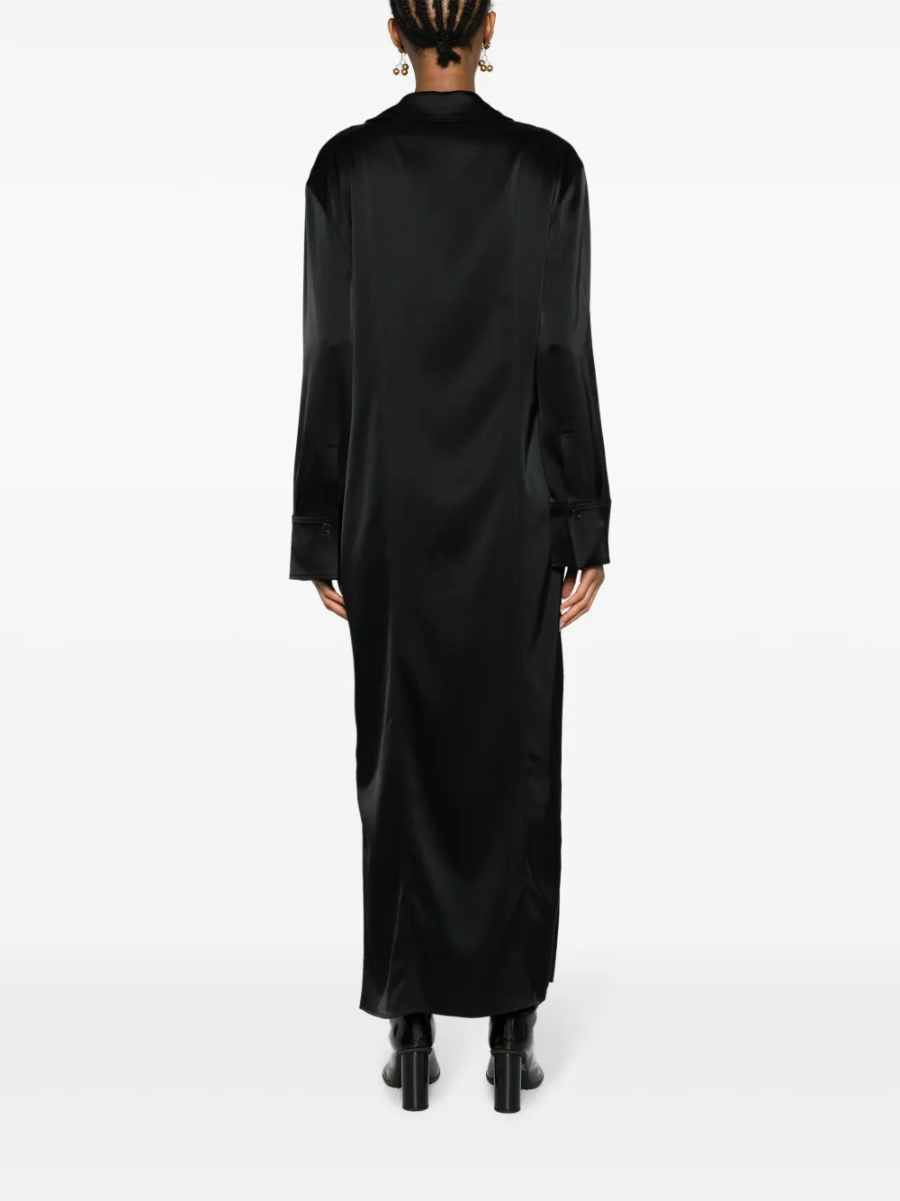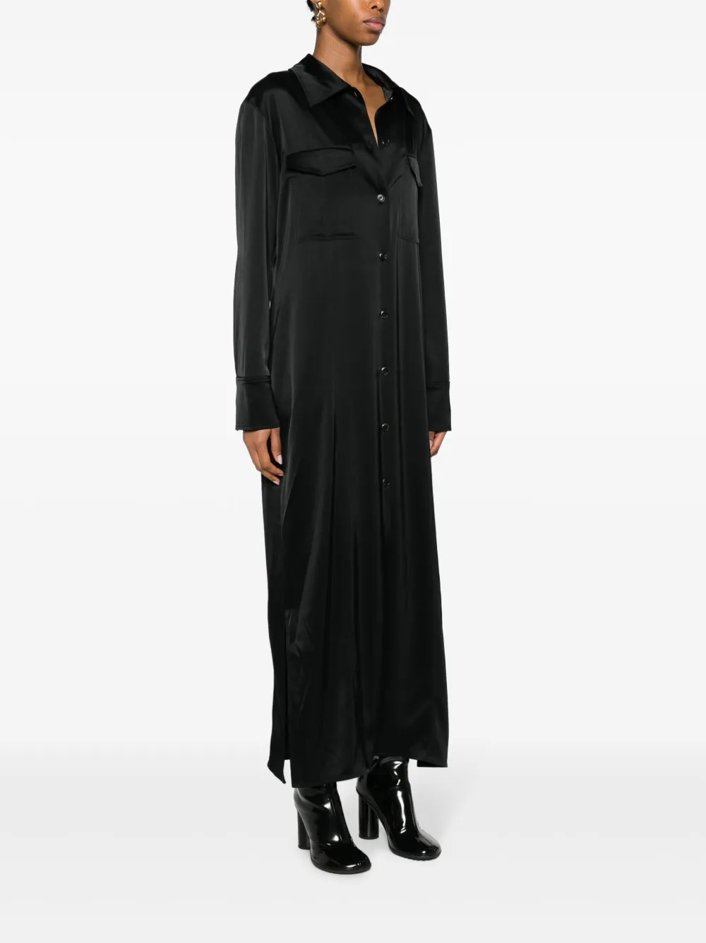 Черный, ткань с сатиновым переплетением, плоский заостренный воротник, два нагрудных кармана с клапанами, застежка на пуговицах спереди, длинные рукава, длина макси и прямой подол. . Узнать больше о том, какие товары получают отметку «Ответственный выбор», можно из материала «Как мы оцениваем экологичность и этичность».