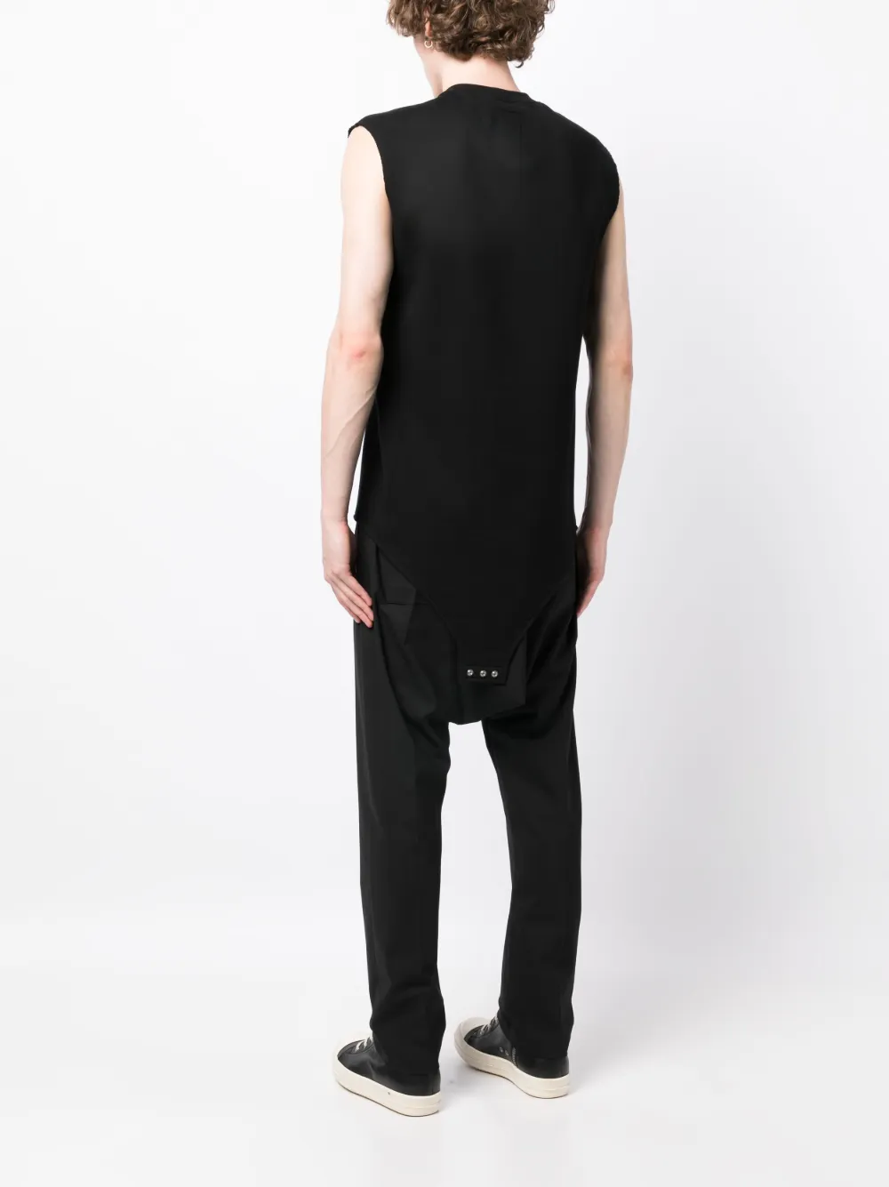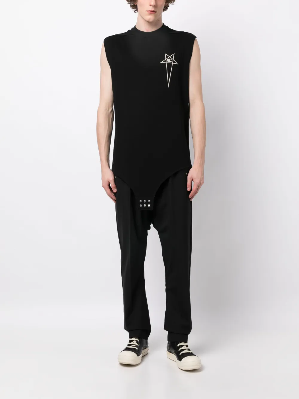 Черный, хлопок, вышитый логотип на груди, серебристая фурнитура, круглый вырез, застежка на защелке и без рукавов.