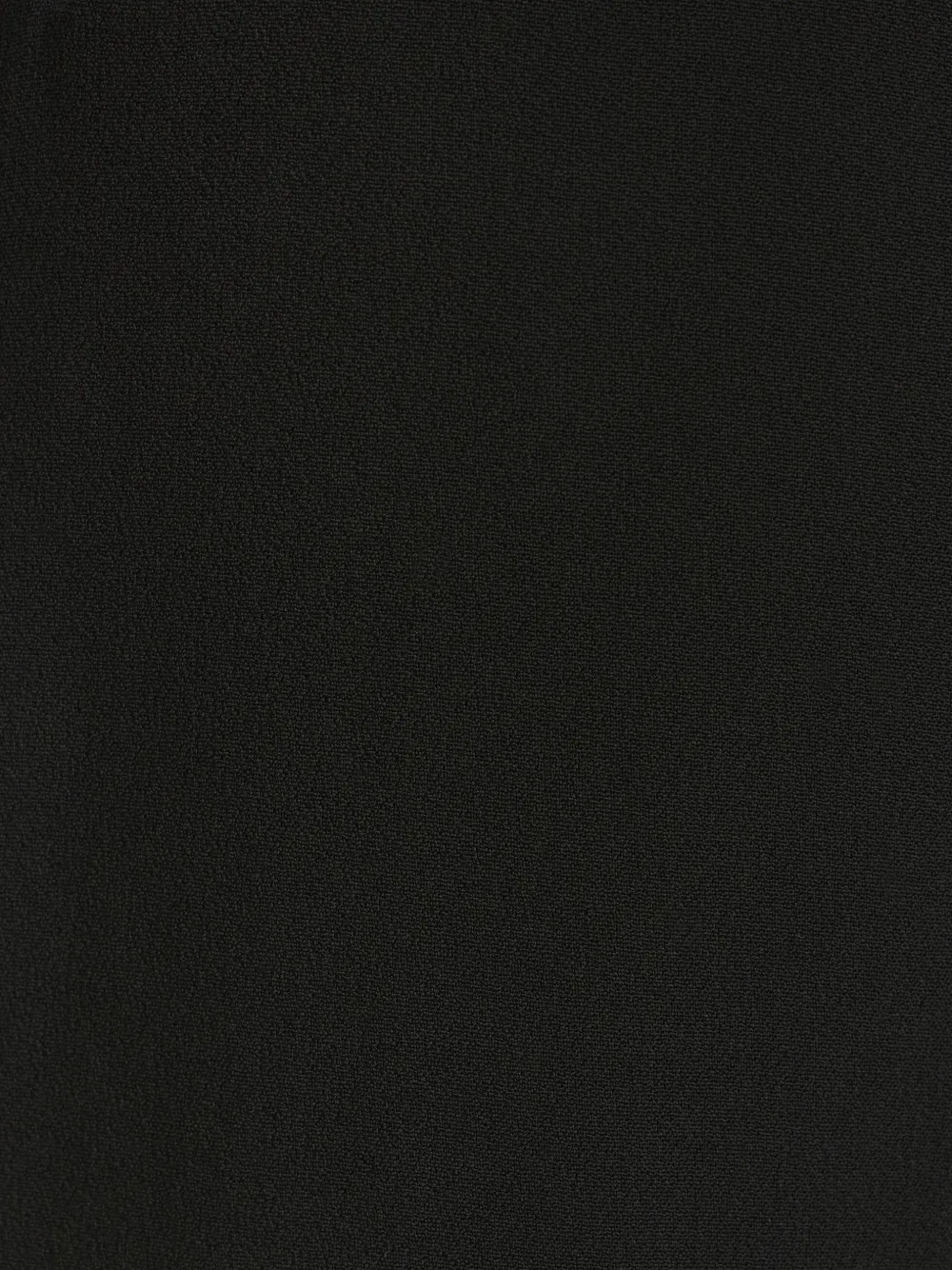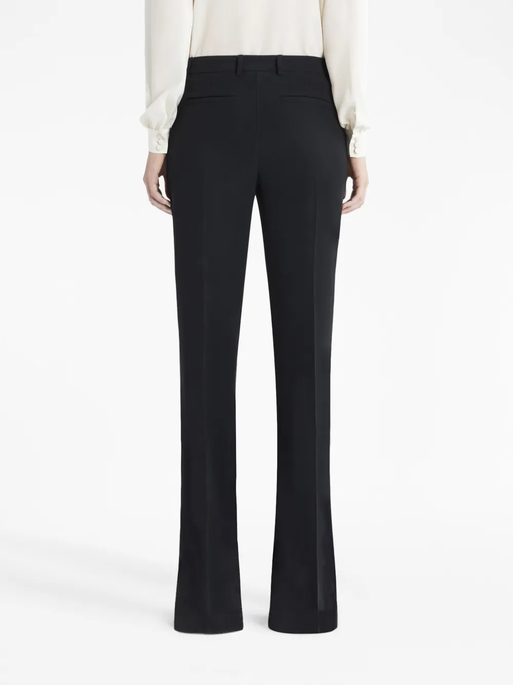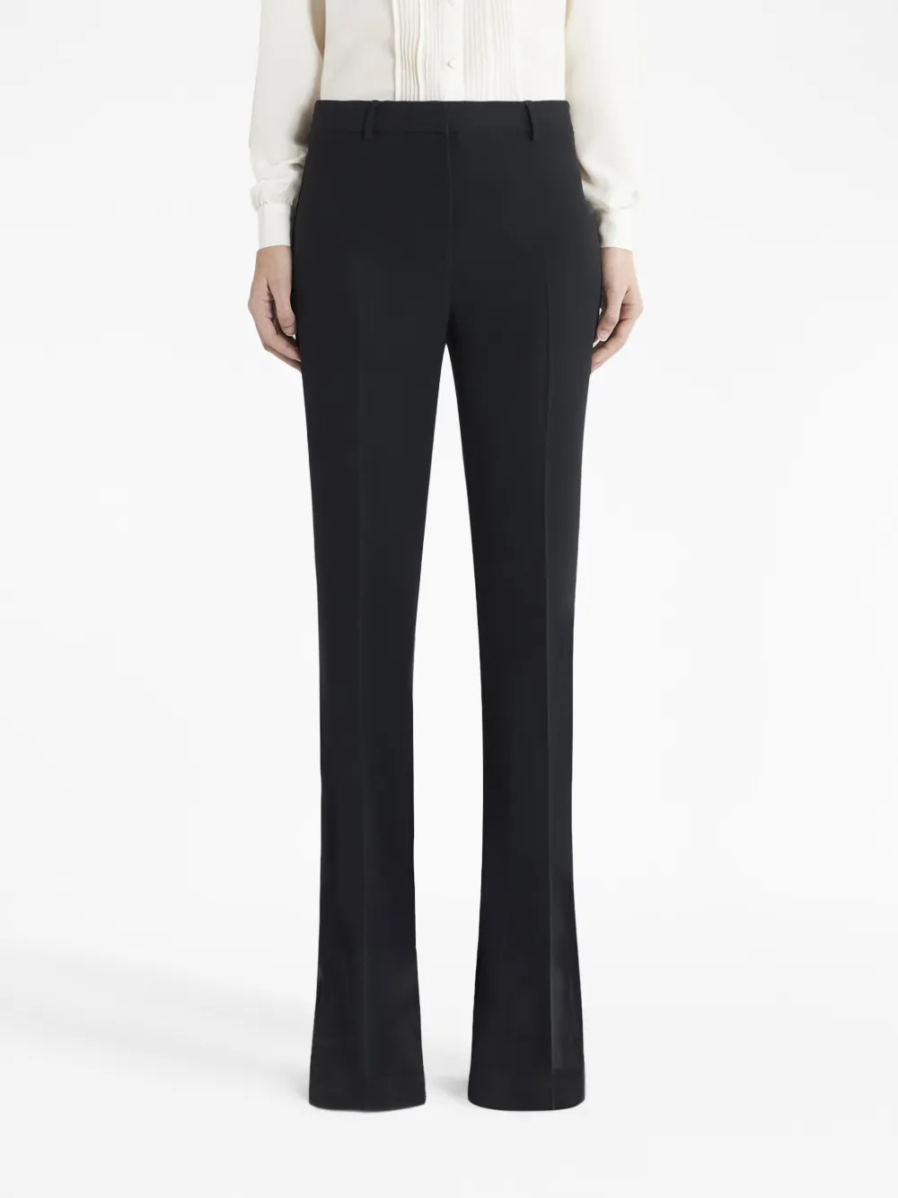 Черный, эластичный материал, средняя посадка, потайная застежка спереди, стрелки, два прорезных кармана по бокам, два кармана с листочкой сзади, петли для ремня и расклешенный крой.