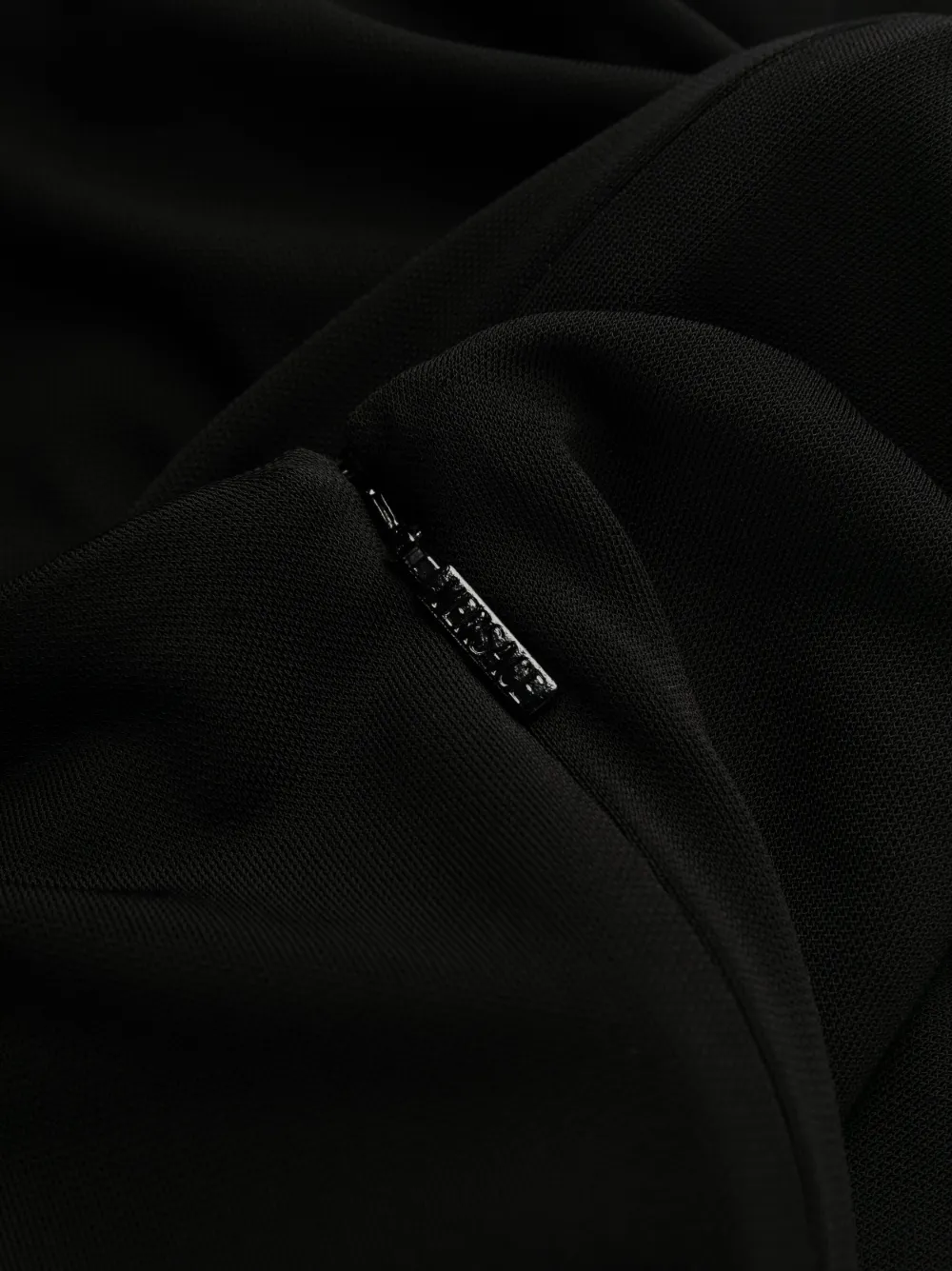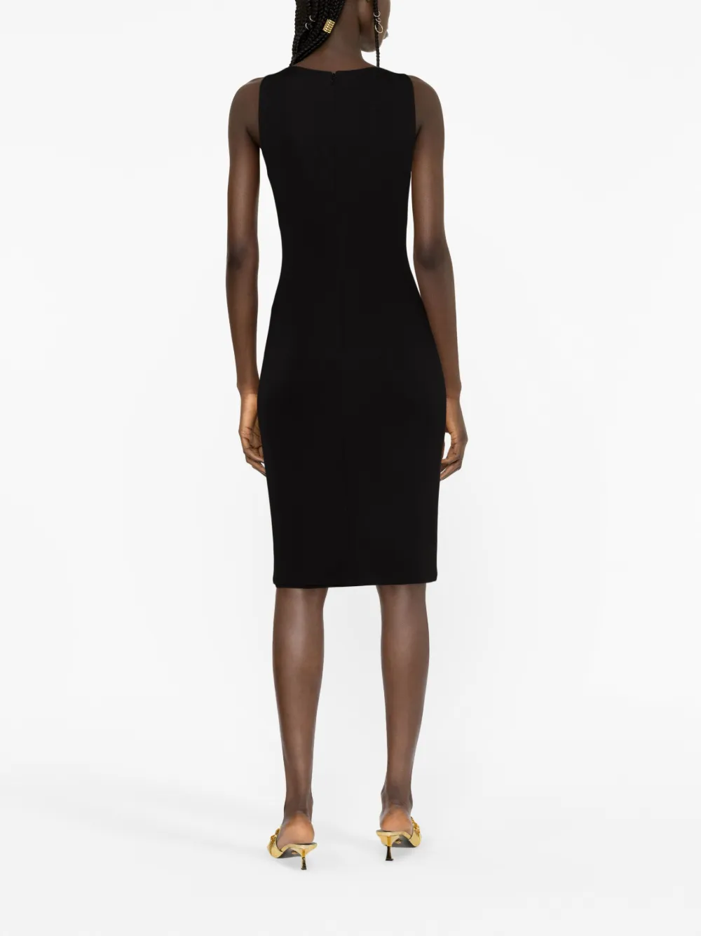 Черный, эластичный материал, узор Medusa Head, U-образный вырез, без рукавов, приталенный силуэт, застежка на молнии сзади, прямой подол и длина по колено.