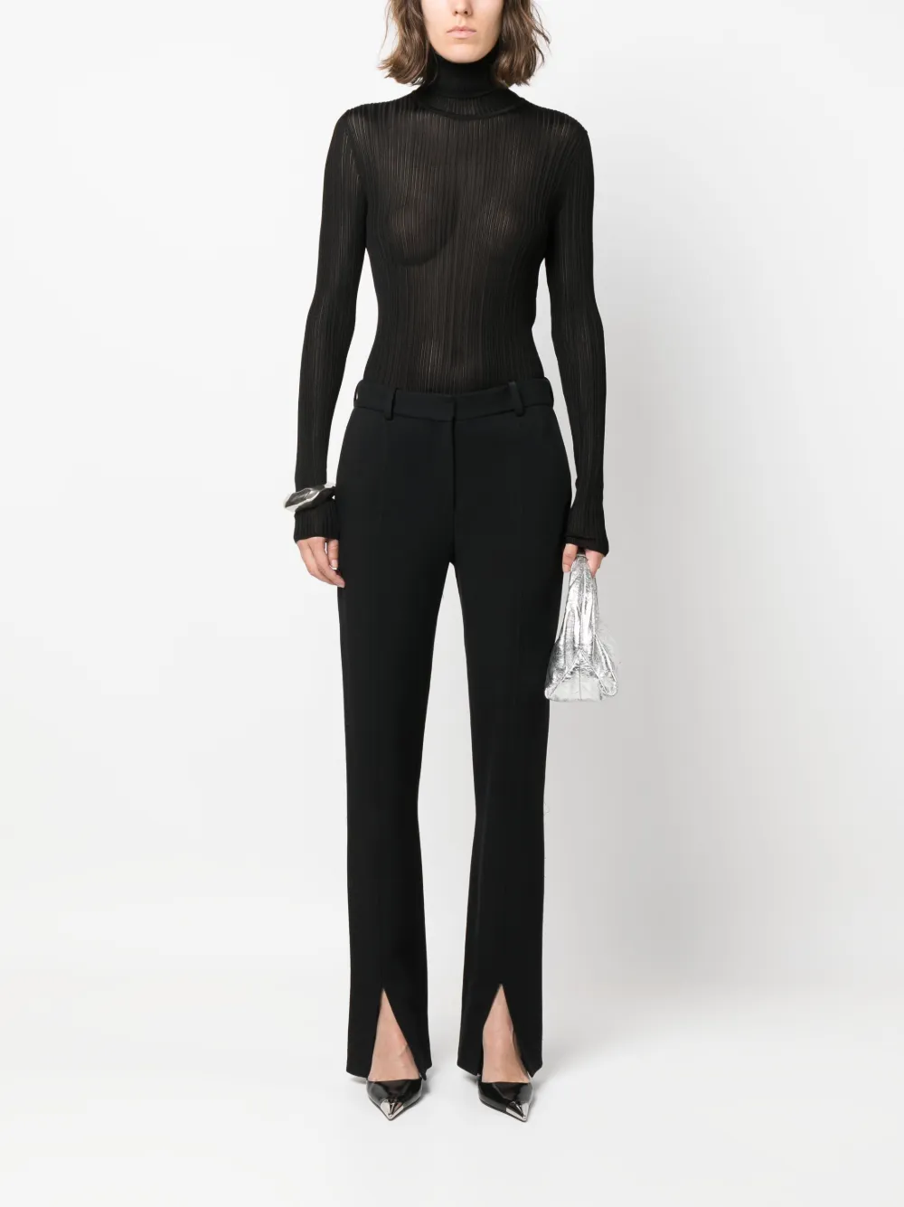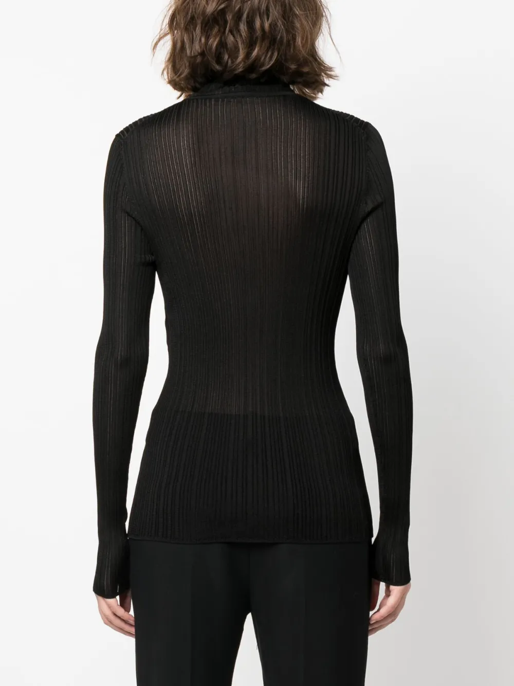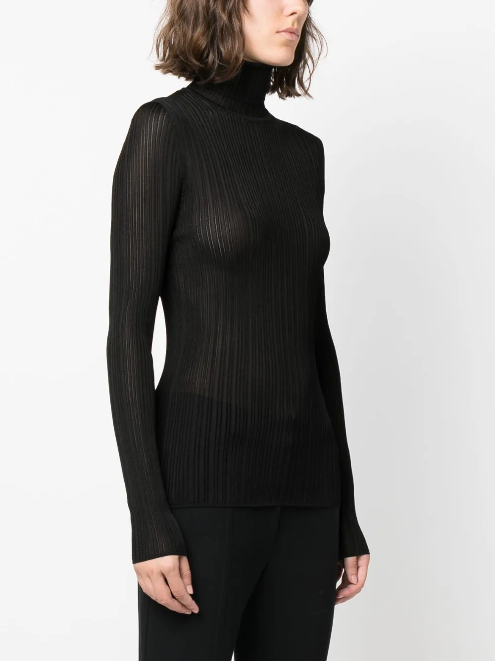 Черный, трикотажный материал, трикотаж в рубчик, полупрозрачный дизайн, высокий воротник, длинные рукава и прямой подол.