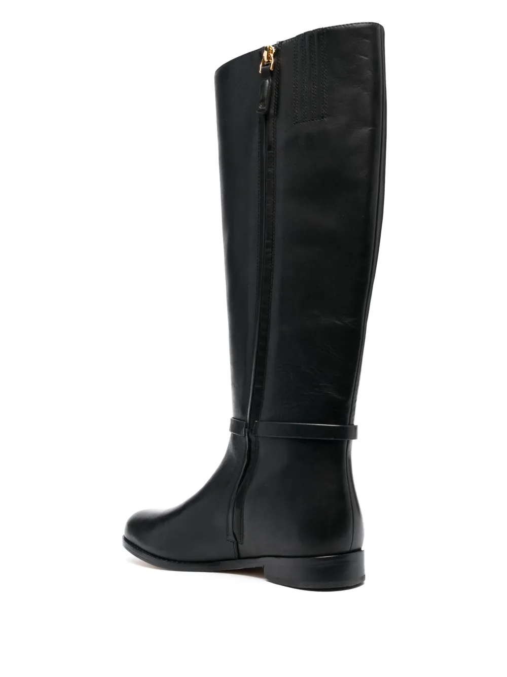 Черный, телячья кожа, золотистая фурнитура, металлический логотип, миндалевидный носок, застежка на молнии сбоку, длина по колено и низкий каблук.