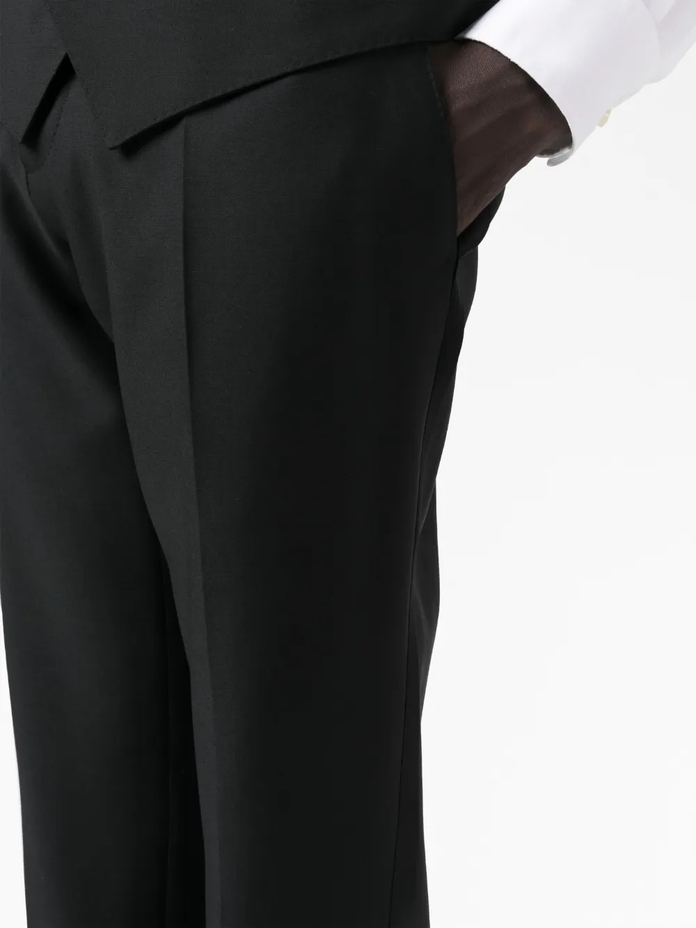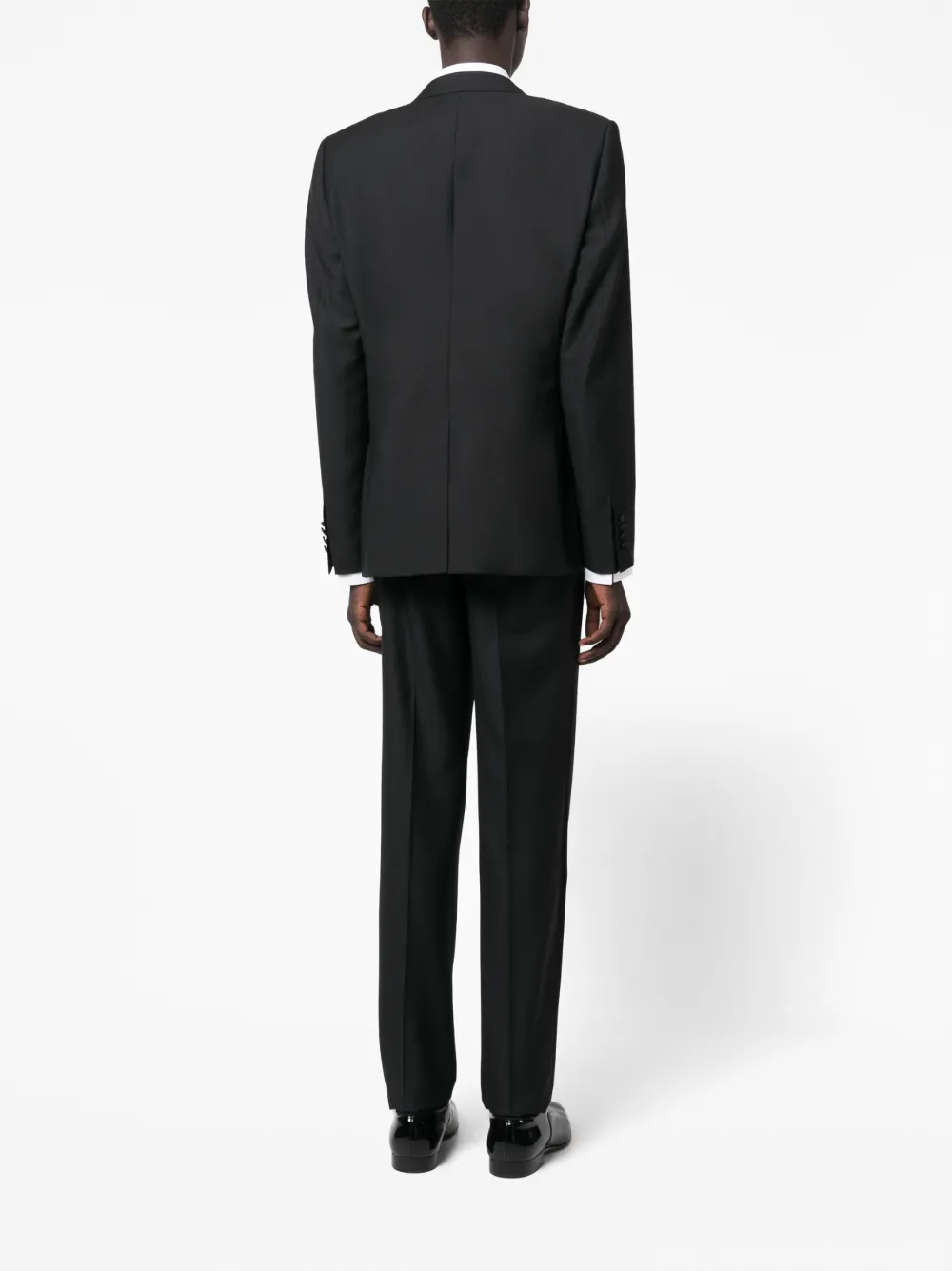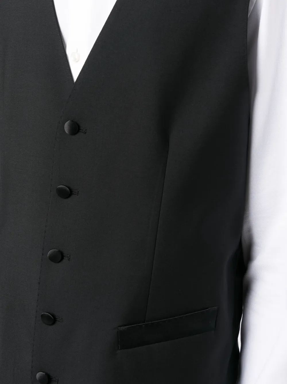 Черный, смесовая необработанная шерсть, атласная отделка, заостренные лацканы, прорезной карман на груди, застежка на пуговицах спереди, рукава с манжетами на пуговицах, обтянутые тканью пуговицы, передние карманы с клапаном, шлица по центру сзади, V-образный вырез, без рукавов, застежка на пуговицах спереди, обтянутые тканью пуговицы, два передних кармана с листочкой, петли для ремня, прямой крой, два прорезных кармана по бокам, стрелки и два прорезных кармана на пуговицах сзади.