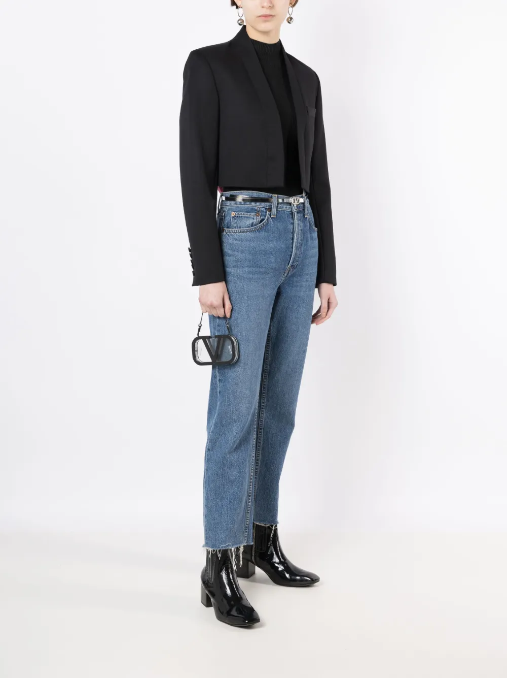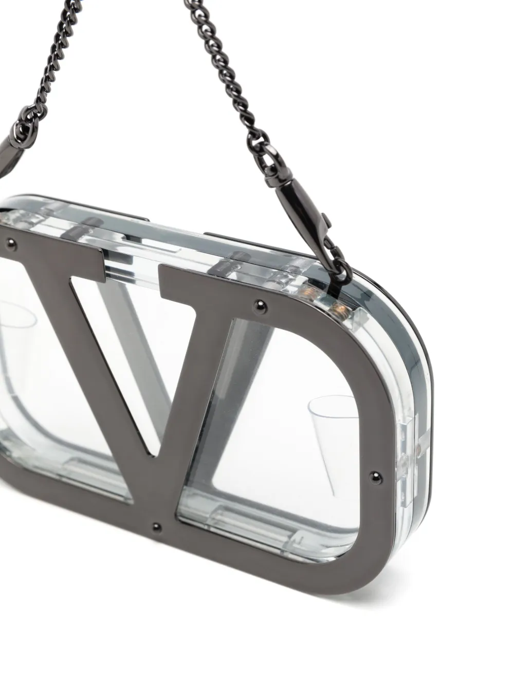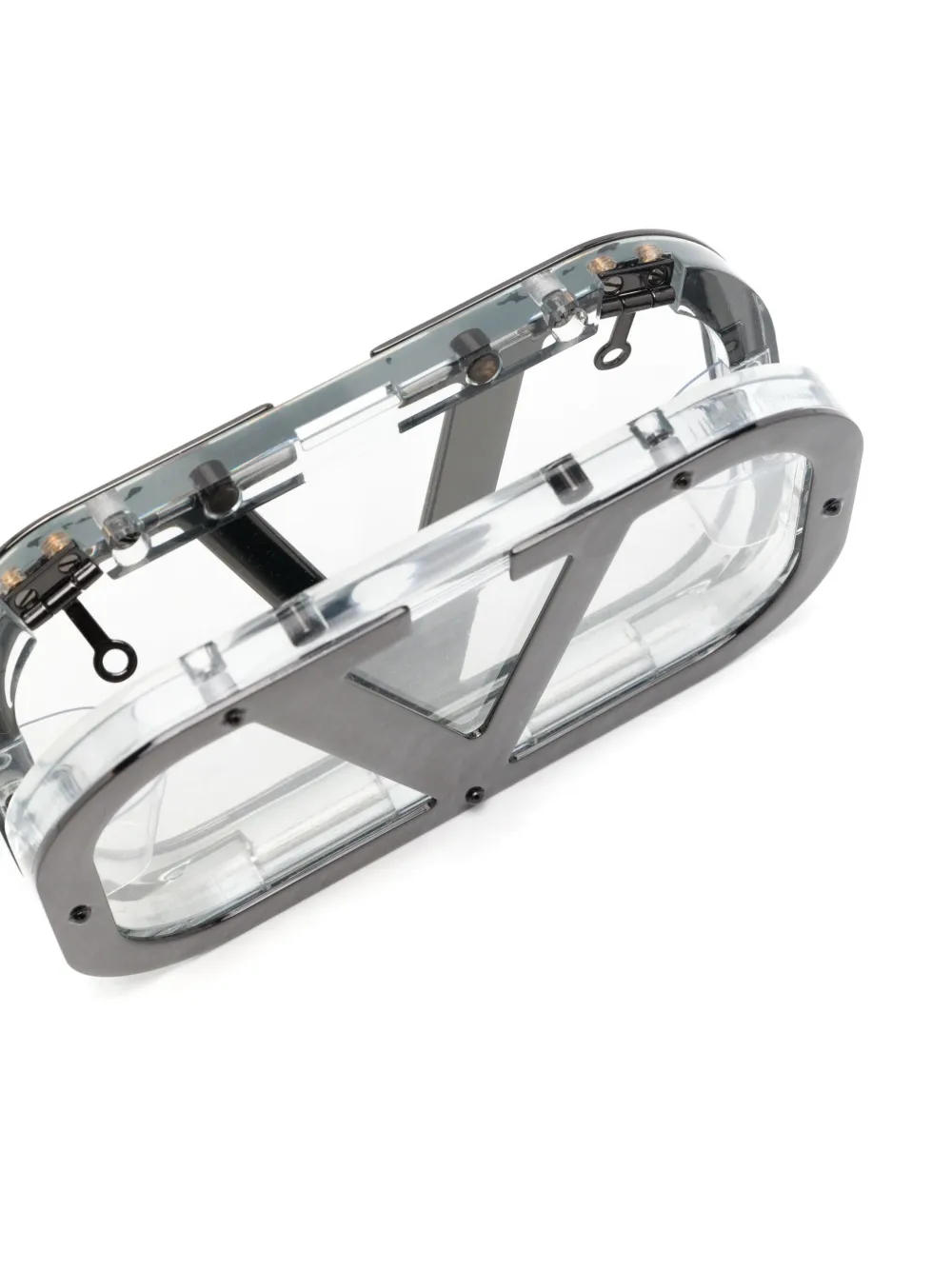 Черный, прозрачный материал, металлический логотип, съемный верхний ремень-цепочка, магнитная застежка и основное отделение.