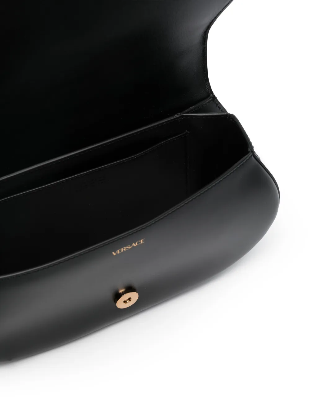 Черный, телячья кожа, гладкая текстура кожи, знаковый орнамент Greca, золотистая фурнитура, тисненый логотип внутри, откидной клапан на магните, съемный регулируемый ремень на плечо, верхняя ручка, основное отделение и внутренний прорезной карман.