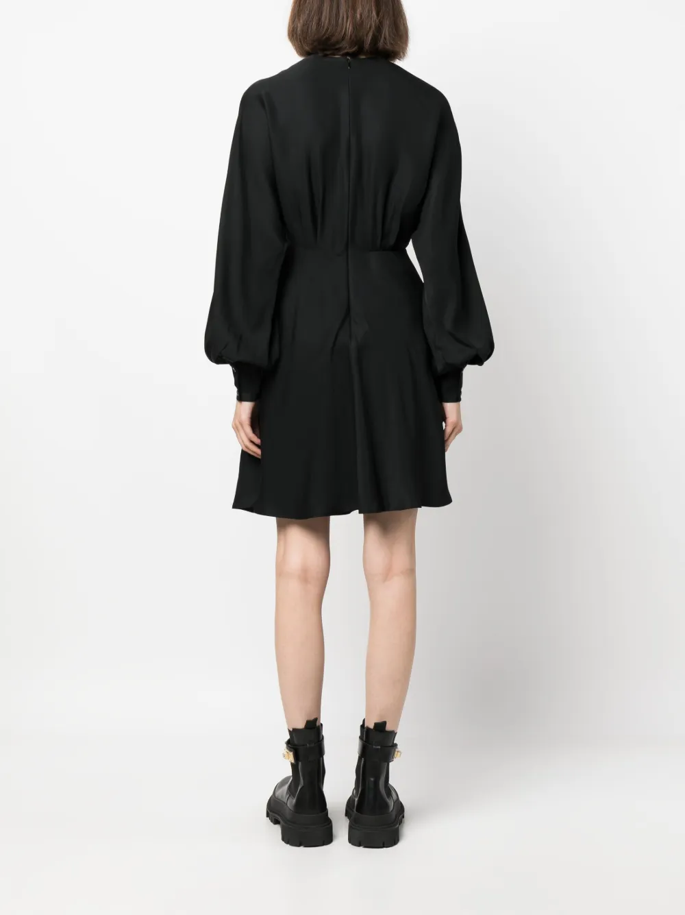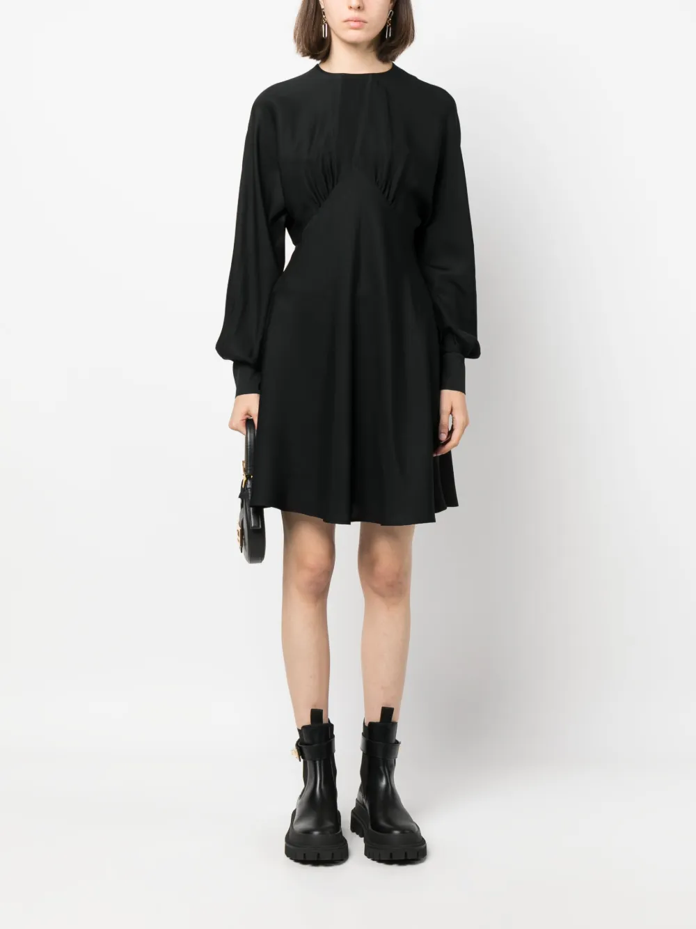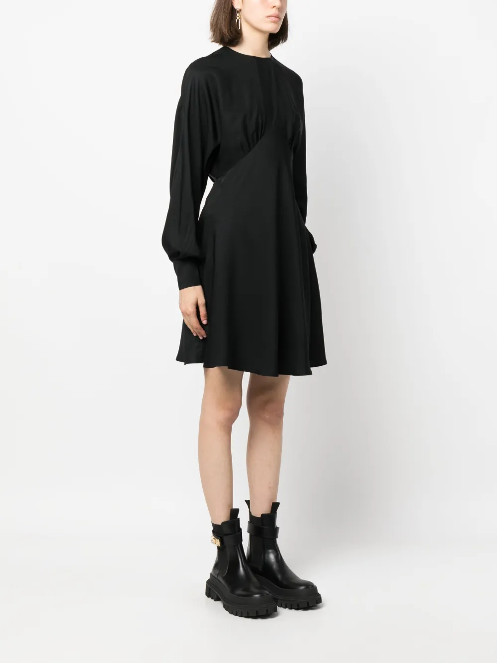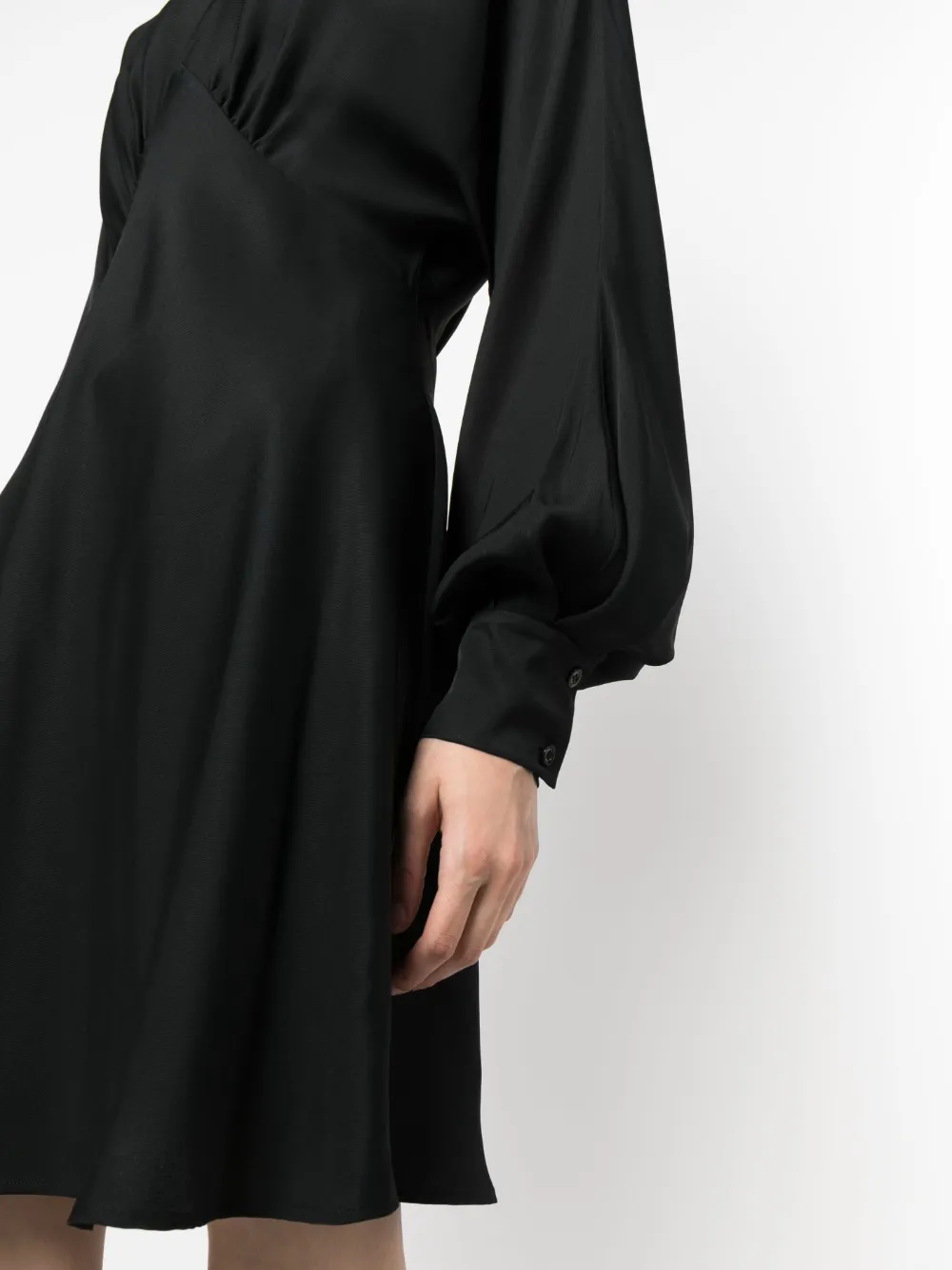 Черный, сатиновая фактура, круглый вырез, расклешенные рукава, рукава с манжетами на пуговицах, приталенный силуэт, потайная застежка на молнии сзади, расклешенная юбка и длина выше колена.