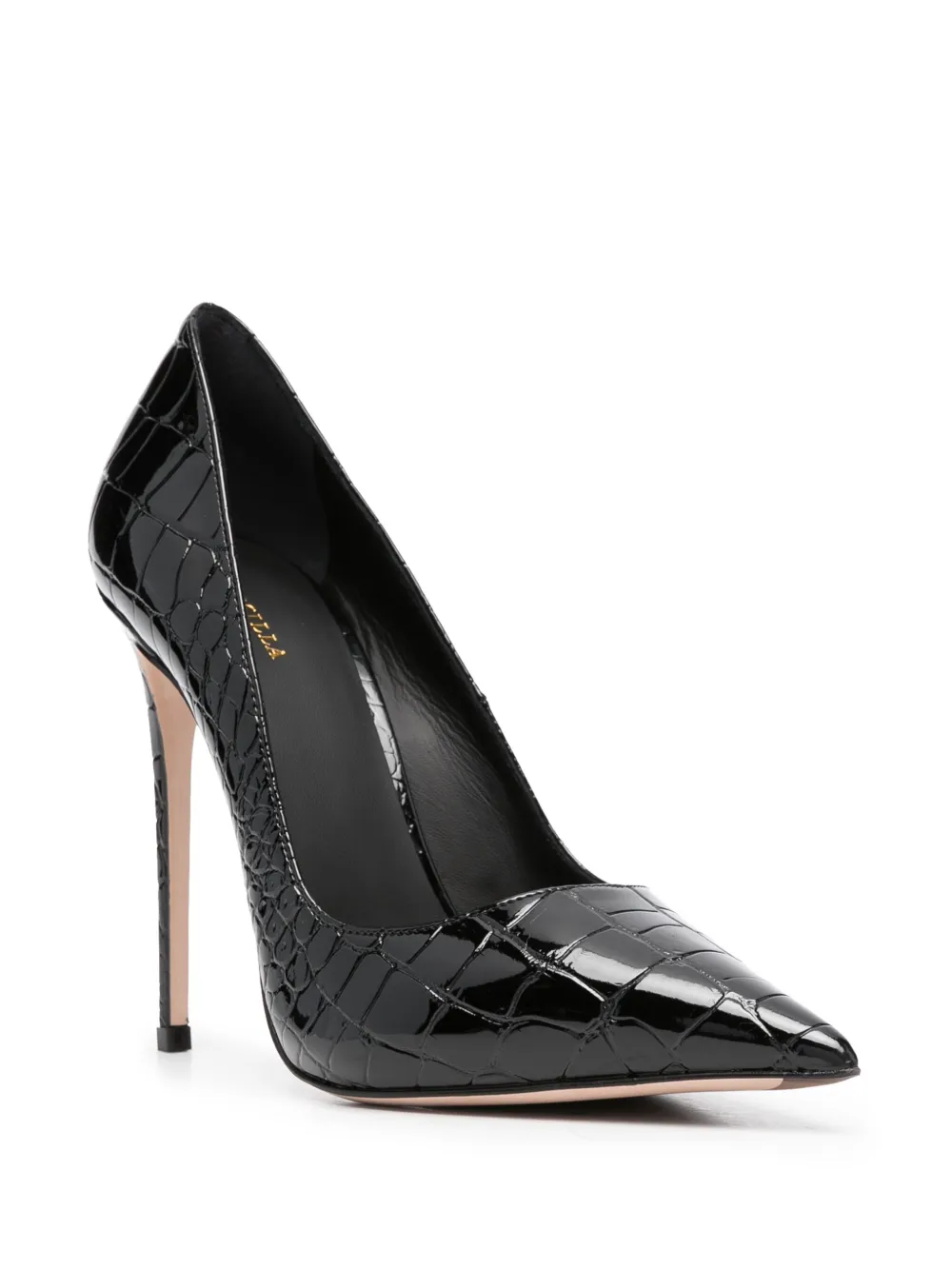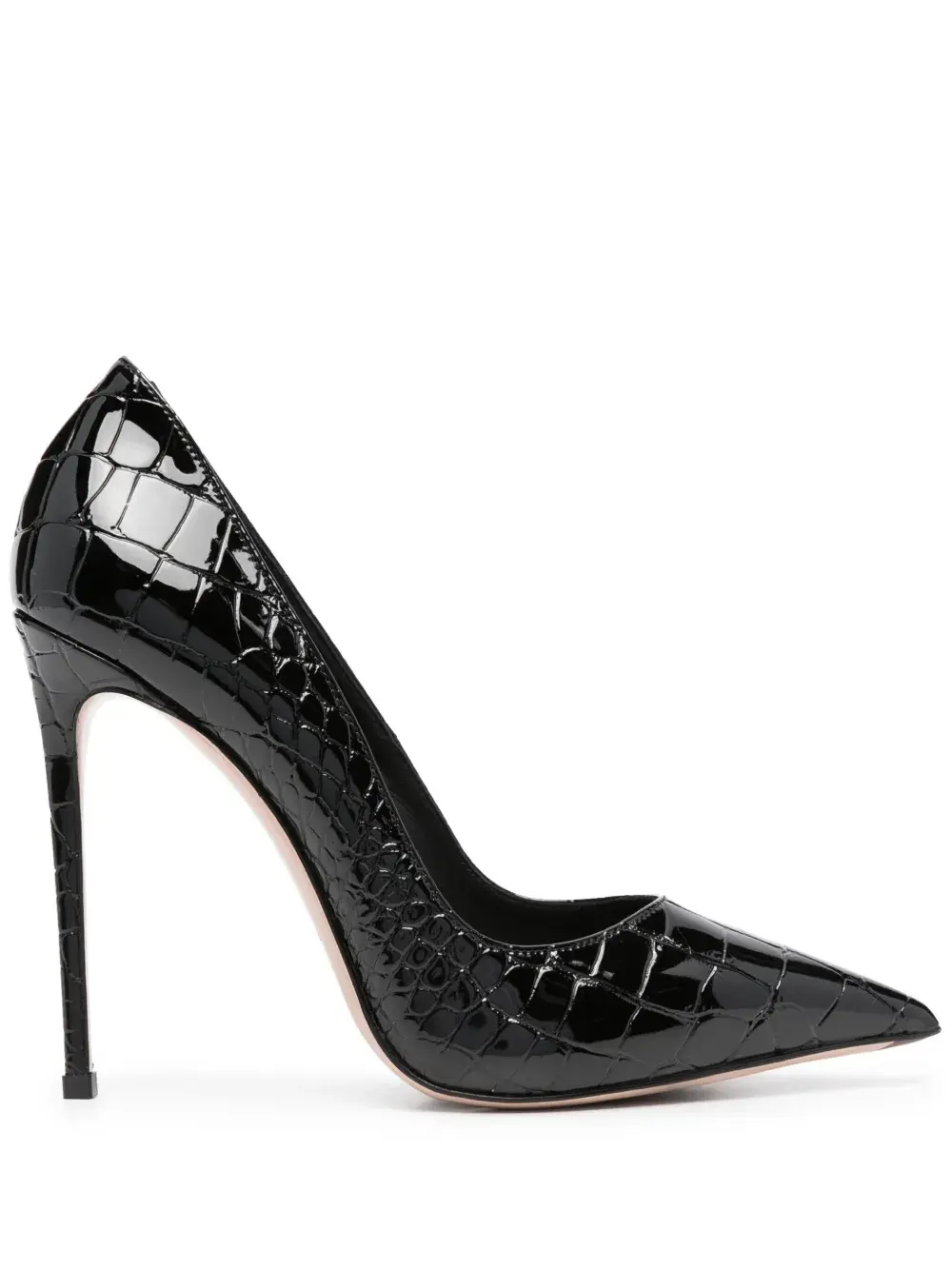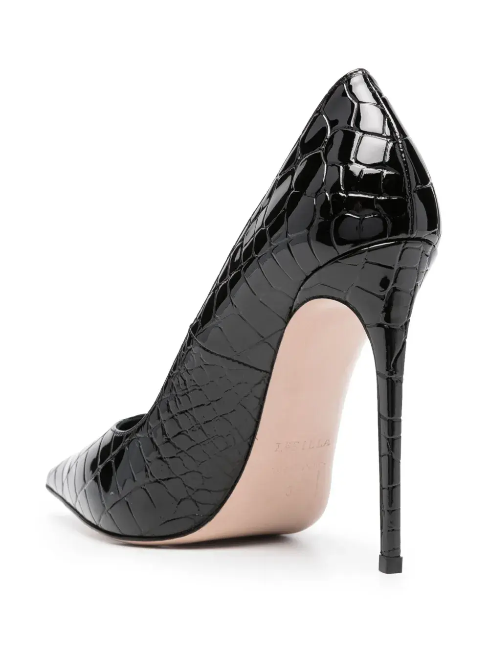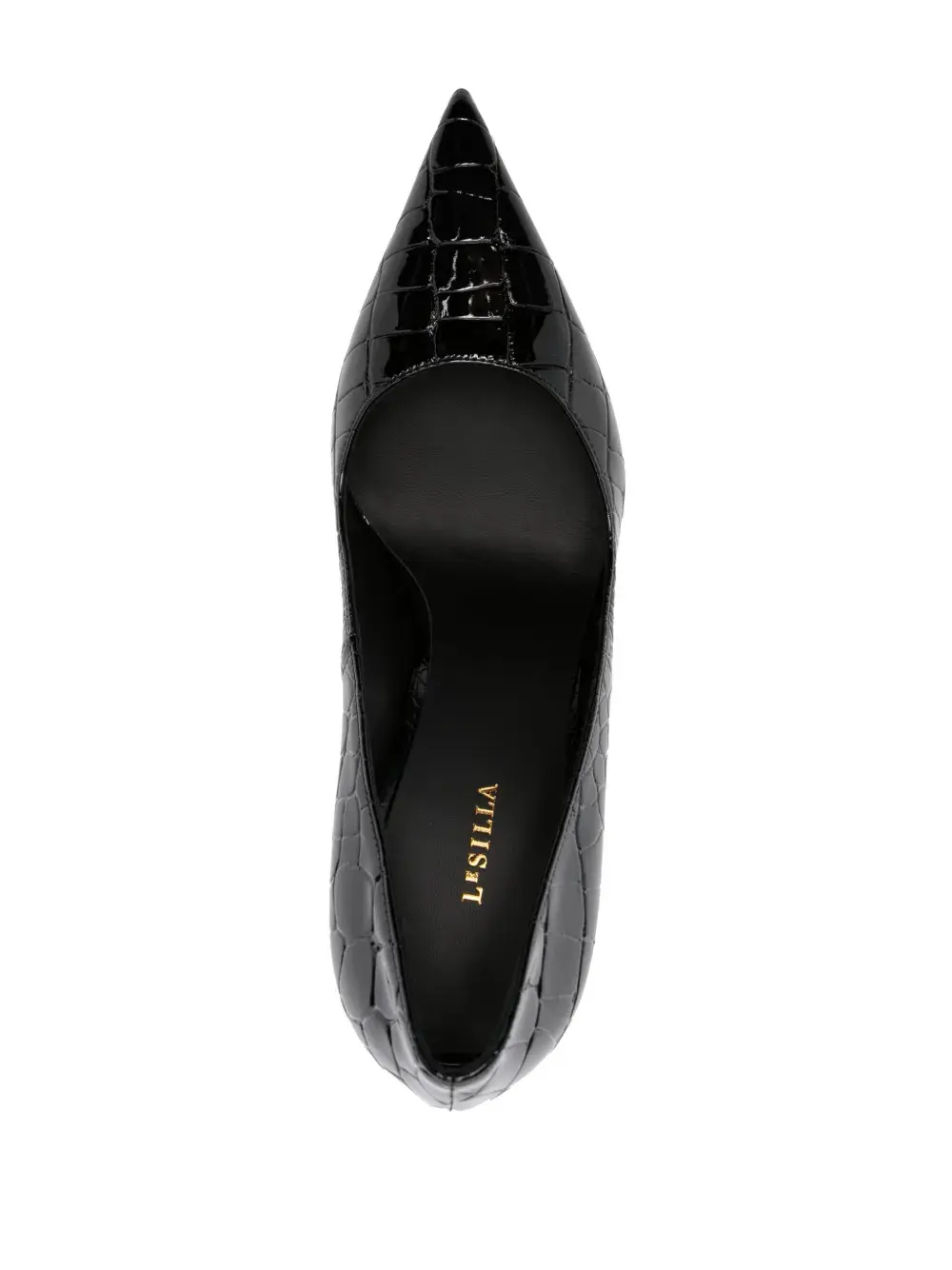 Черный, телячья кожа, тиснение под кожу крокодила, заостренный носок, модель без застежки, кожаная стелька с логотипом и каблук на высокой шпильке.