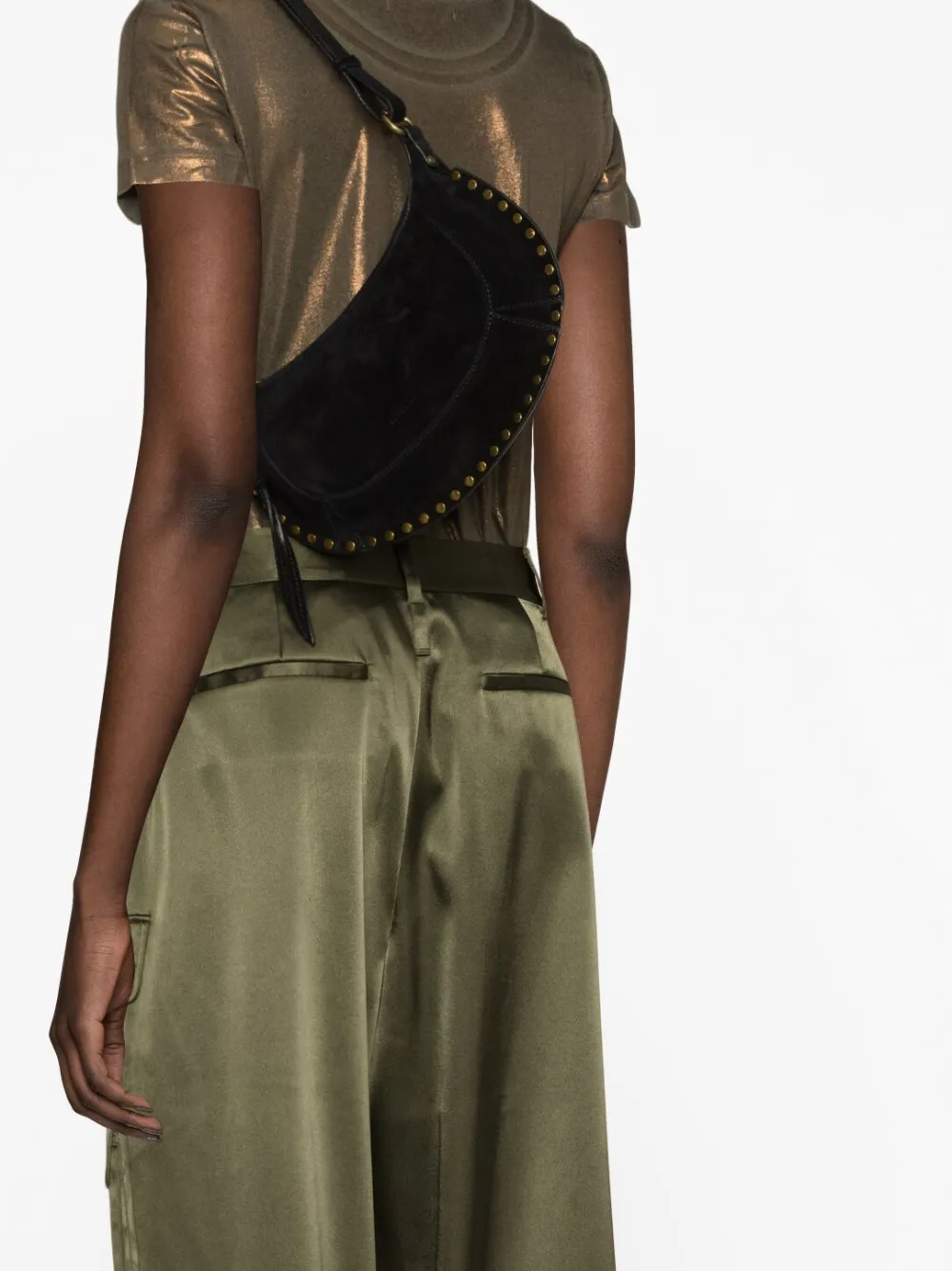 Черный, замша из телячьей кожи, золотистые заклепки, тисненый логотип спереди, застежка на молнии сверху, съемный регулируемый ремень на плечо, основное отделение и внутренний прорезной карман.