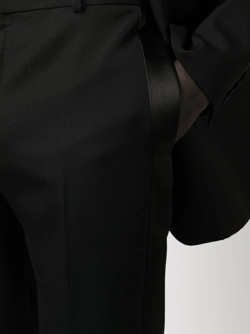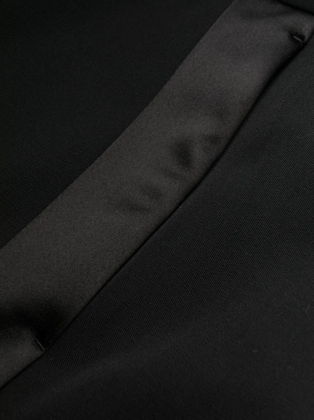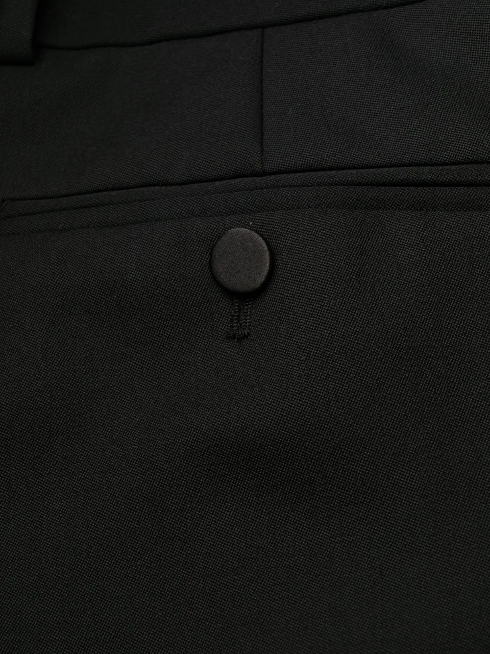 Черный, шерсть, облегающий крой, атласная отделка, средняя посадка, петли для ремня, потайная застежка спереди, два прорезных кармана по бокам и два прорезных кармана на пуговицах сзади.