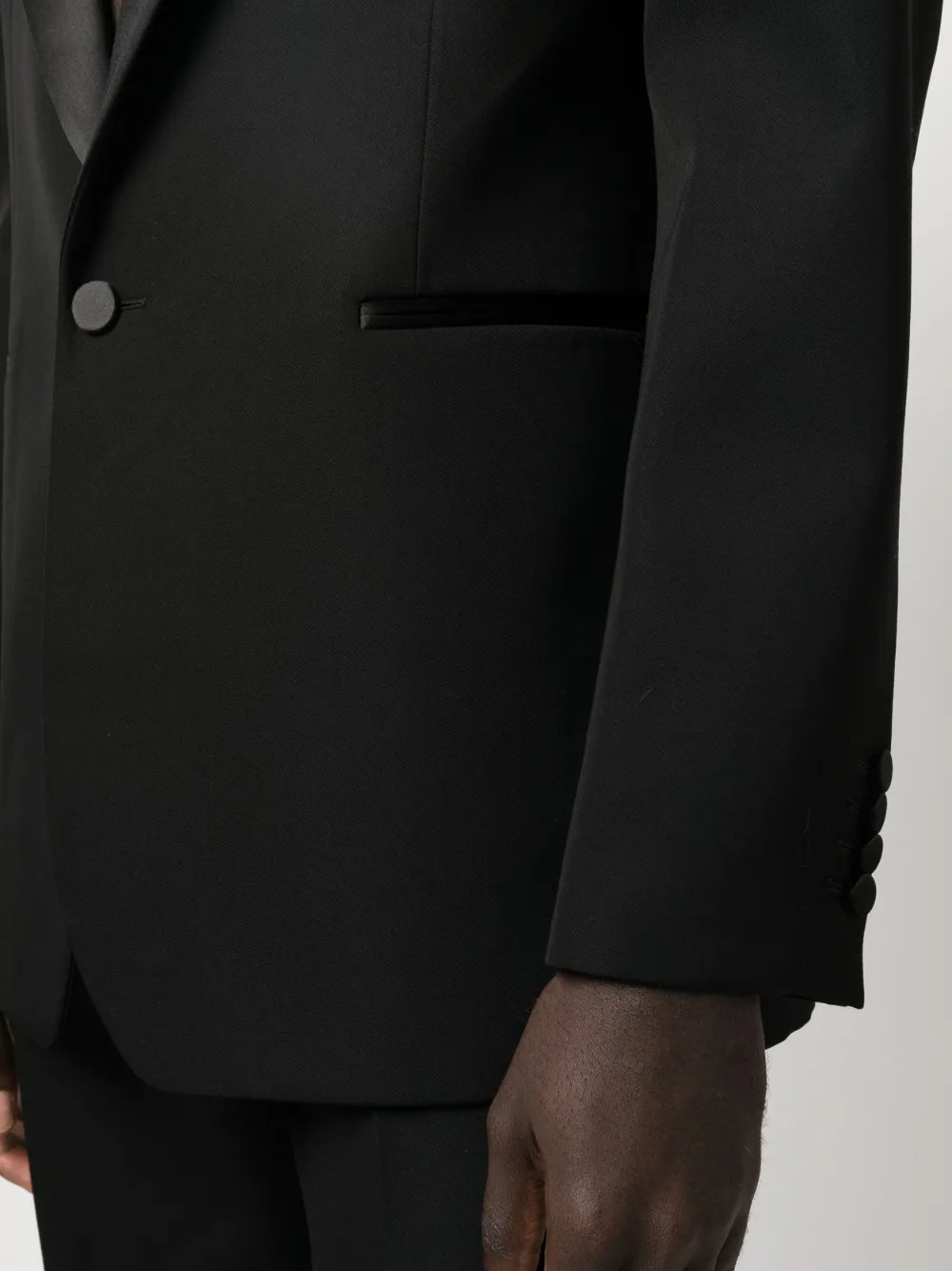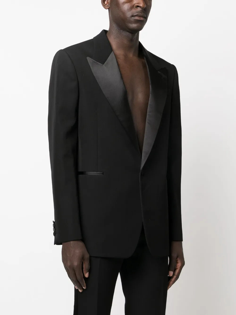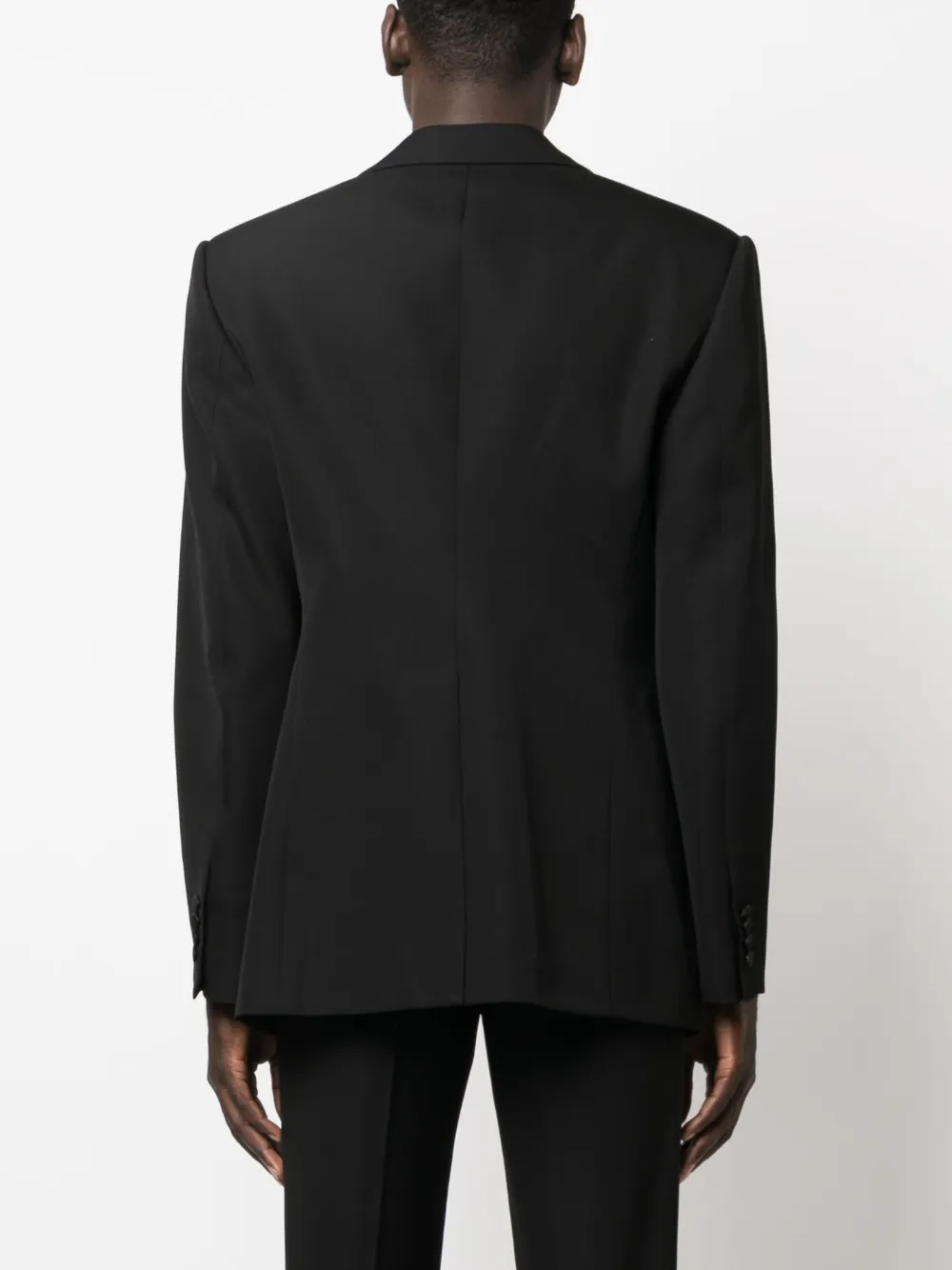 Черный, шерсть, заостренные лацканы, застежка на пуговицах спереди, длинные рукава, манжеты на пуговицах и два прорезных кармана сбоку.