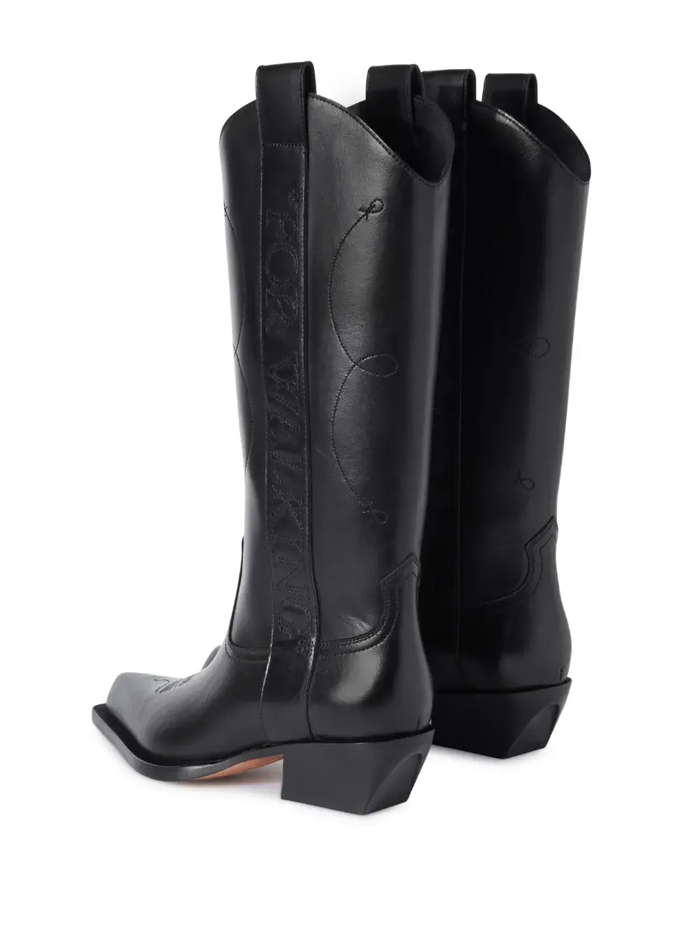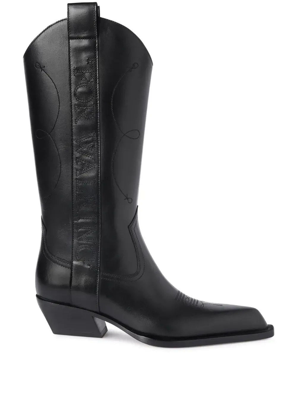 Черный, кожа, вставки, петля для подтягивания с логотипом, заостренный носок, кубинский каблук и длина до середины голени.