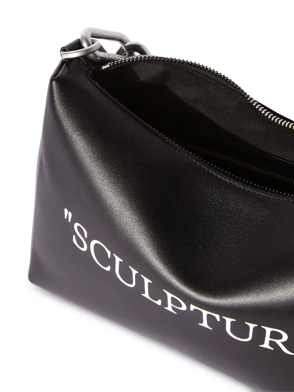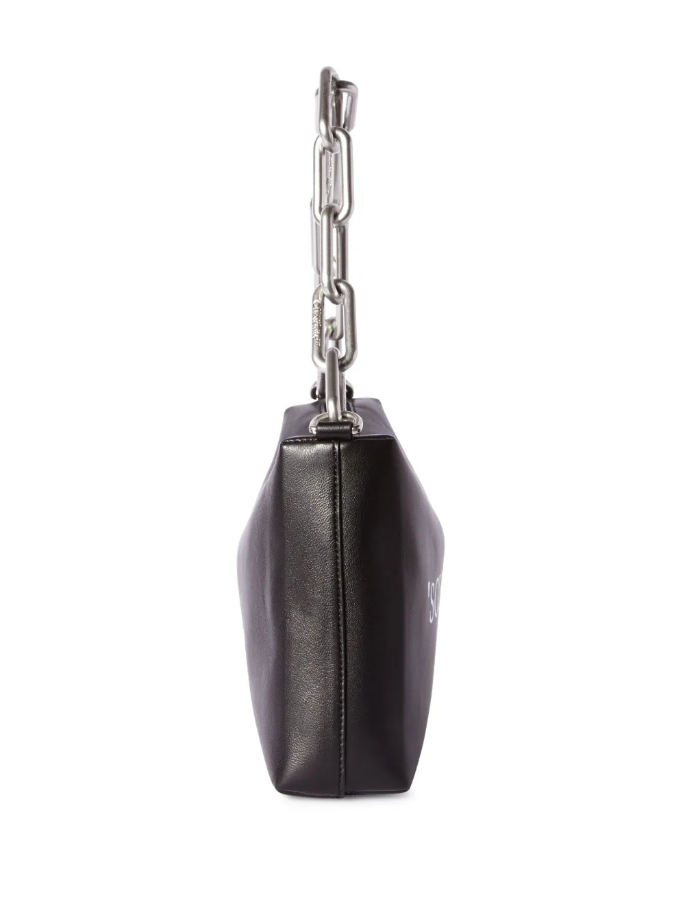 Черный, телячья кожа, принт с надписью спереди, застежка на молнии сверху, основное отделение, внутренний карман на молнии, ремешок-цепочка на плечо и серебристая фурнитура.