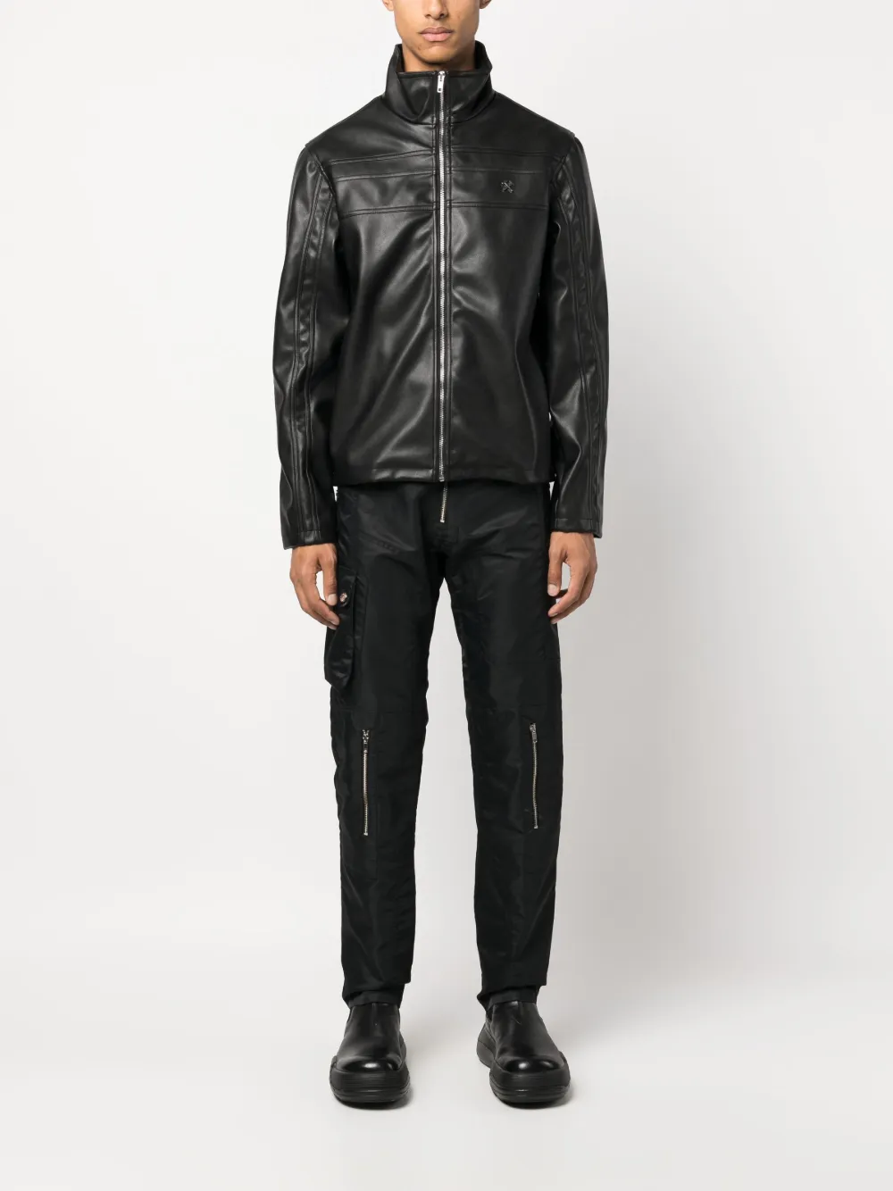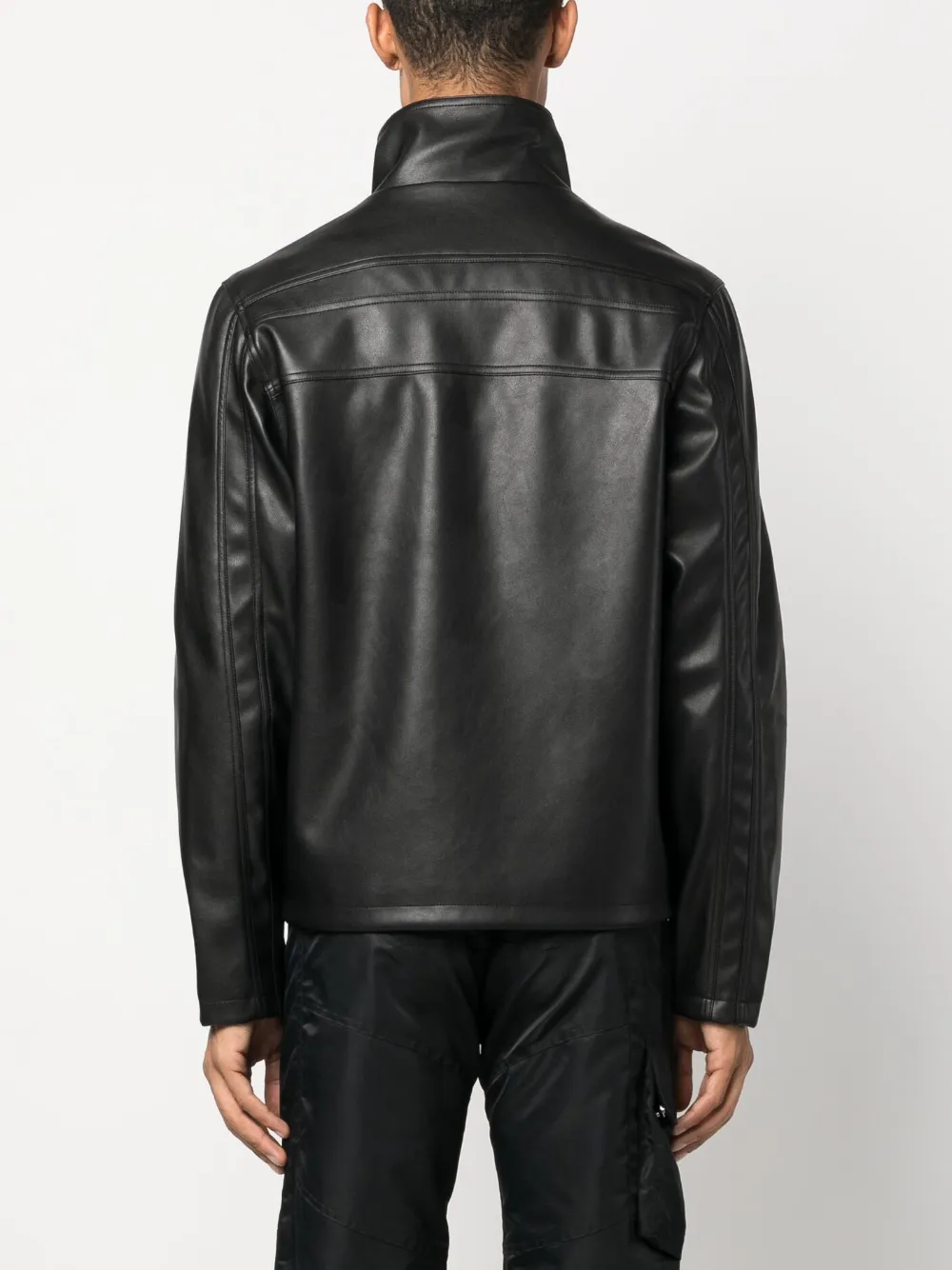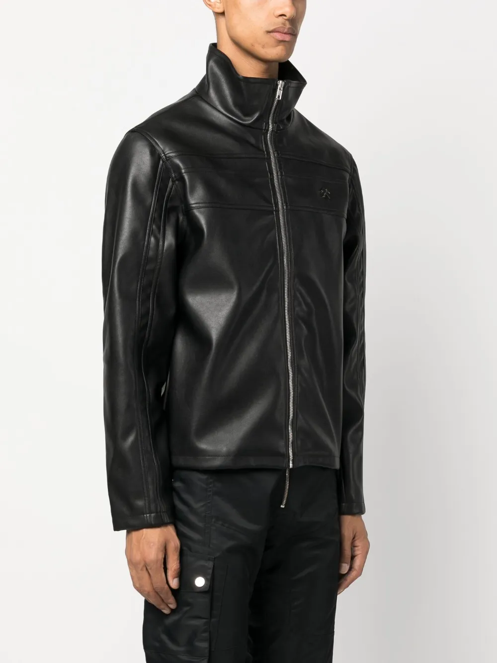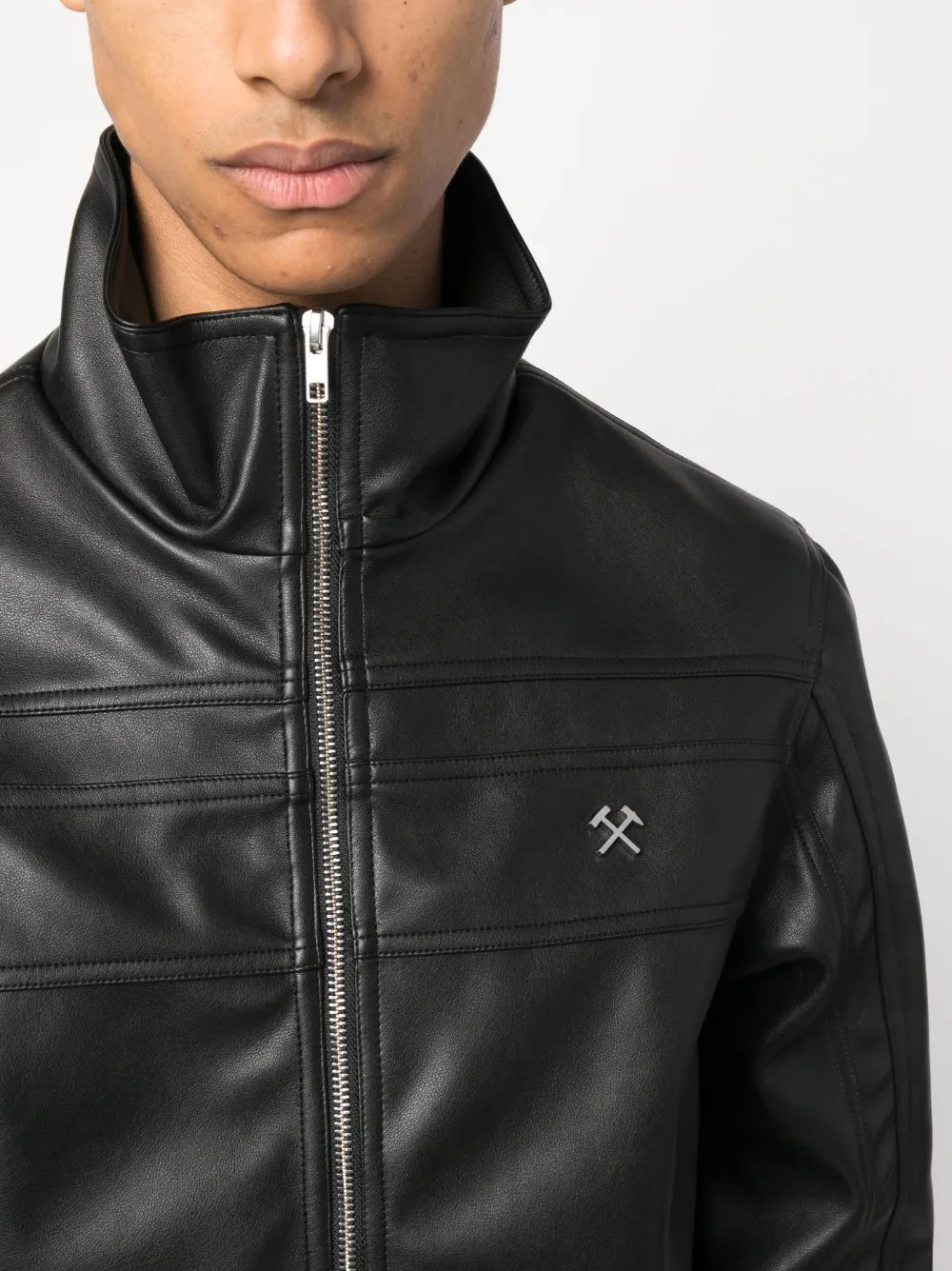 Черный, искусственная кожа, серебристый металлический логотип, высокий воротник, застежка на молнии спереди и длинные рукава. Узнать больше о том, какие товары получают отметку «Ответственный выбор», можно из материала «Как мы оцениваем экологичность и этичность».