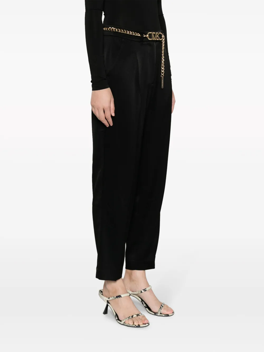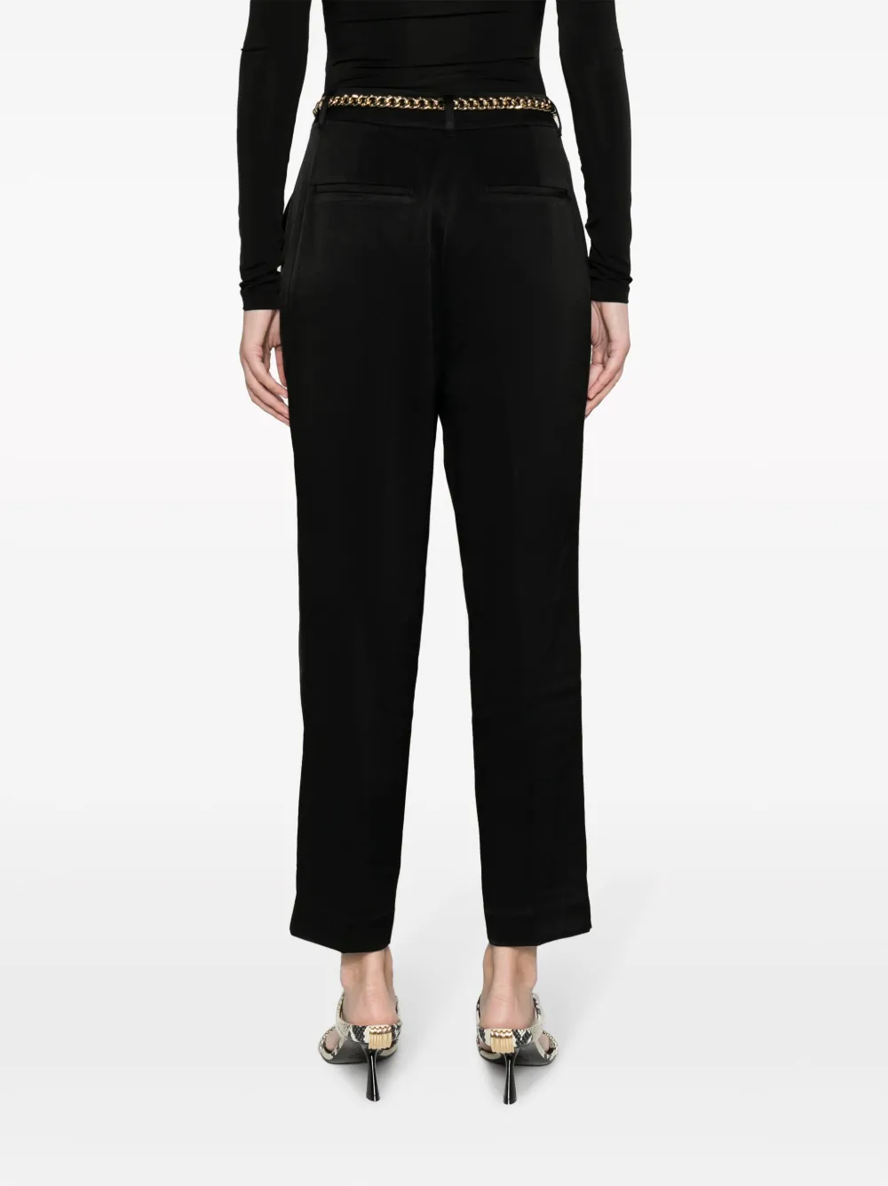 Черный, золотистый металлический логотип, цепочка, складки, завышенная талия, потайная застежка спереди, петли для ремня, два прорезных кармана по бокам, два кармана с листочкой сзади и зауженный крой.