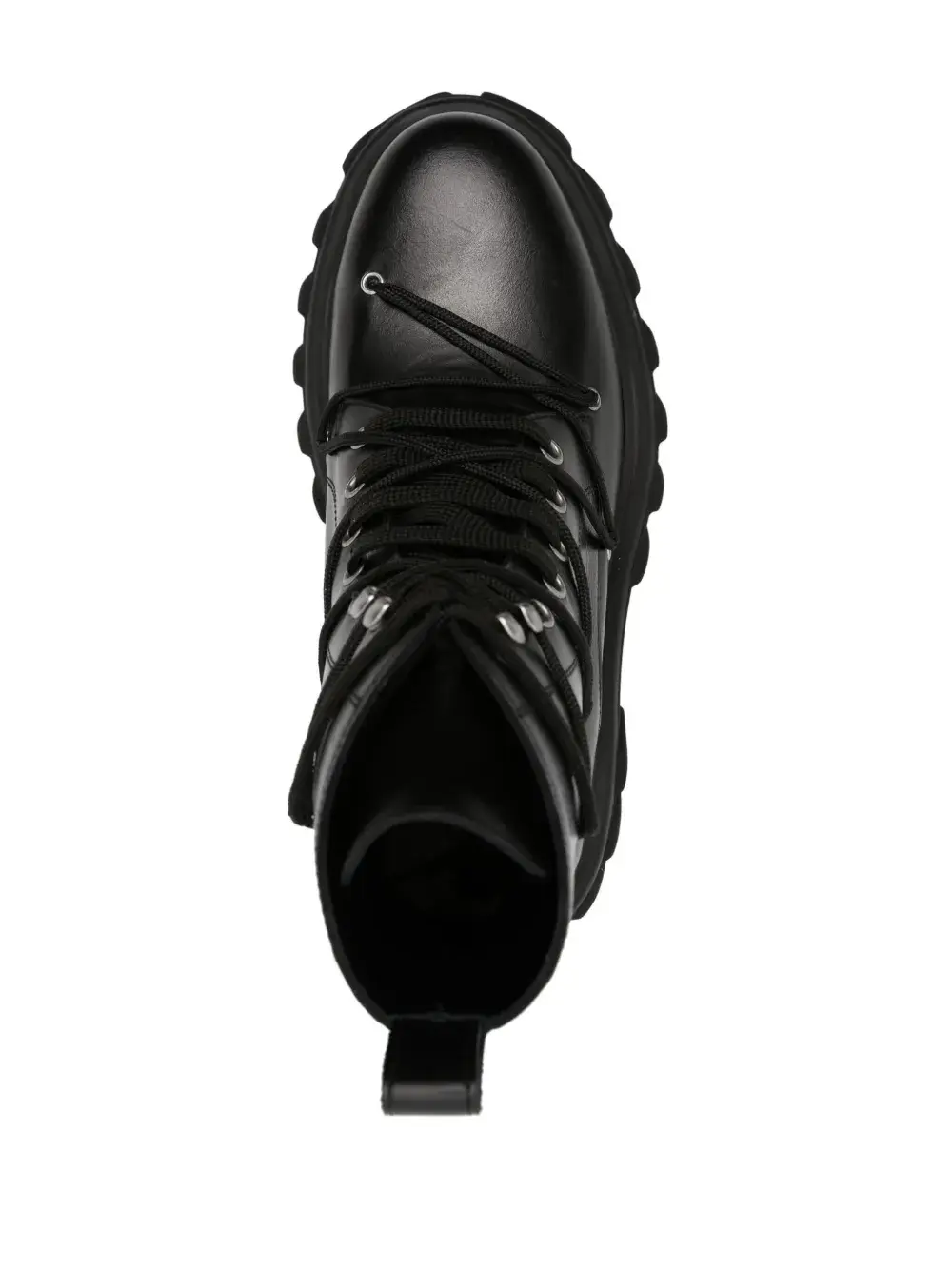 Черный, телячья кожа, шнуровка спереди, закругленный носок, петля для подтягивания сзади, массивная резиновая подошва и высота по щиколотку.