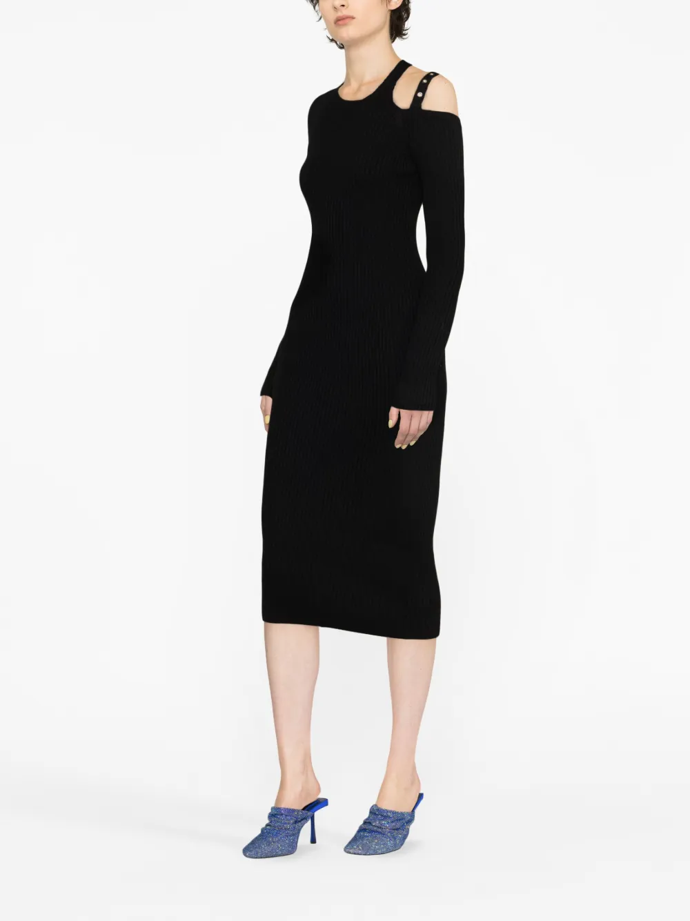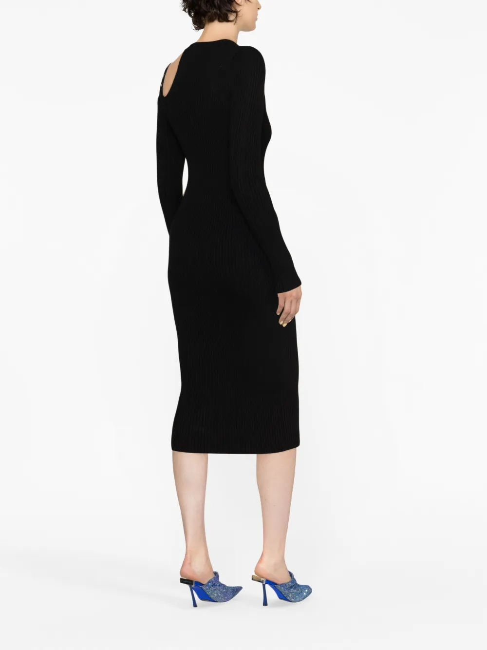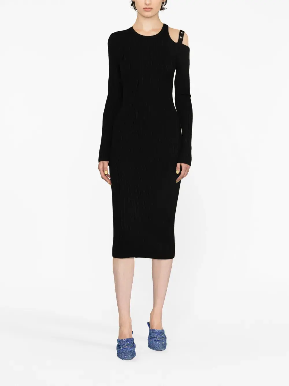 Черный, трикотаж в рубчик, вырезные детали, люверсы, круглый вырез, длинные рукава и длина миди.