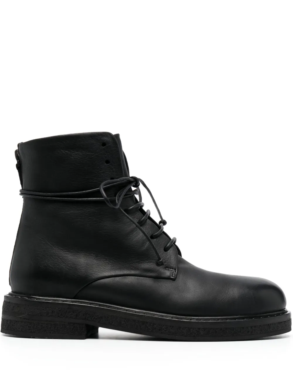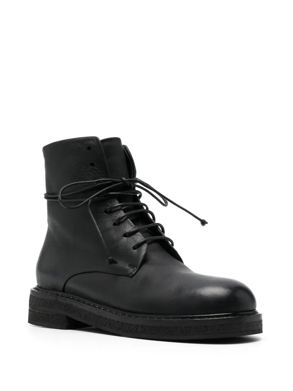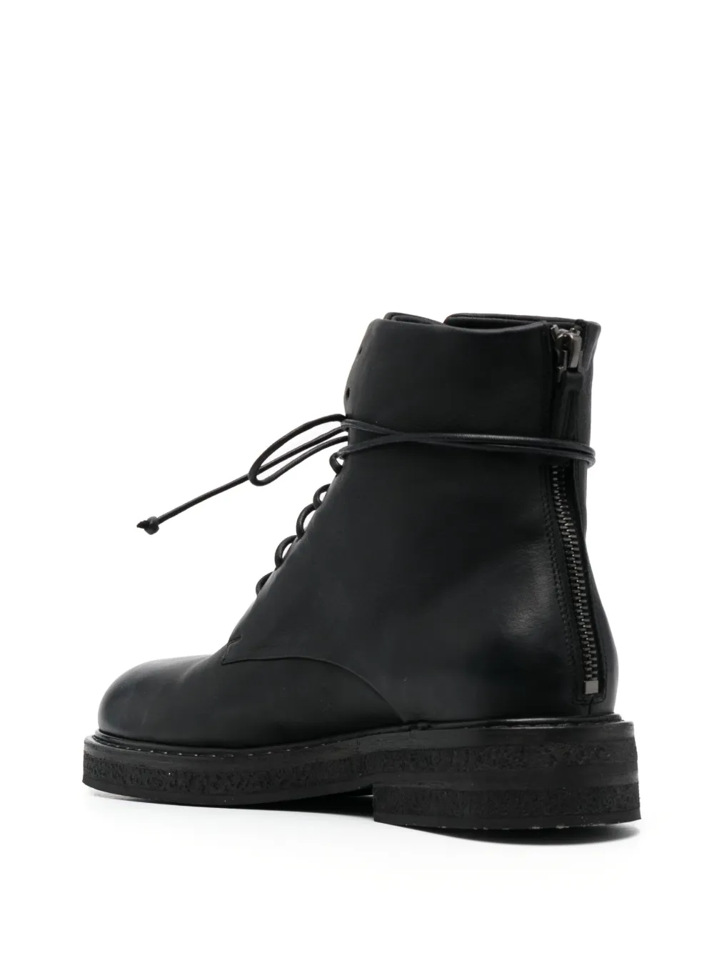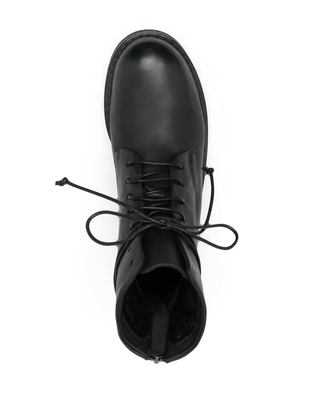Черный, телячья кожа, шнуровка спереди, застежка на молнии сзади, стелька с логотипом, блочный каблук средней высоты и закругленный носок.