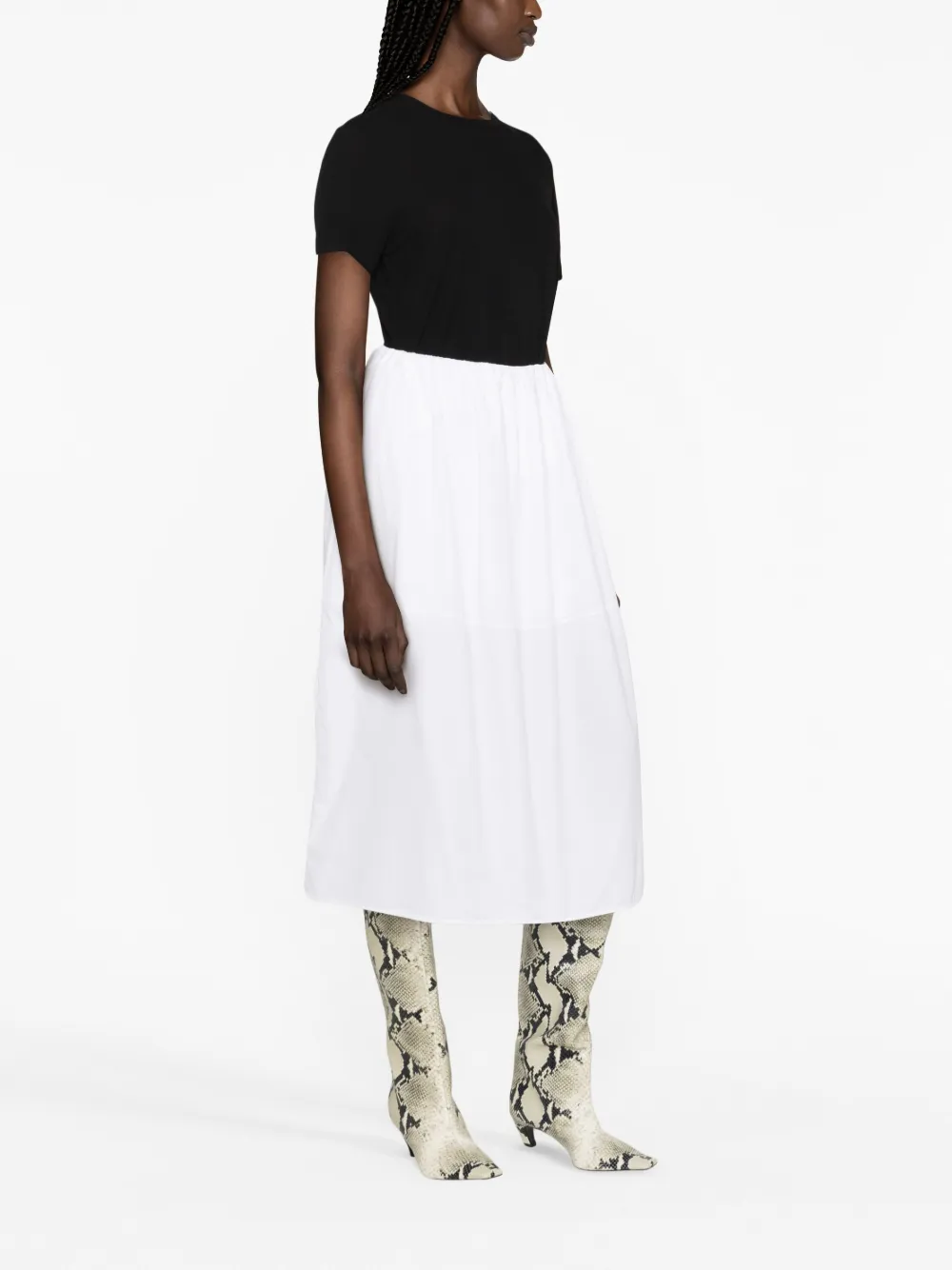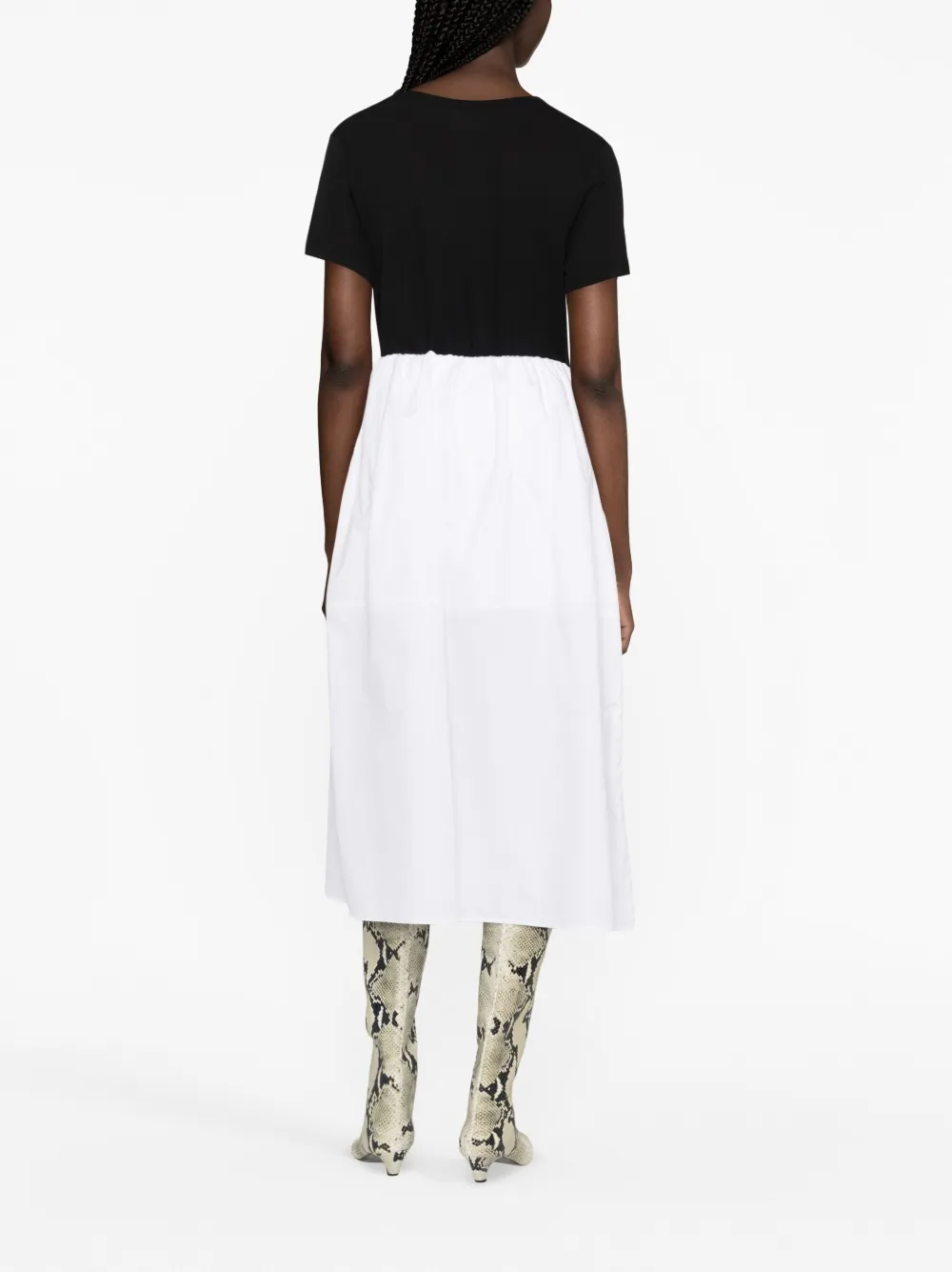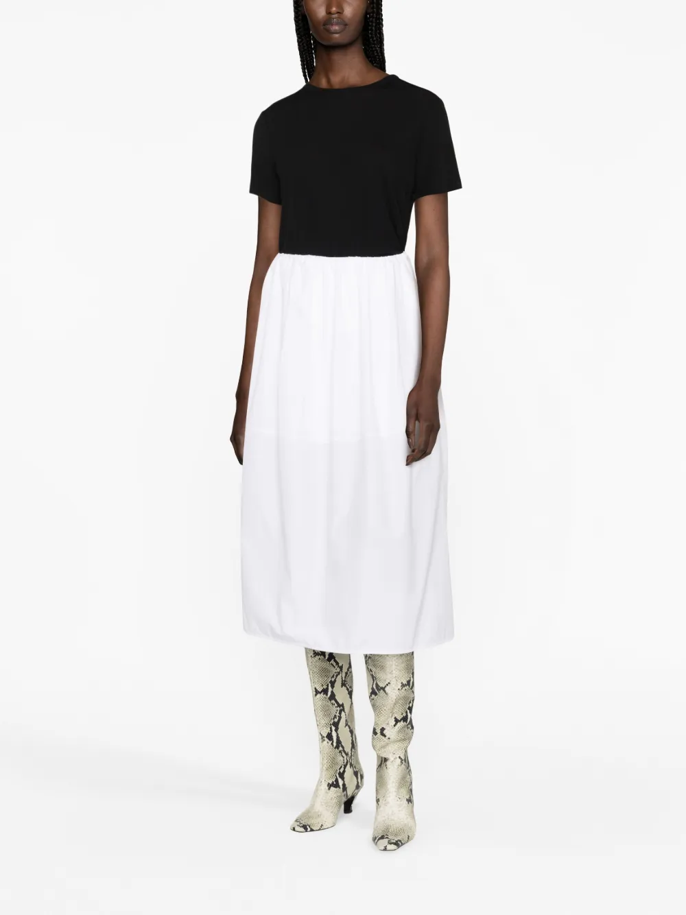 Черный, матовое покрытие, круглый вырез, короткие рукава и прямой подол.