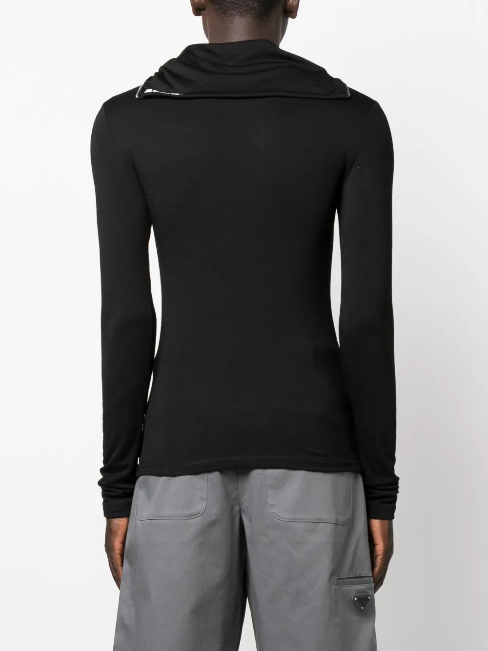 Черный, принт с логотипом на воротнике, высокий воротник, застежка на молнии спереди, длинные рукава и прямой подол.