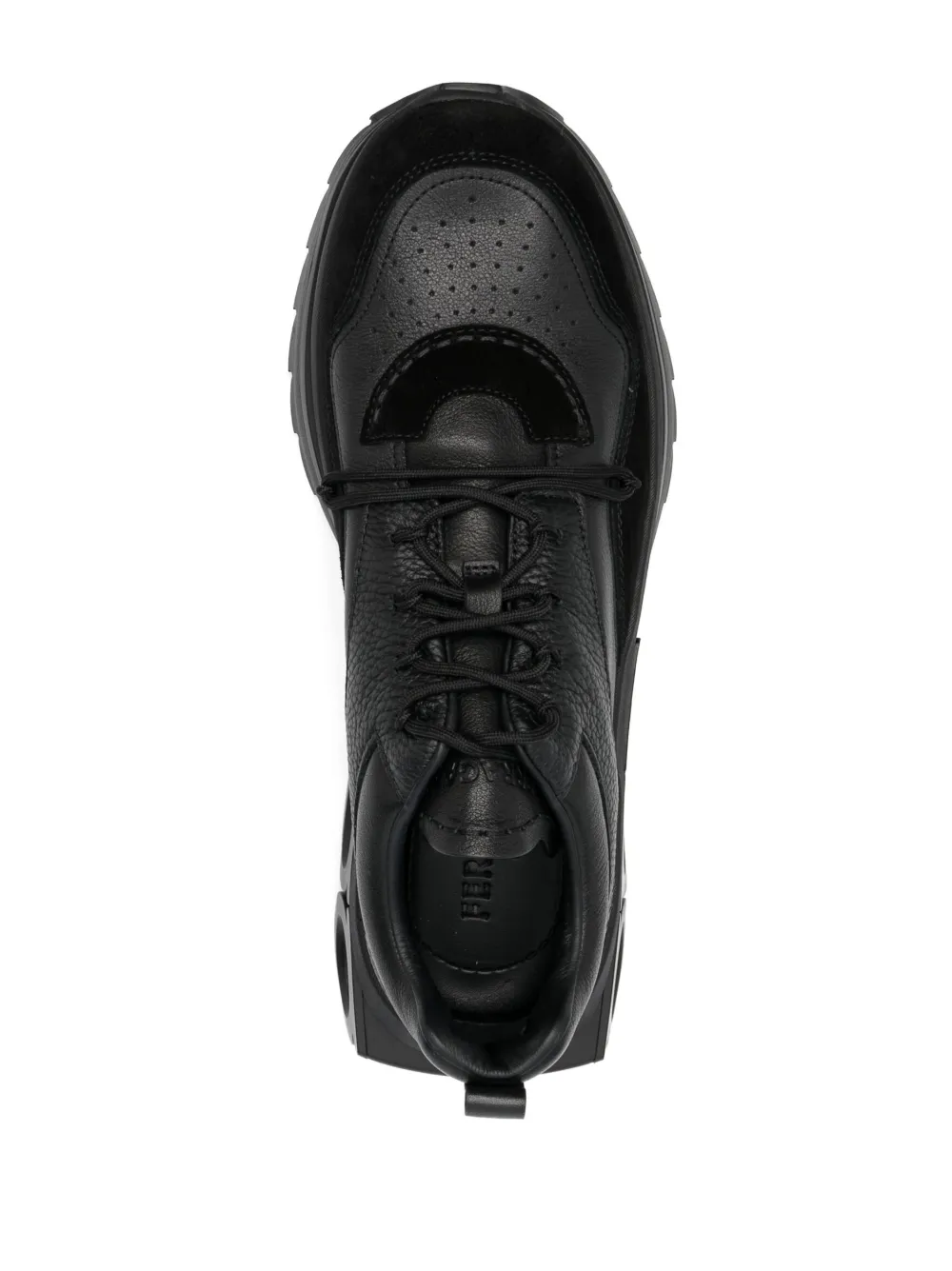 Черный, телячья кожа, гладкая текстура кожи, зернистая текстура, вставки, перфорированный носок, тисненый логотип на язычке, петля для подтягивания сзади, стелька с логотипом, закругленный носок, шнуровка спереди и массивная резиновая подошва.