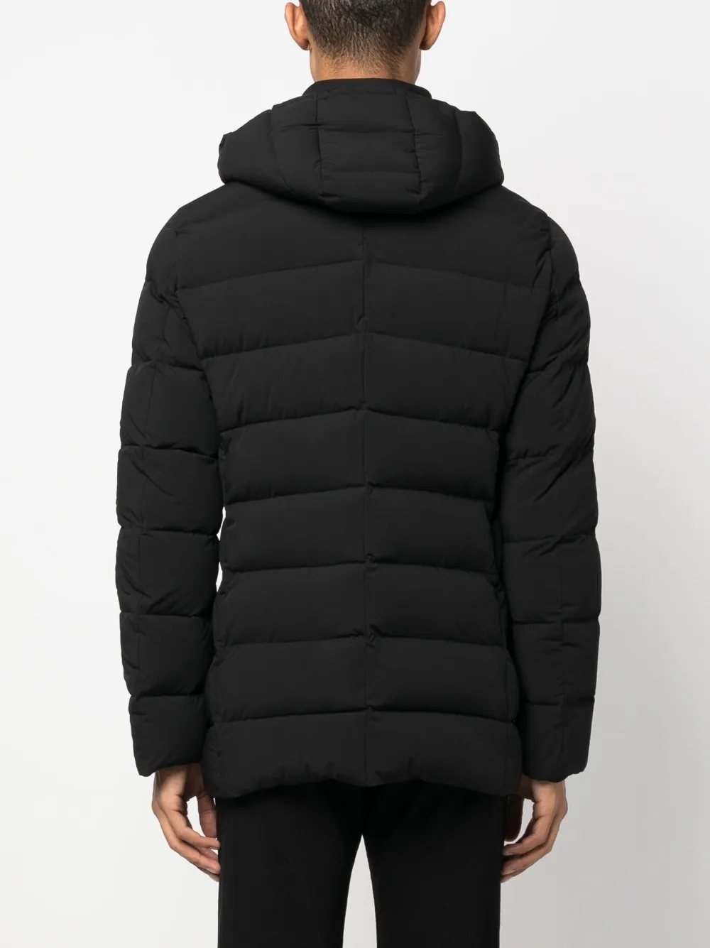 Черный, наполнитель из смеси пуха и пера, дутый материал, стеганая модель, классический капюшон, застежка на молнии и пуговице спереди, длинные рукава, два прорезных кармана по бокам и прямой подол.