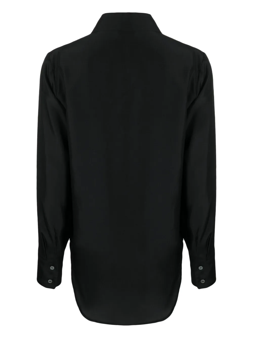 Черный, шелк, классический воротник, застежка на пуговицах спереди, длинные рукава, манжеты на пуговицах и закругленный подол.