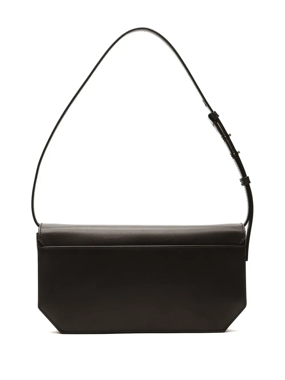 Черный, кожа, трапециевидная форма, металлический логотип, регулируемый ремень на плечо, основное отделение, нашивка с логотипом внутри и внутренние накладные карманы.