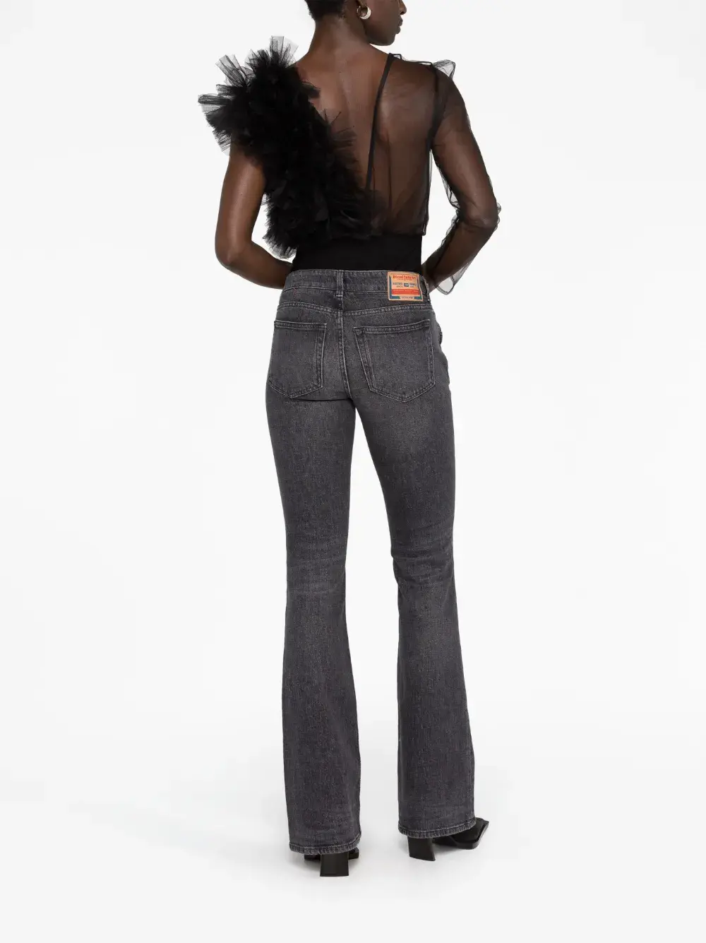Черный, полупрозрачный дизайн, вставки с оборками, V-образный вырез и один длинный рукав.