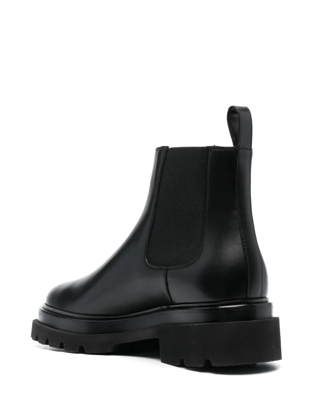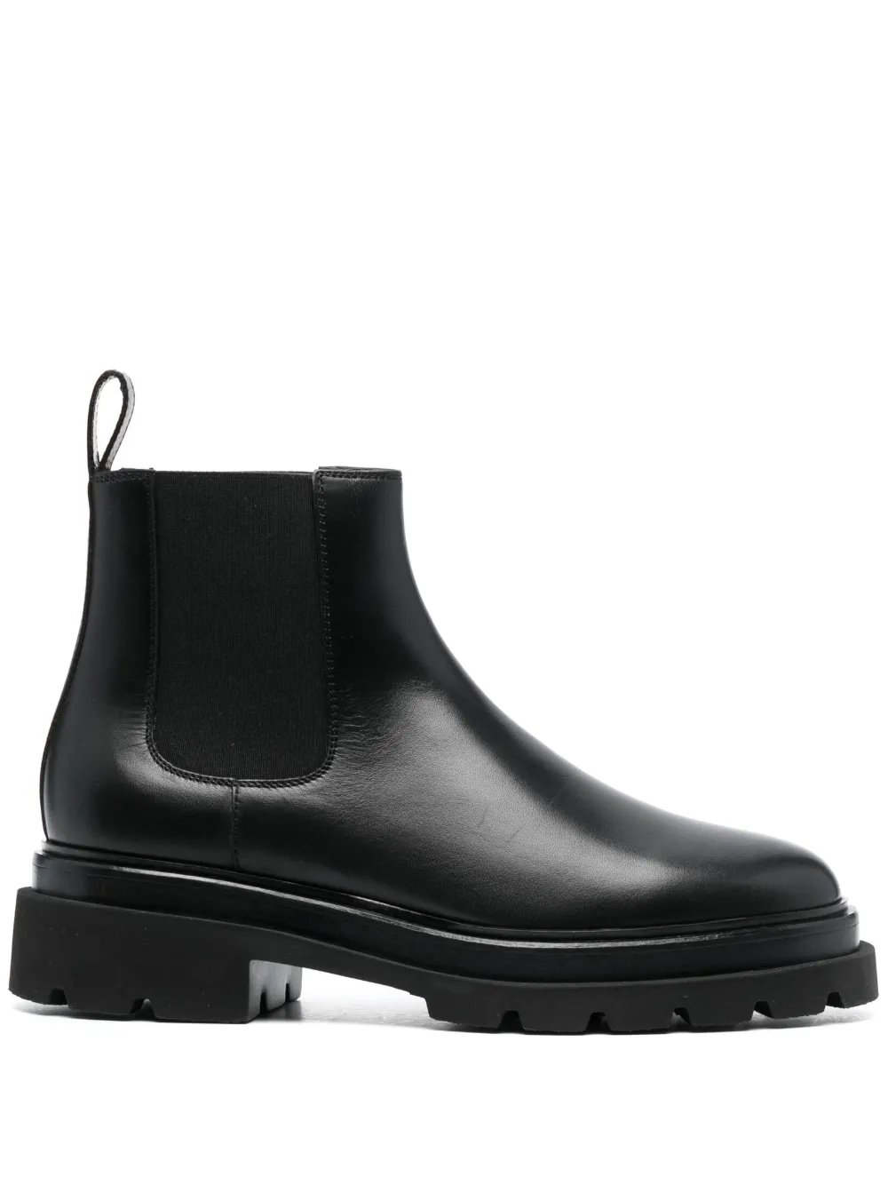 Черный, телячья кожа, петля для подтягивания сзади, закругленный носок, модель без застежки, эластичные манжеты и рифленая резиновая подошва.