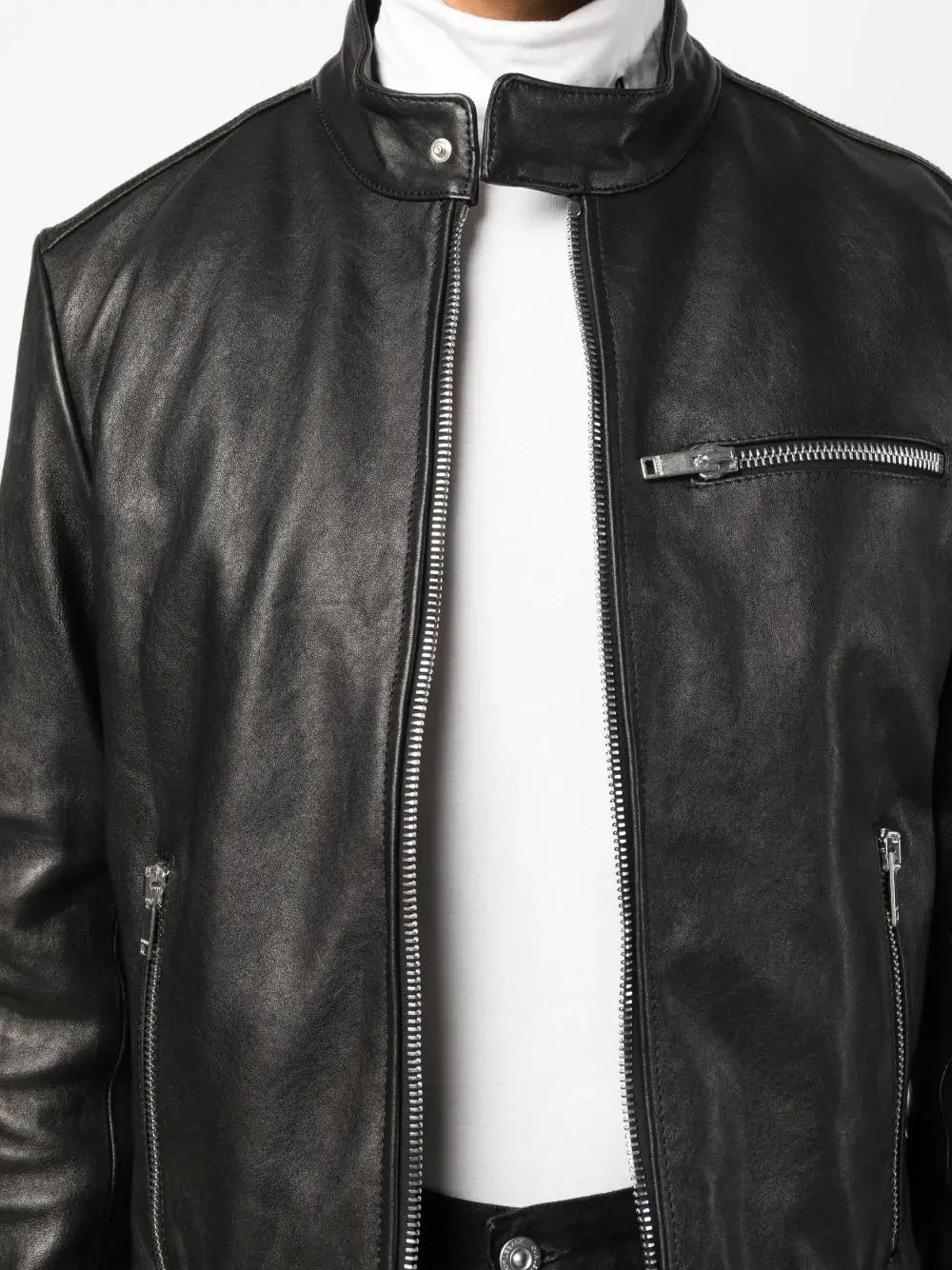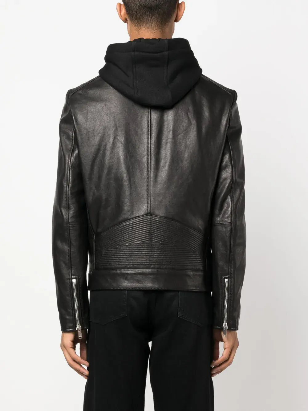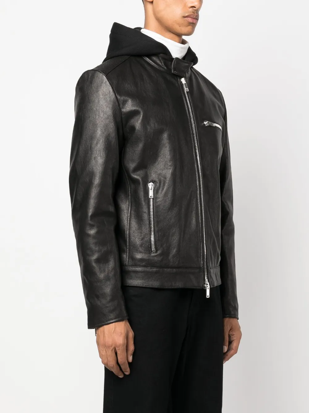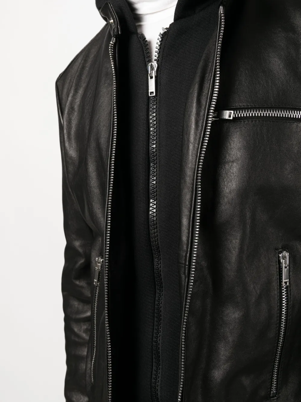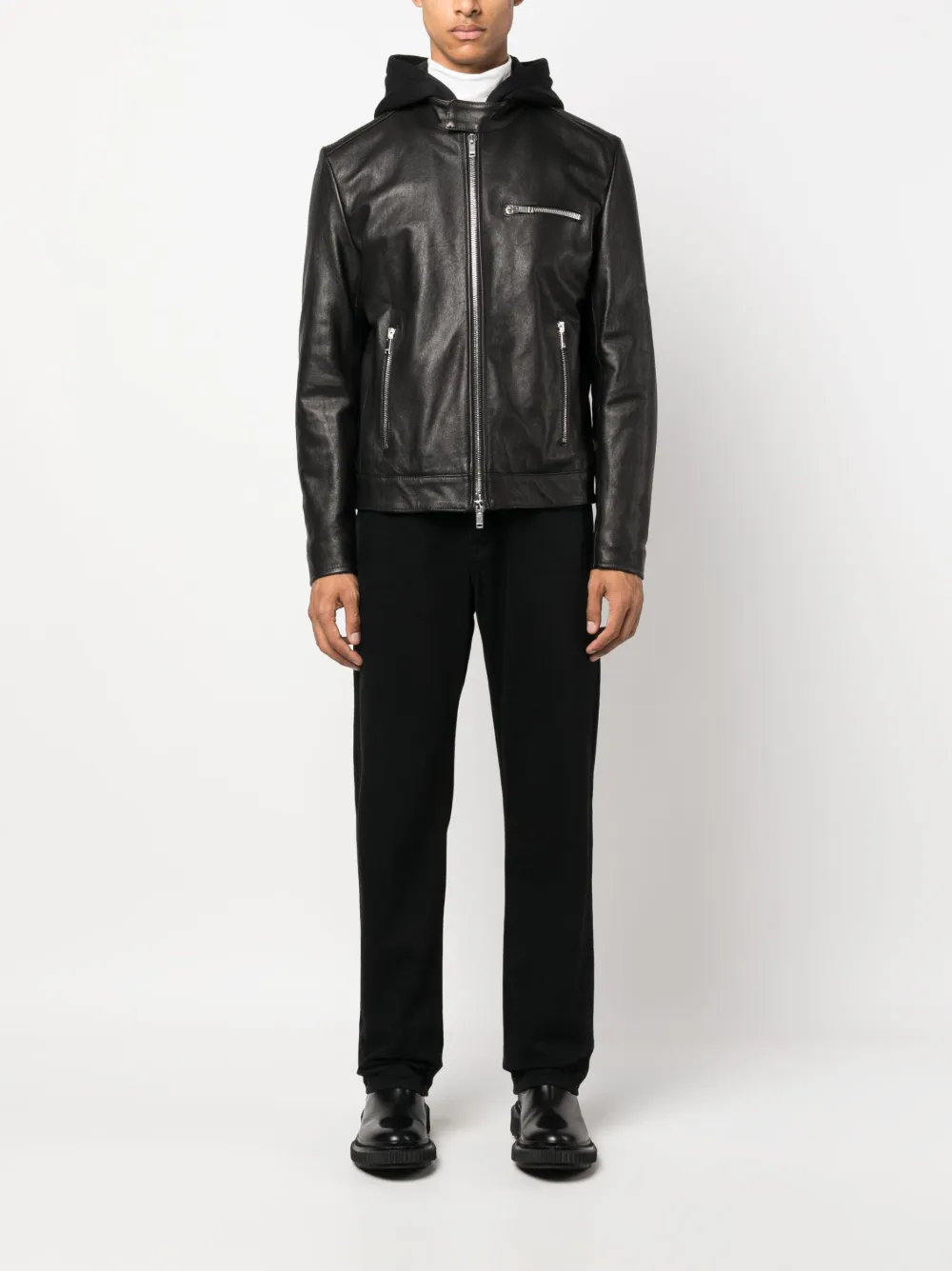 Черный, овечья кожа, воротник-стойка, классический капюшон, застежка на молнии спереди, два нагрудных кармана на молнии, два кармана на молнии по бокам, длинные рукава, манжеты на молнии и прямой подол.