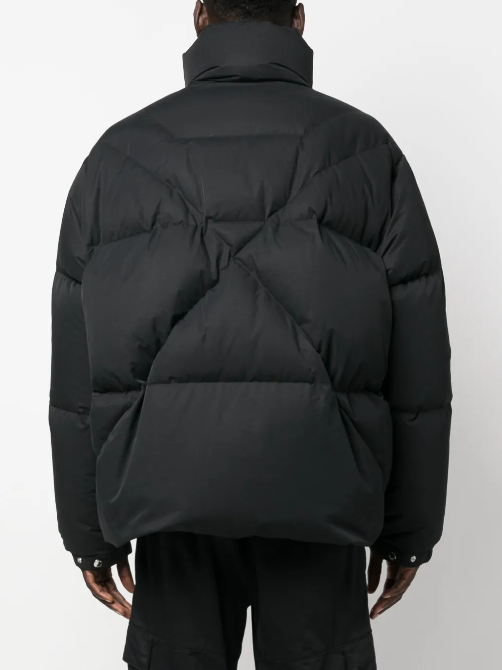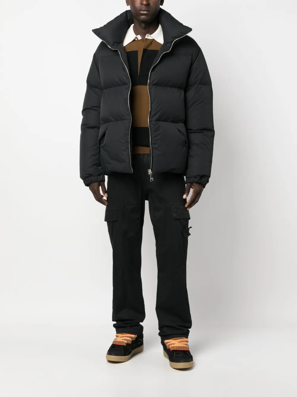 Черный, смесовый хлопок, утиный пух, наполнитель из пуха и перьев, дутый материал, стеганая модель, матовое покрытие, принт с логотипом на груди, воротник-стойка, застежка на молнии спереди, два боковых кармана с застежкой на кнопки, длинные рукава, манжеты на пуговицах, внутренний карман на молнии и подкладка с логотипами.