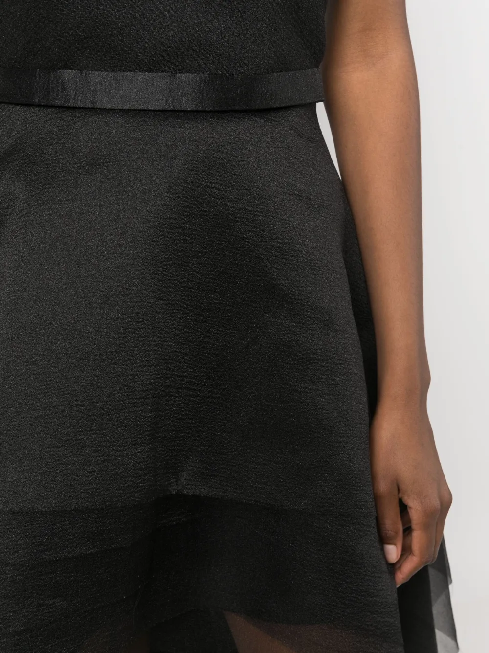 Черный, органза, многослойный дизайн, цветочная аппликация, вставки с оборками и асимметричный подол.